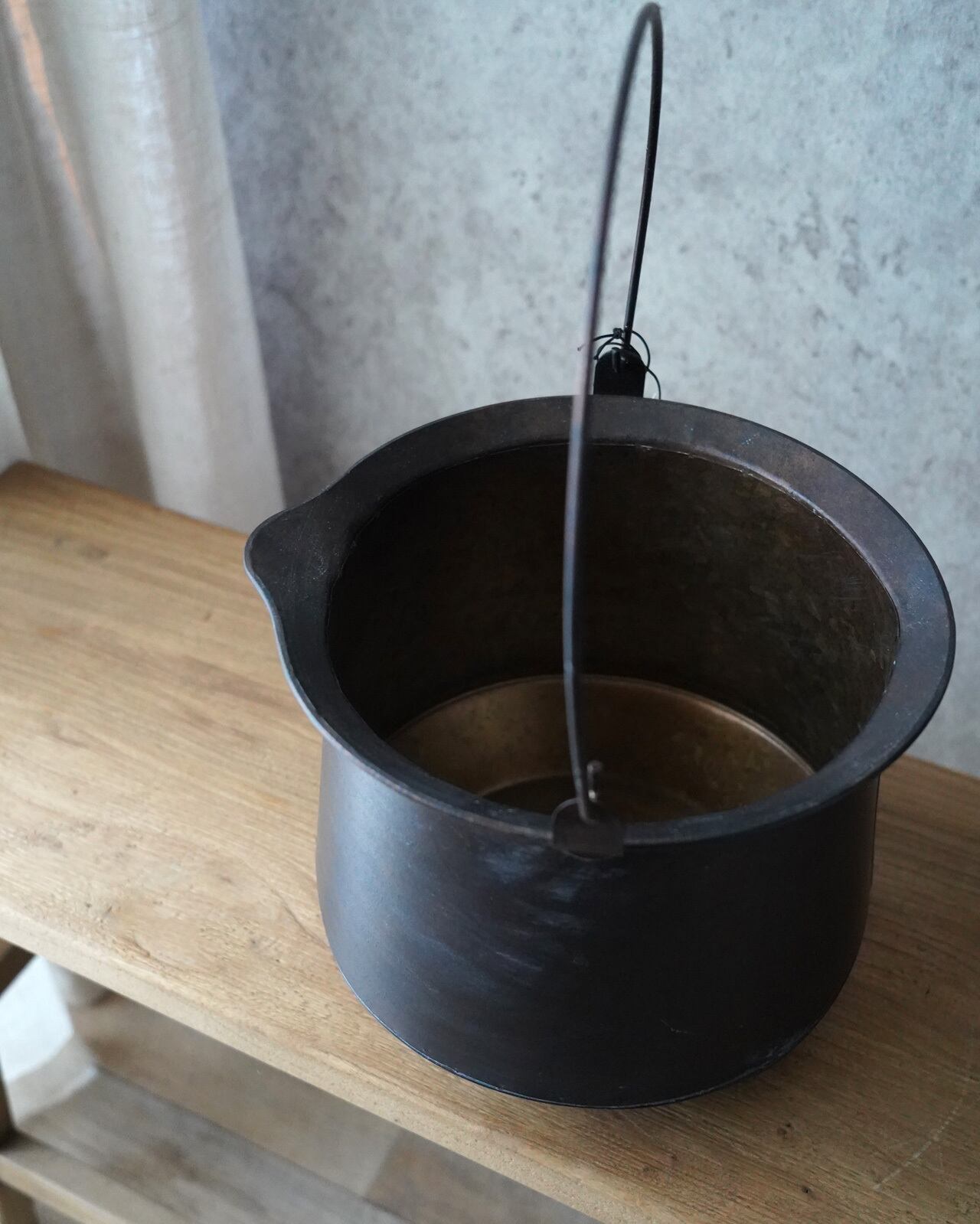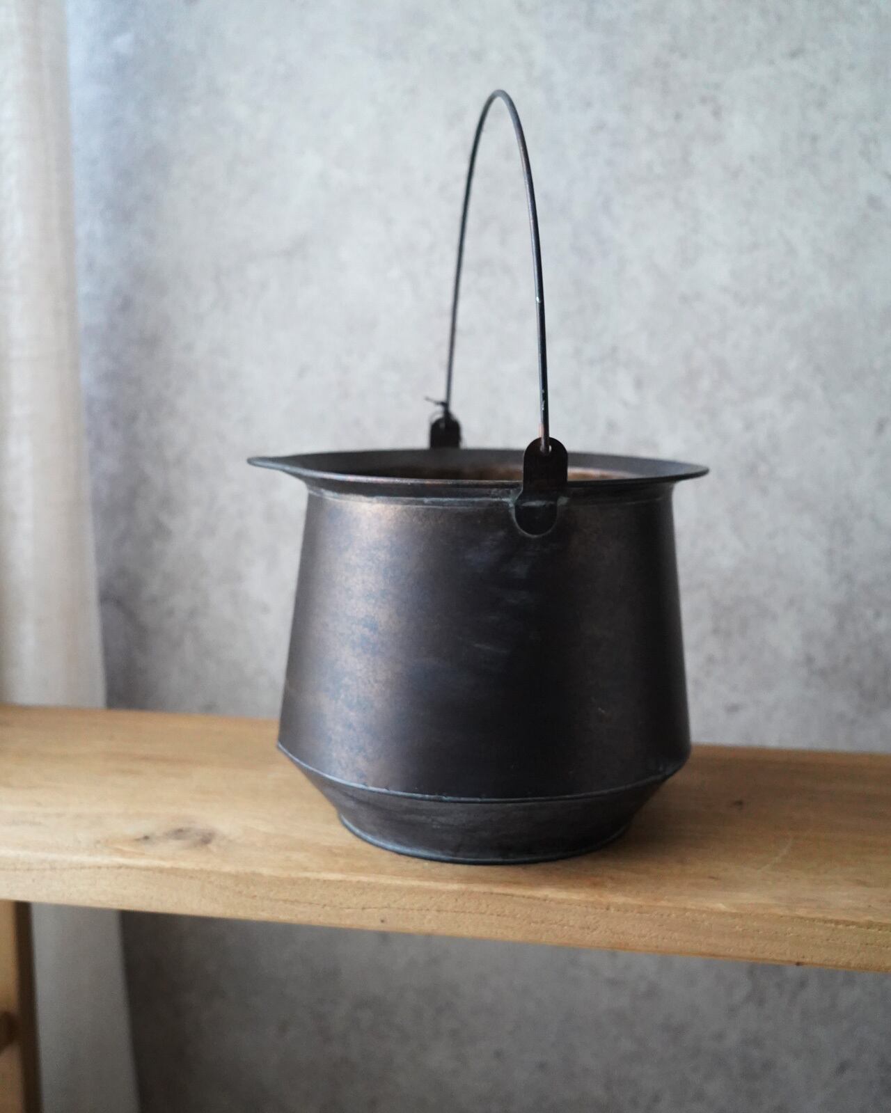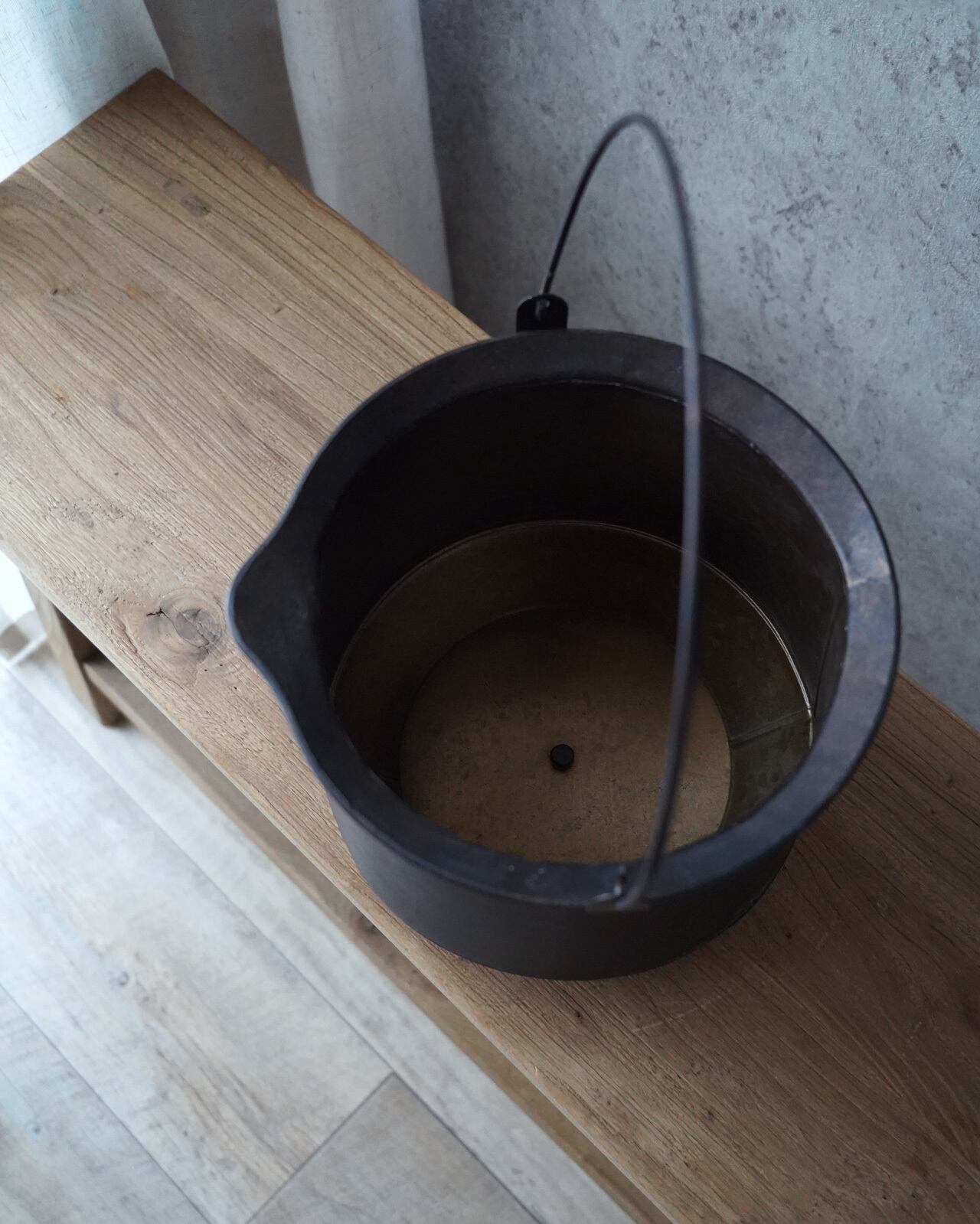 引き締まった焦げ茶色の加工が美しい、ブリキの植木鉢です。