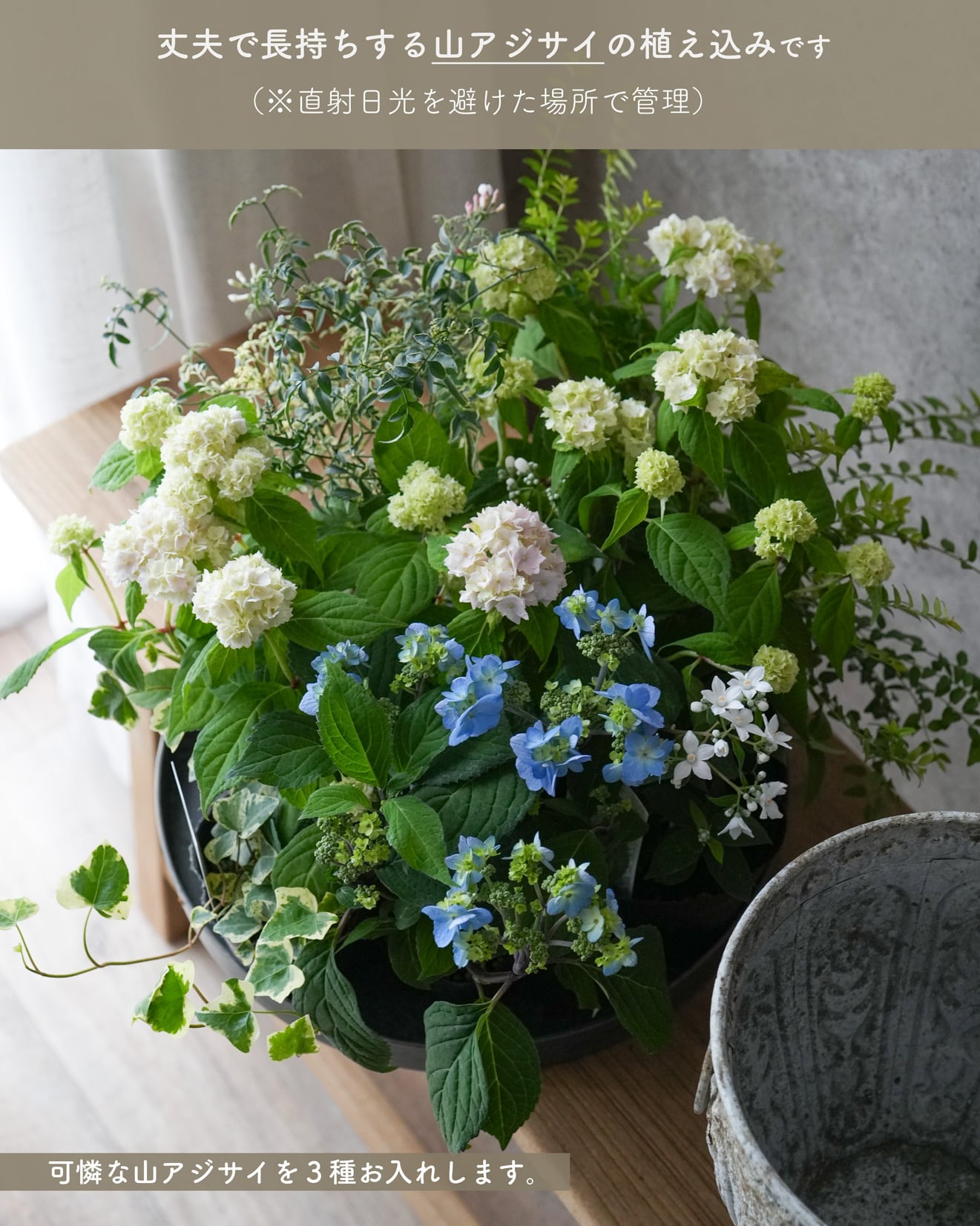 小ぶりの山アジサイを3種類お入れした植え込み。
