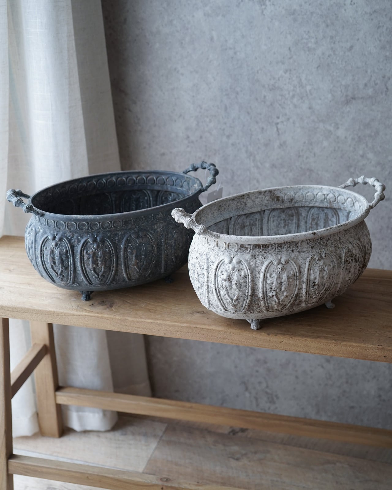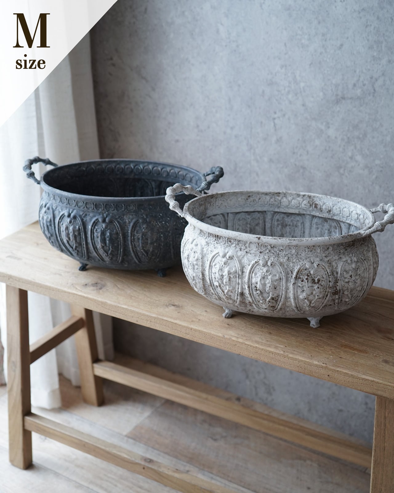 ブリキにアンティークライクなシャビー加工がしてある植木鉢。楕円形。