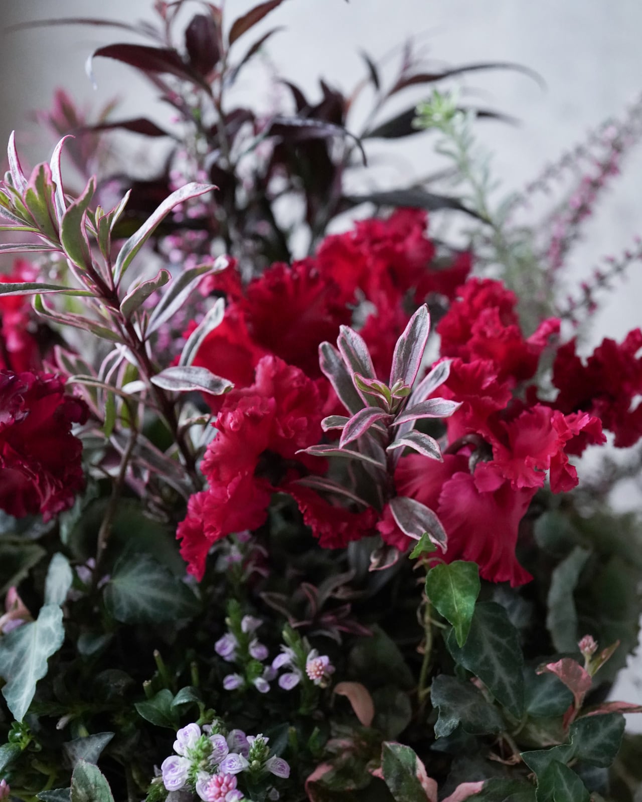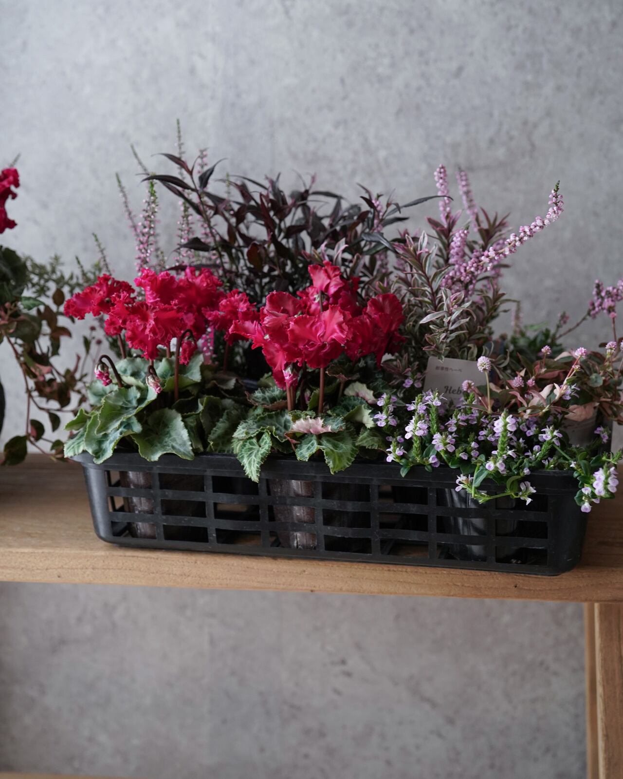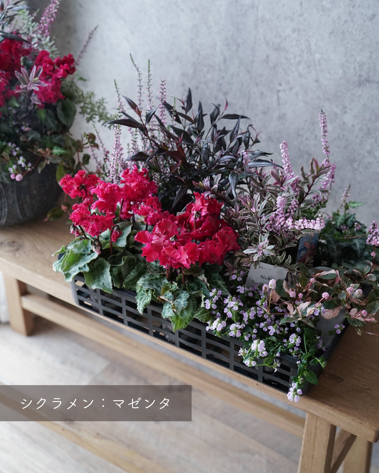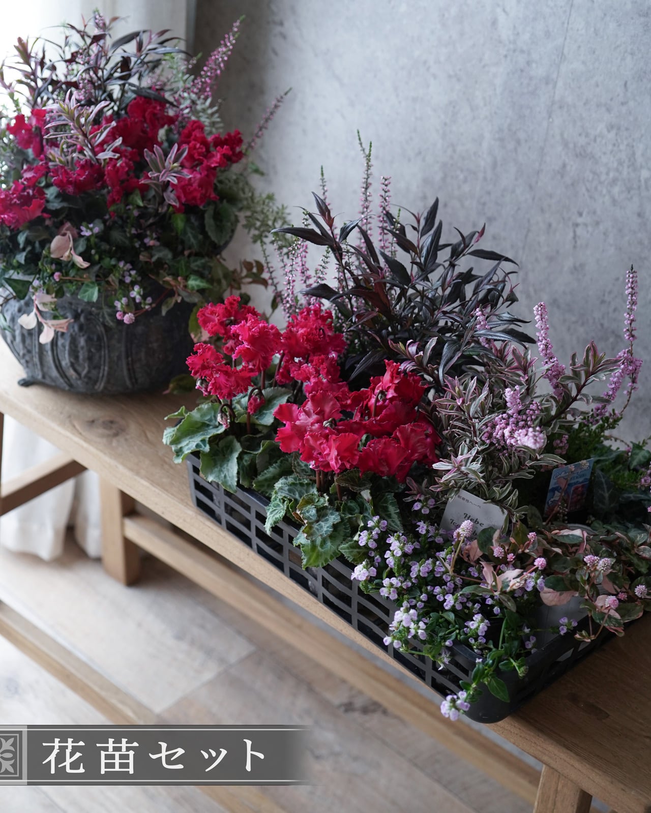 寒さに比較的強いフリンジのミニシクと、シックなピンク〜ダーク系のリーフを合わせた苗セット。