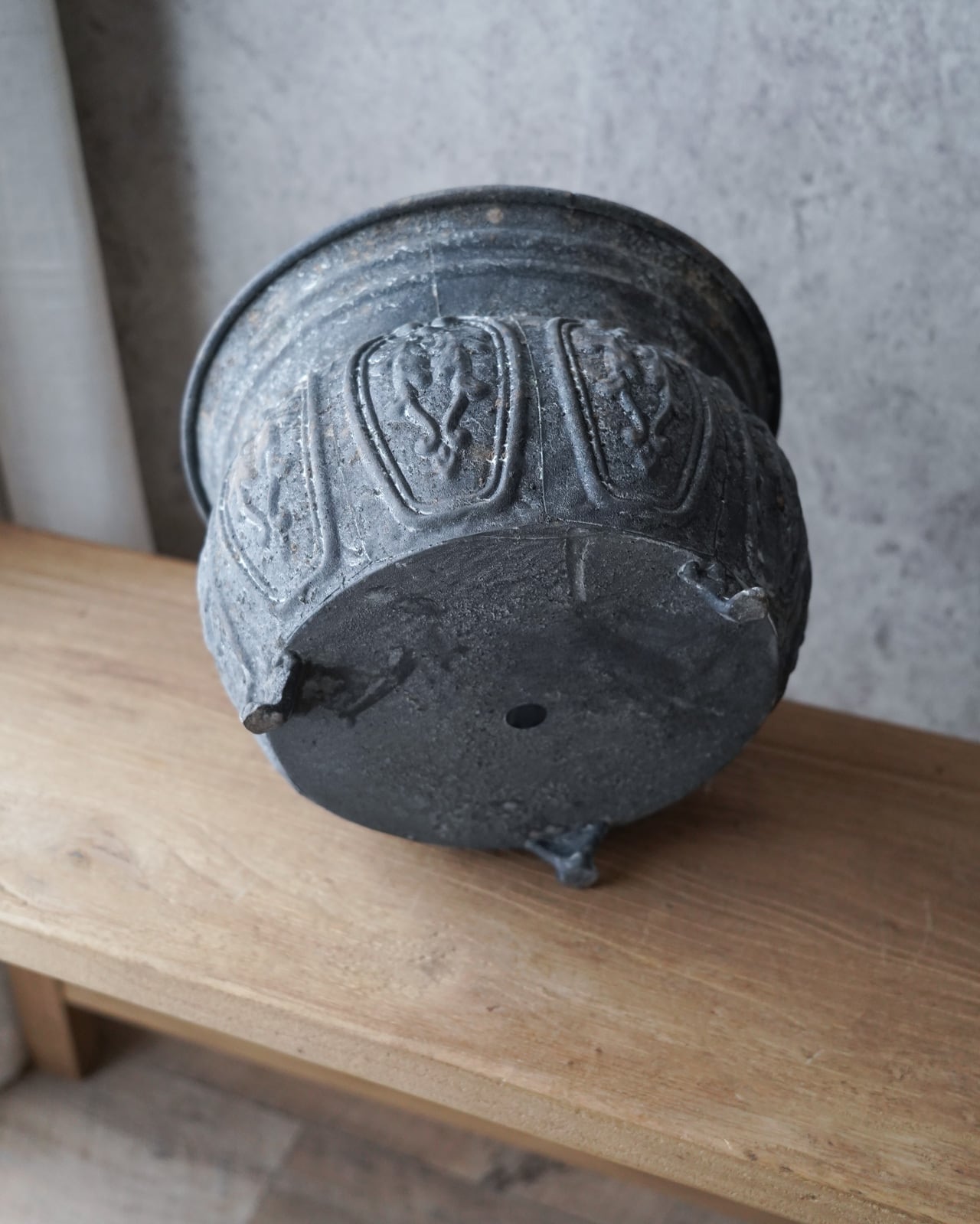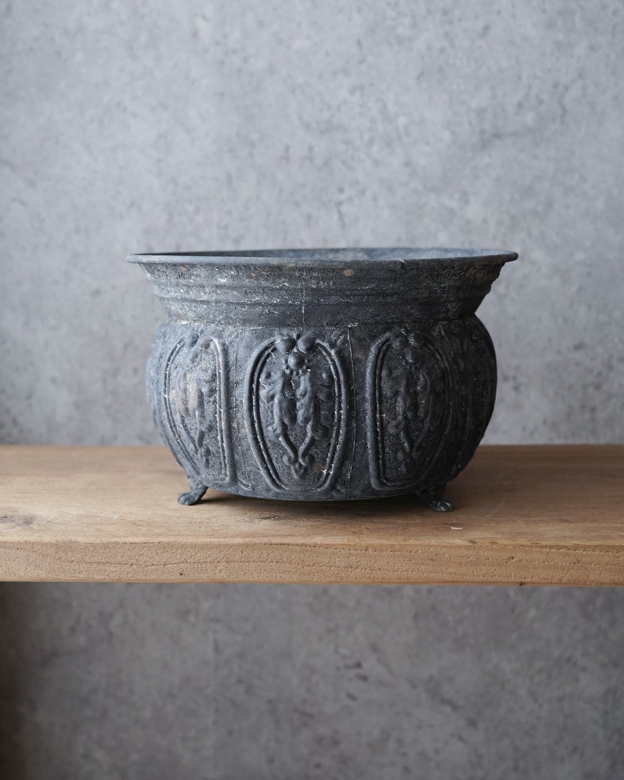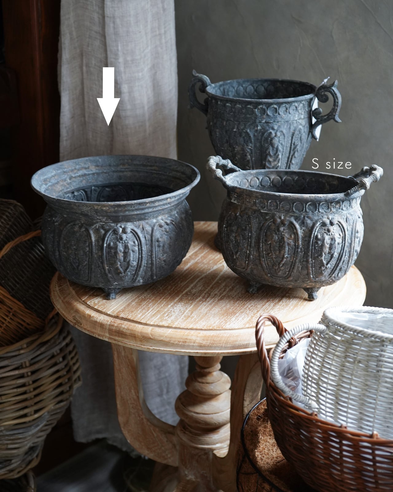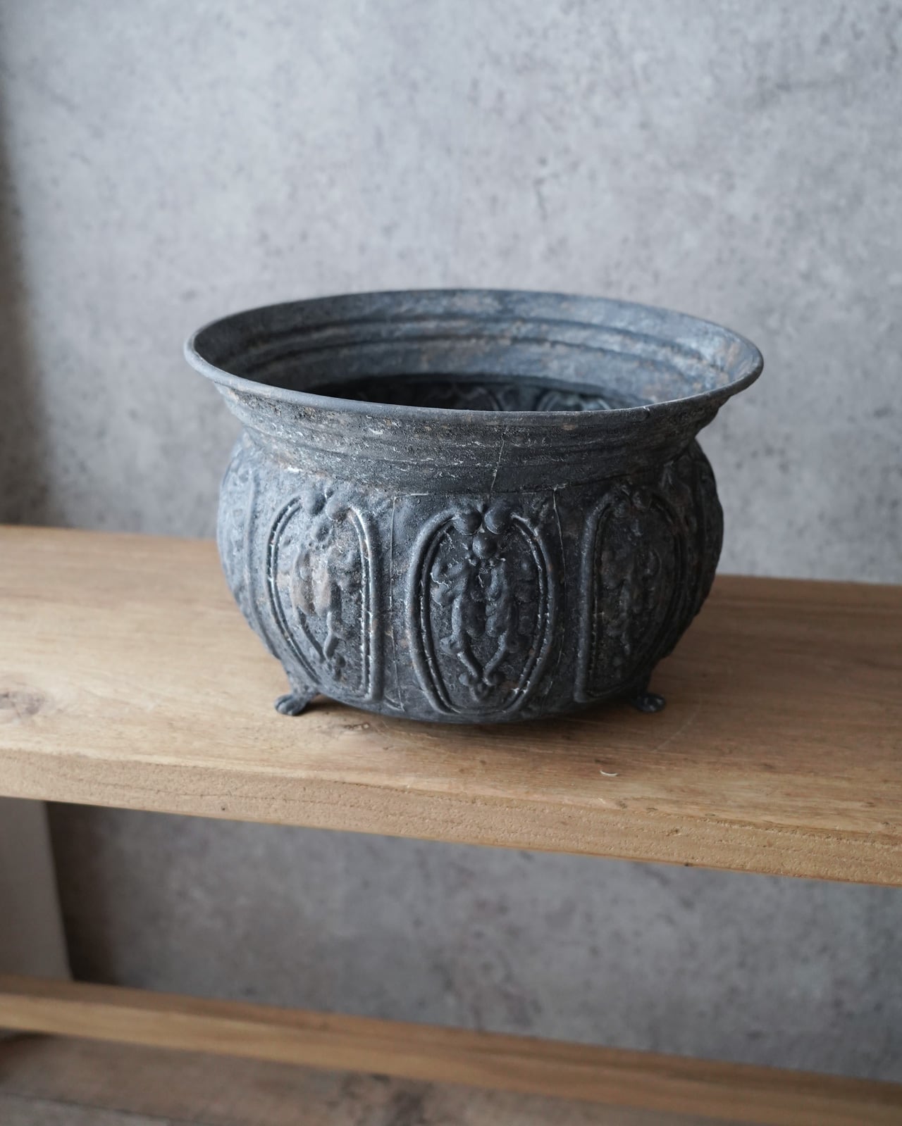 ブリキにアンティークライクなシャビー加工がしてある植木鉢。円形。