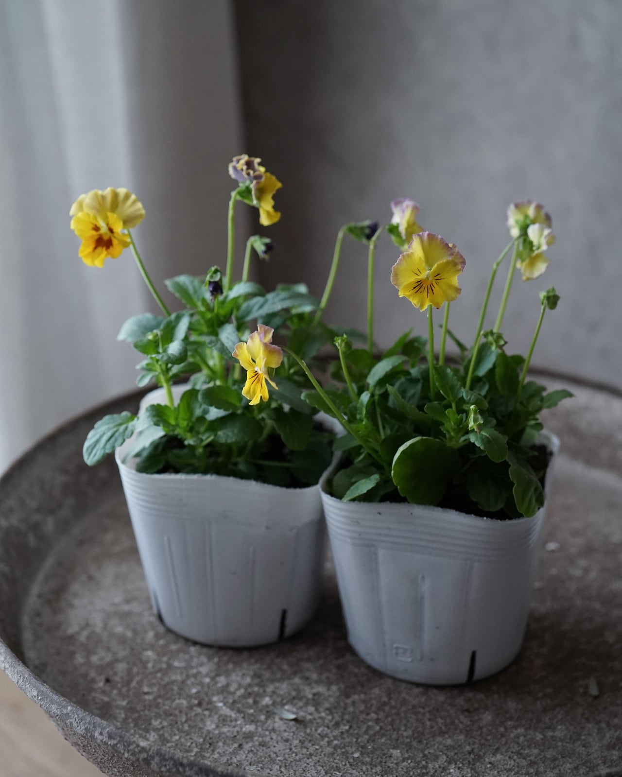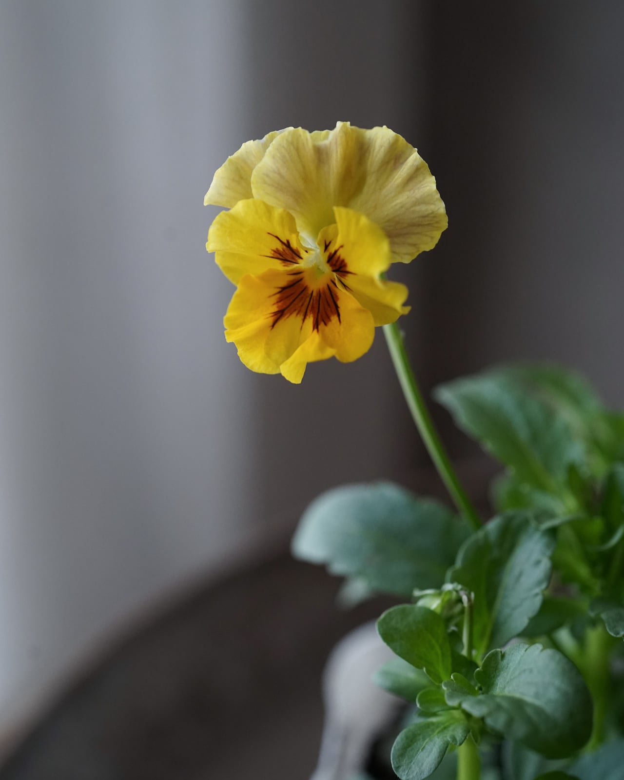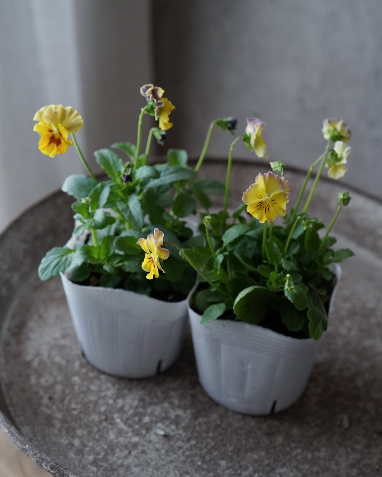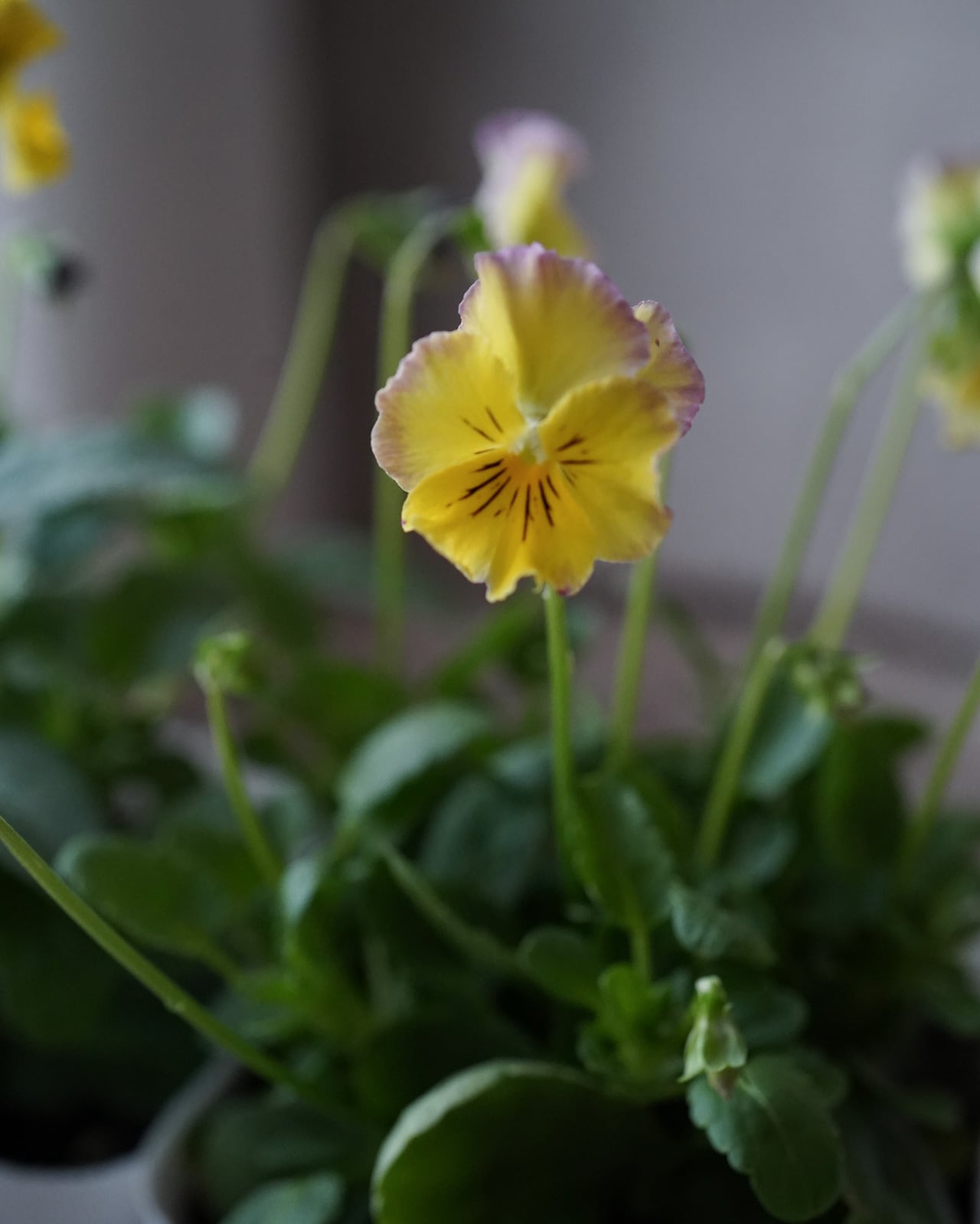 黄色の花弁にほんのり紫系の色が混じる、小輪のビオラ。