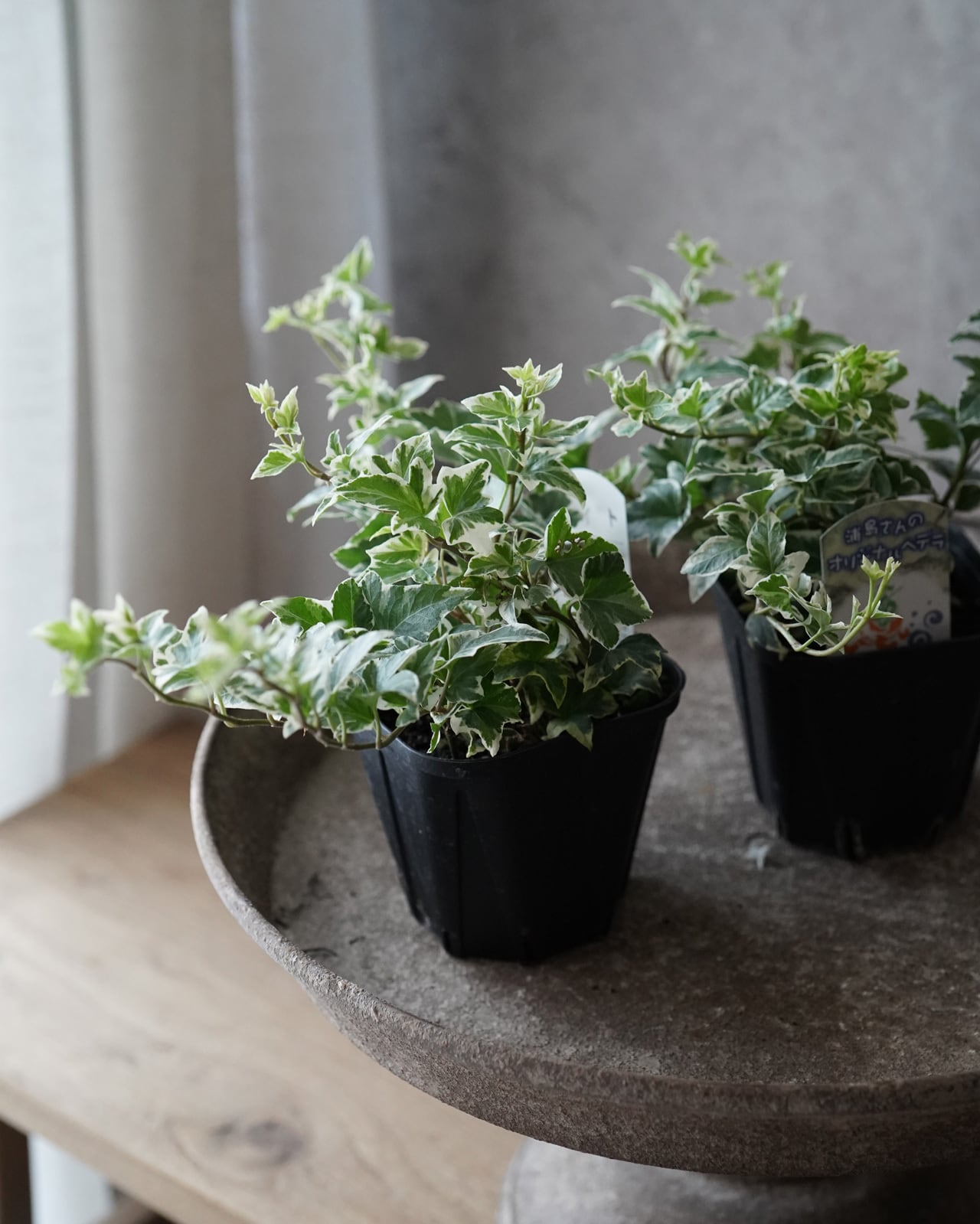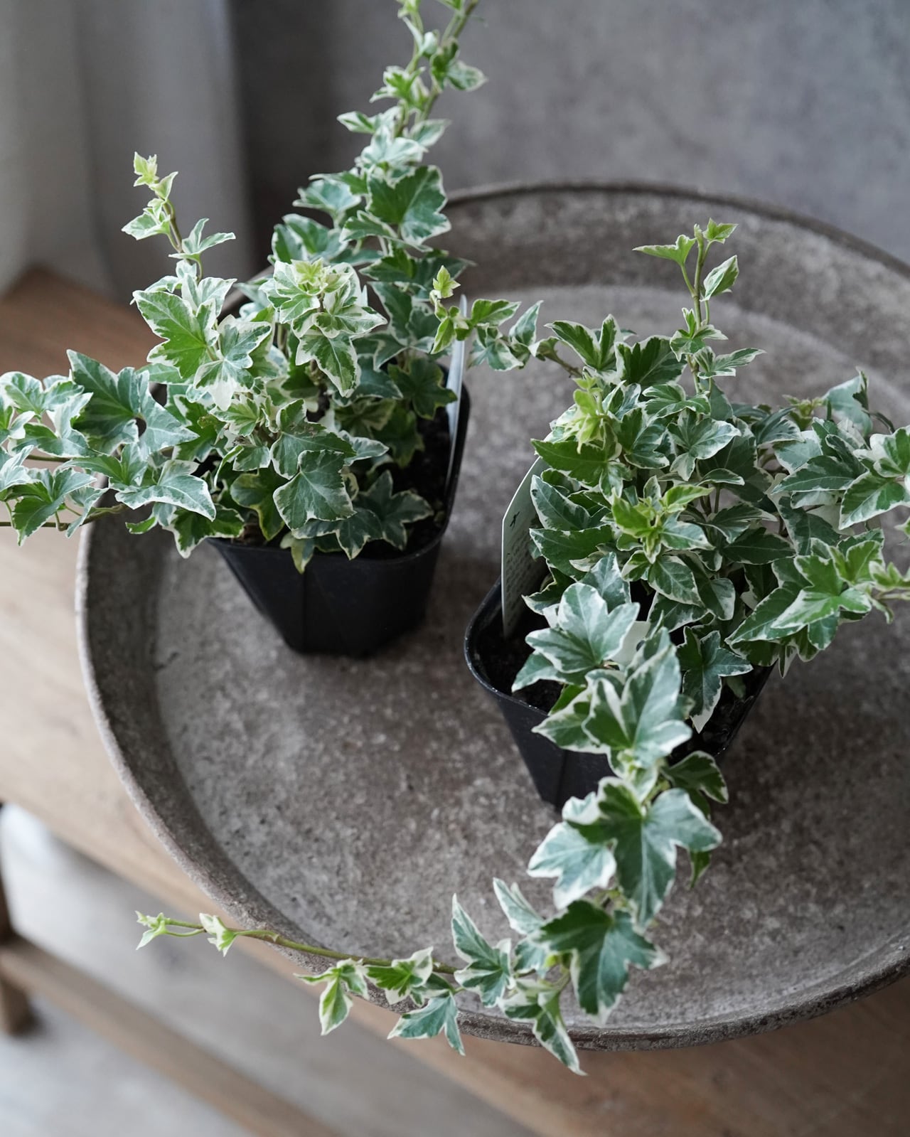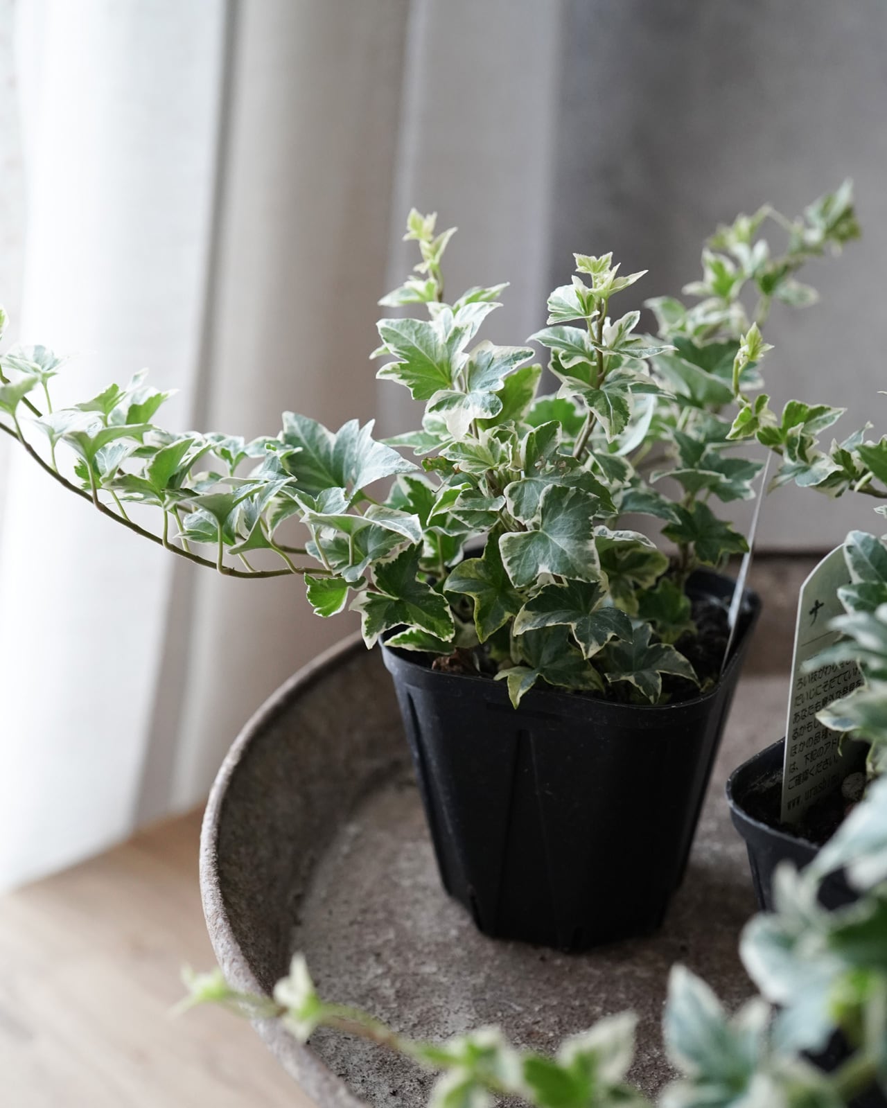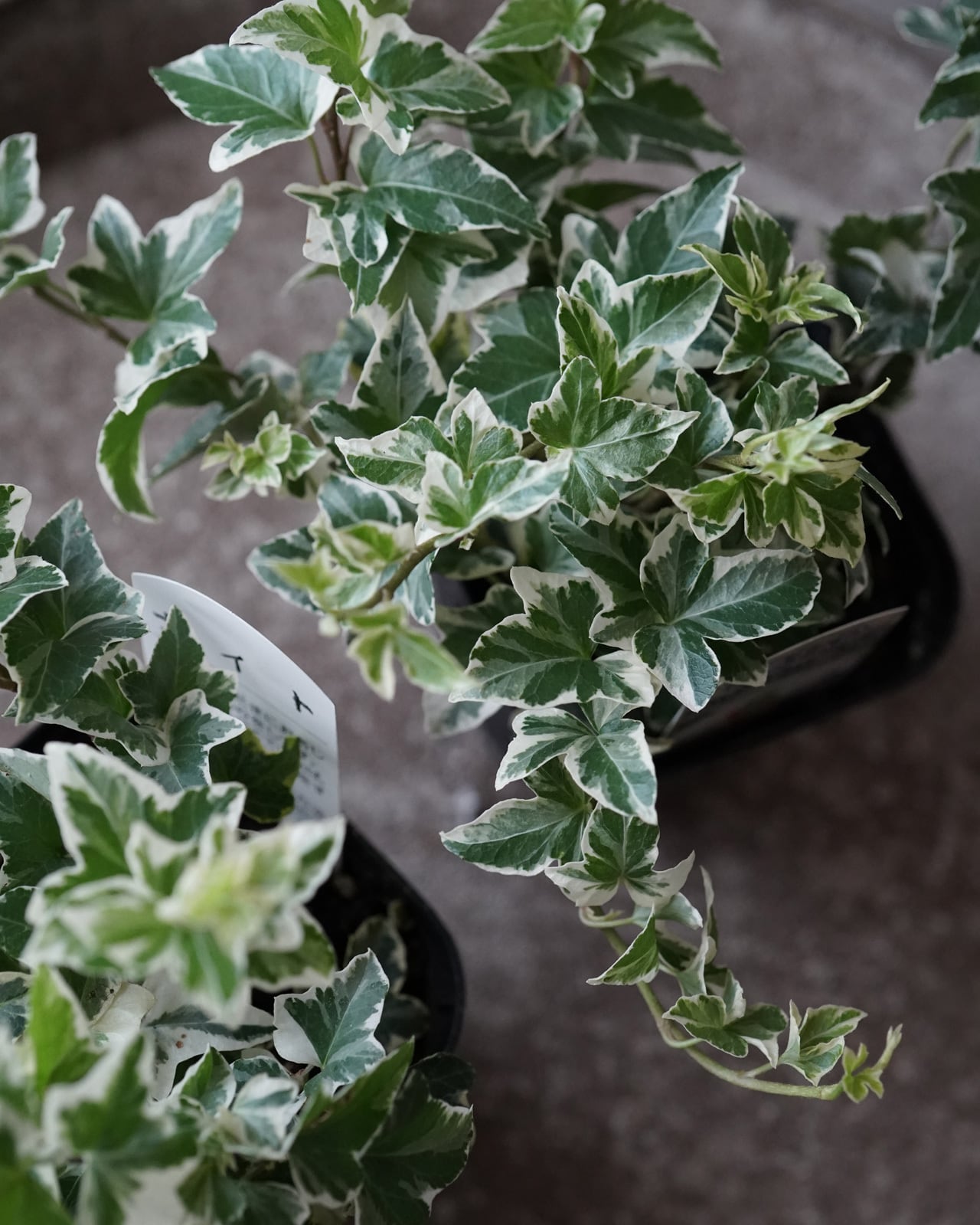 斑入りの白の幅が大きい、少し尖った形状の葉が美しいへデラ。