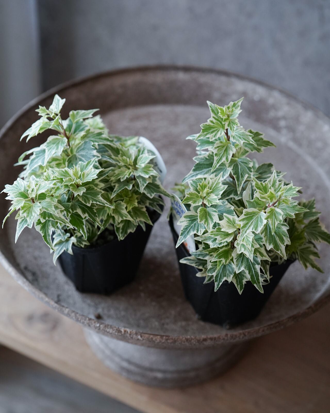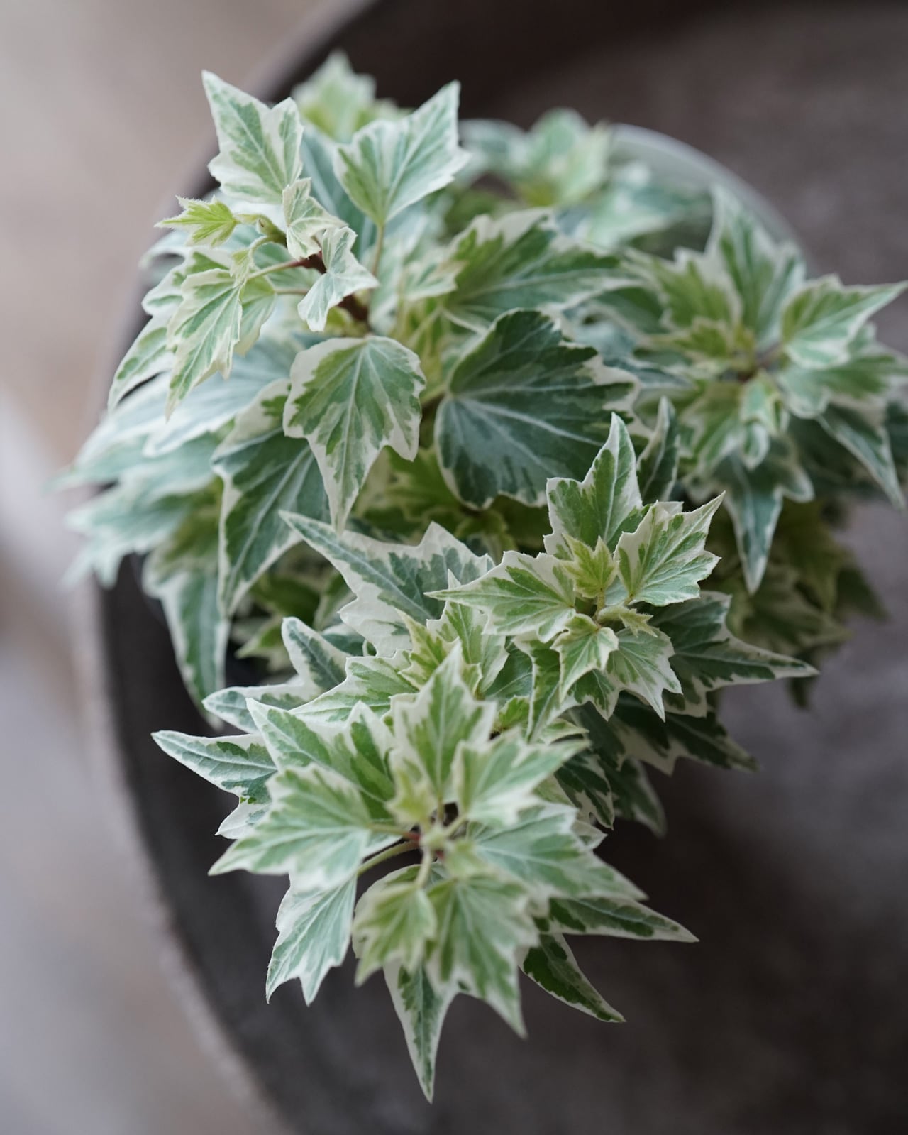 白の斑入い部分が多い、小ぶりの葉が密集しているへデラ。