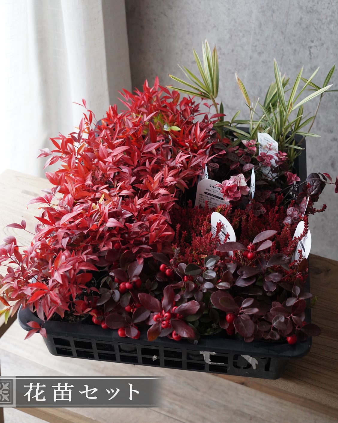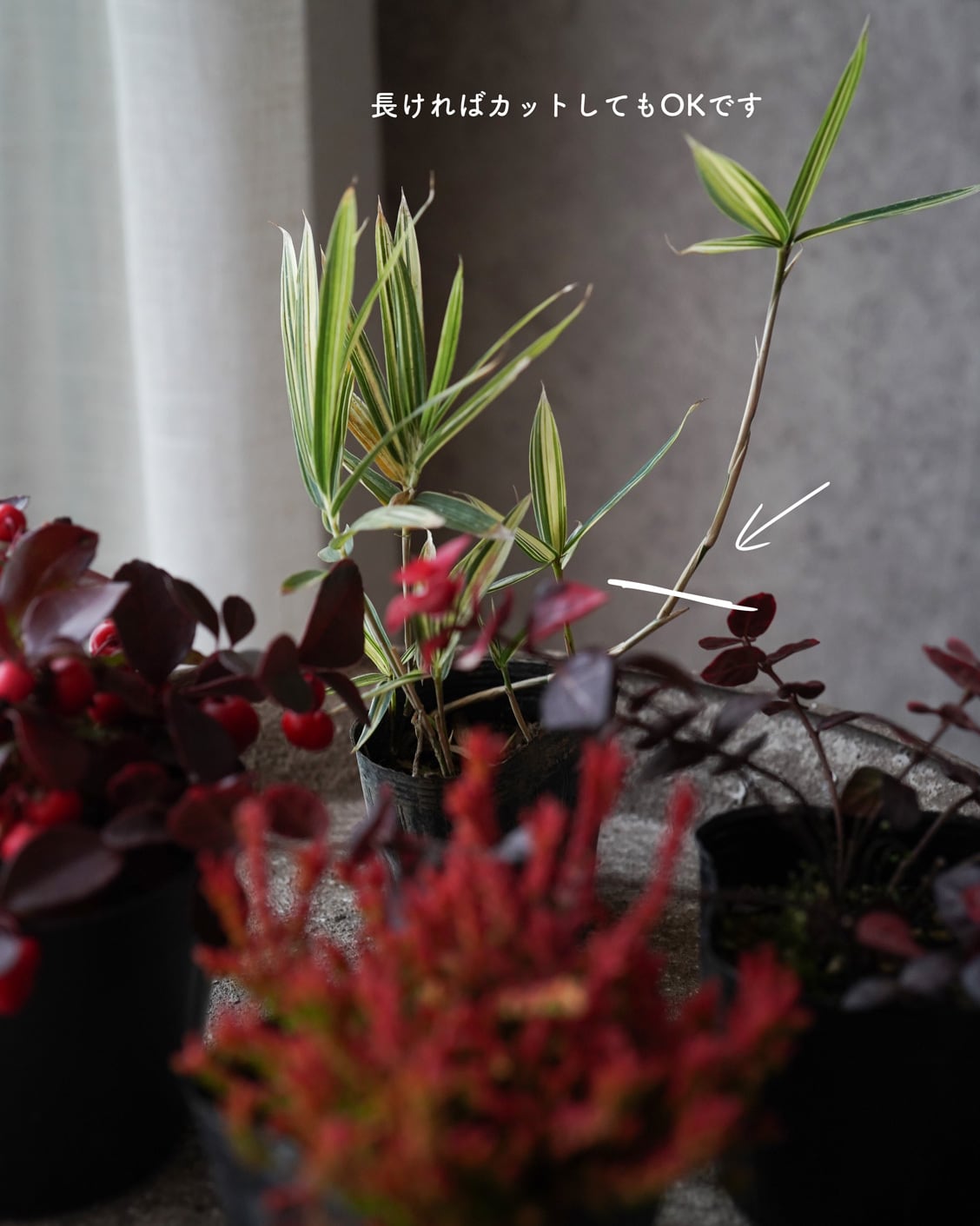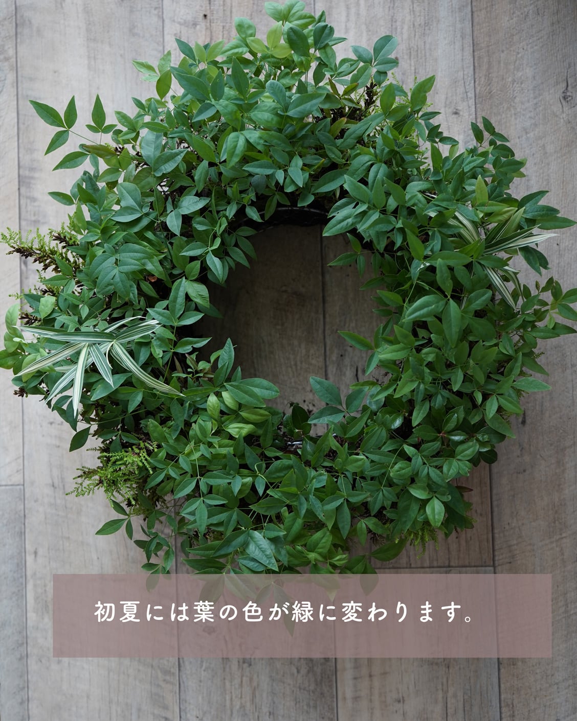 南天をメインに、カルーナとチェッカーベリー、笹を交互に植えるような簡単リースです。
