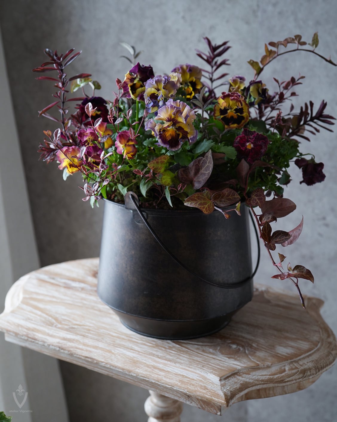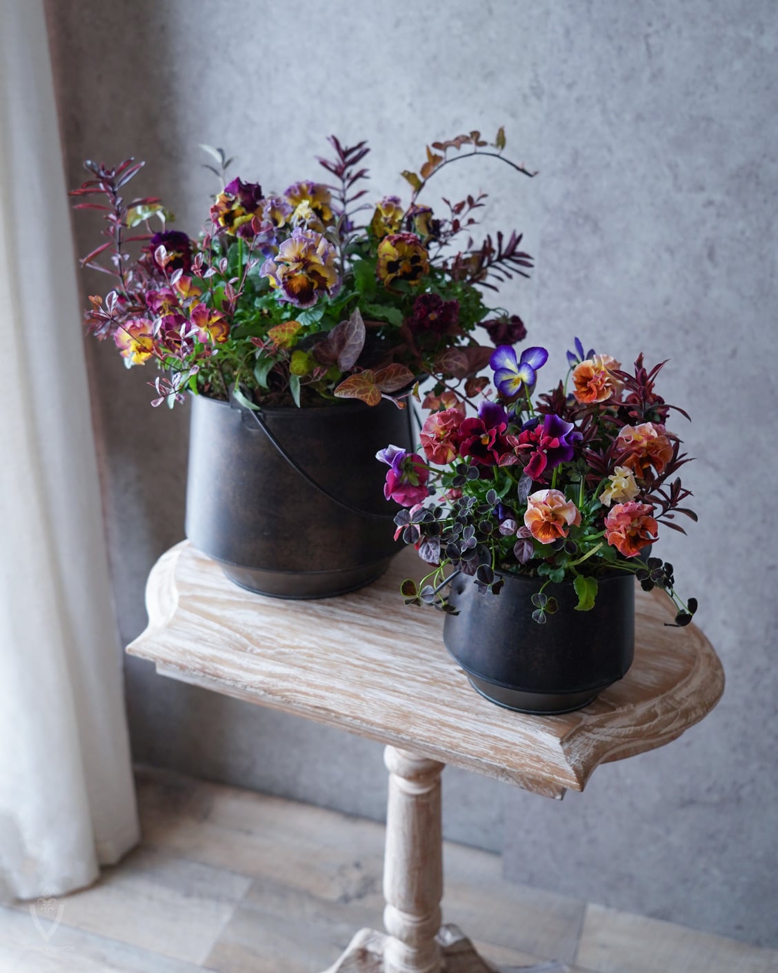 定期的なお水やりさえ忘れなければ長い事このままの姿で愉しめる、ビオラ/パンジーの寄せ植えです。春には一回り大きくなるほど花を咲かせます(※関東より西の地域では屋外管理が可能です)