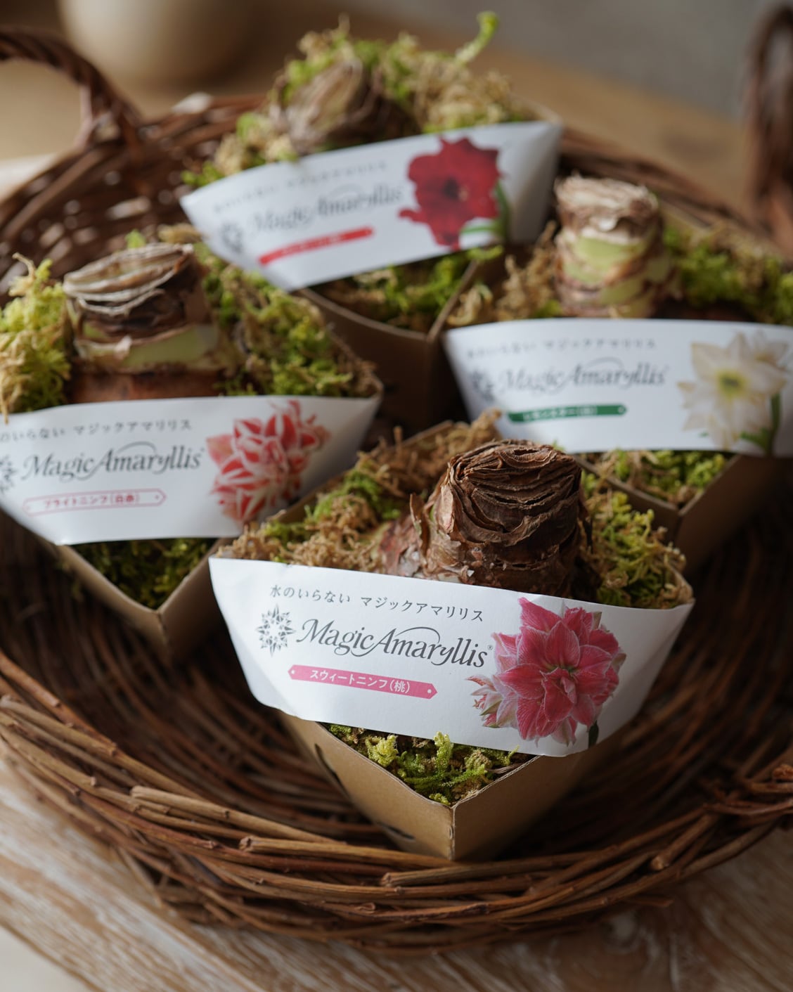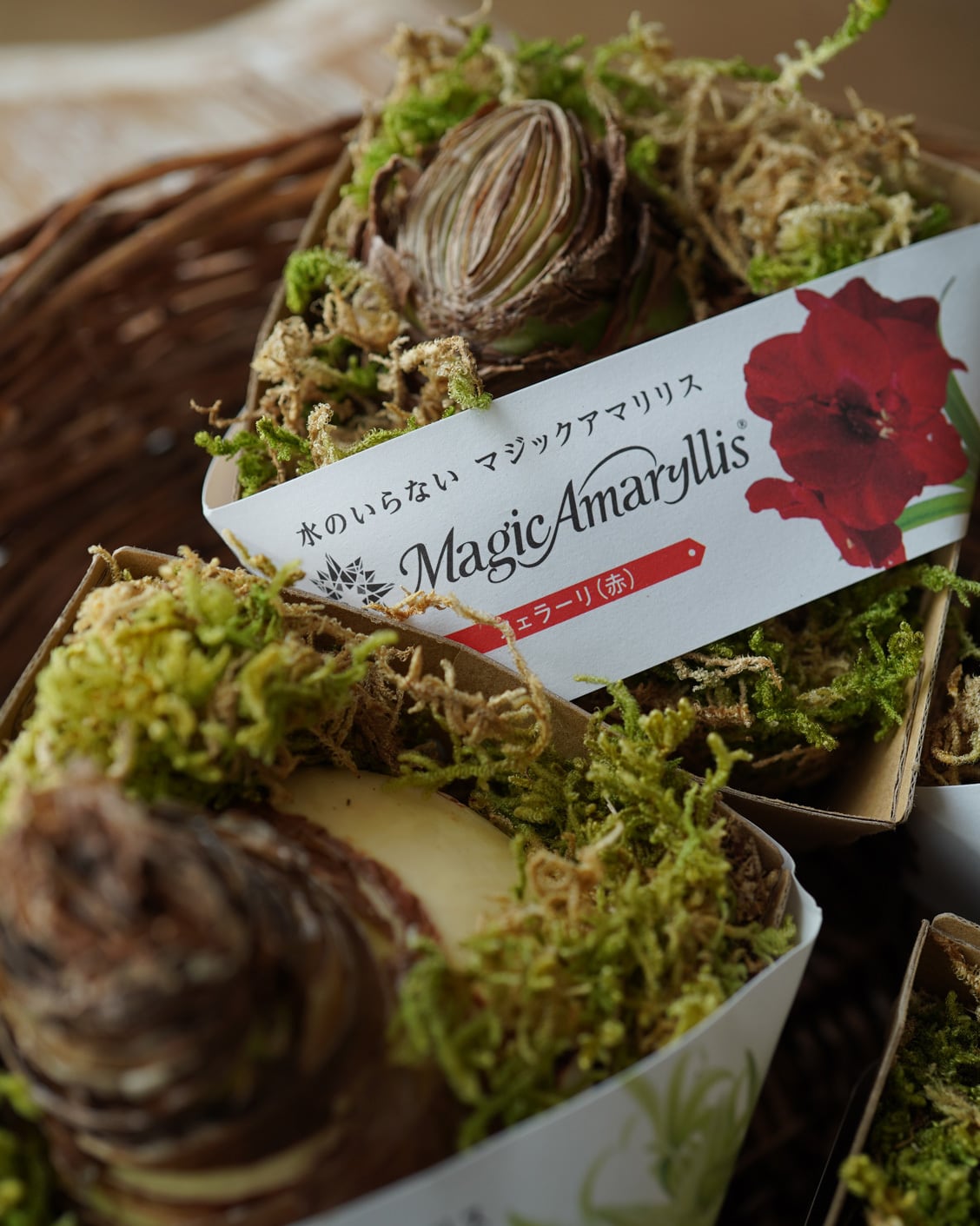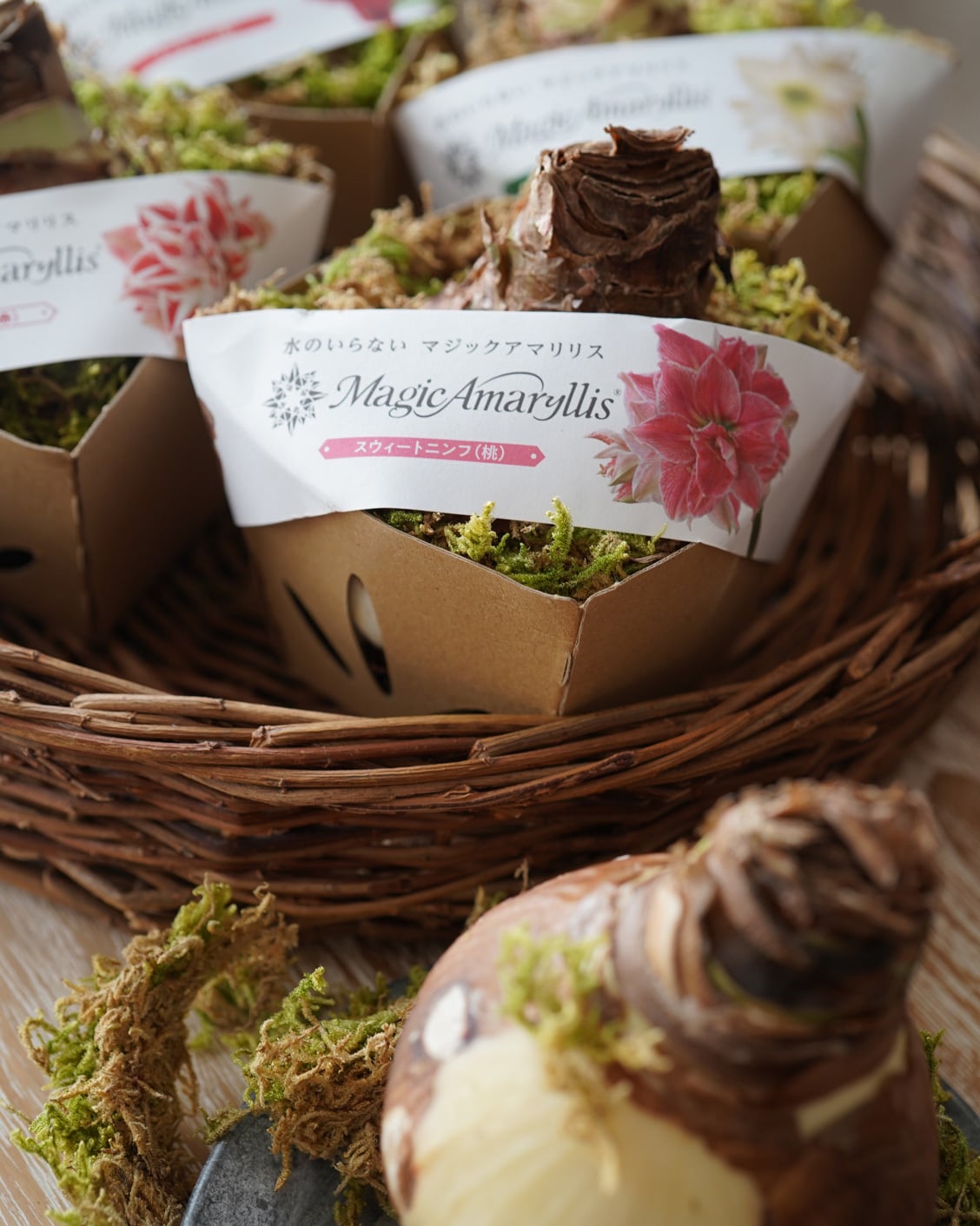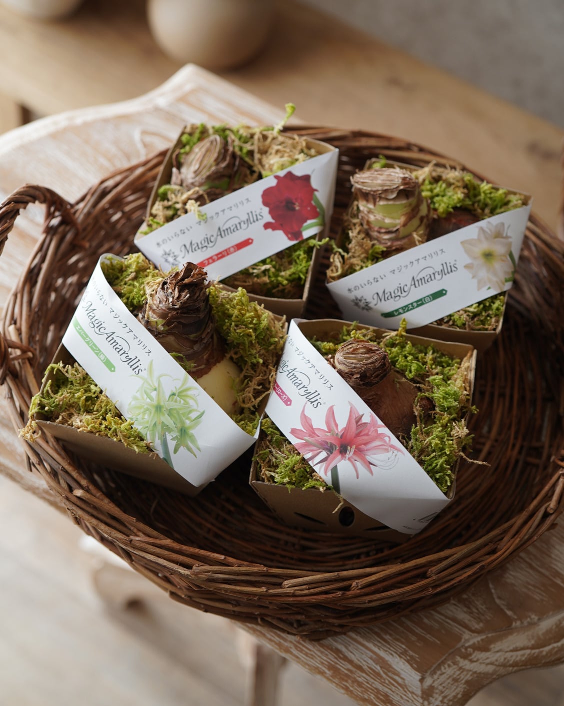 水やりの必要はありません。暖かい室内の明るい窓辺などに置くだけで成長し始め、およそ6~10週間で開花します。栽培環境や球根の個体差により成長は異なります。花芽は2~3本出ます。1本目開花後も、次の花芽を楽しみにお待ちください。花と葉が同時に出ない場合もございます。