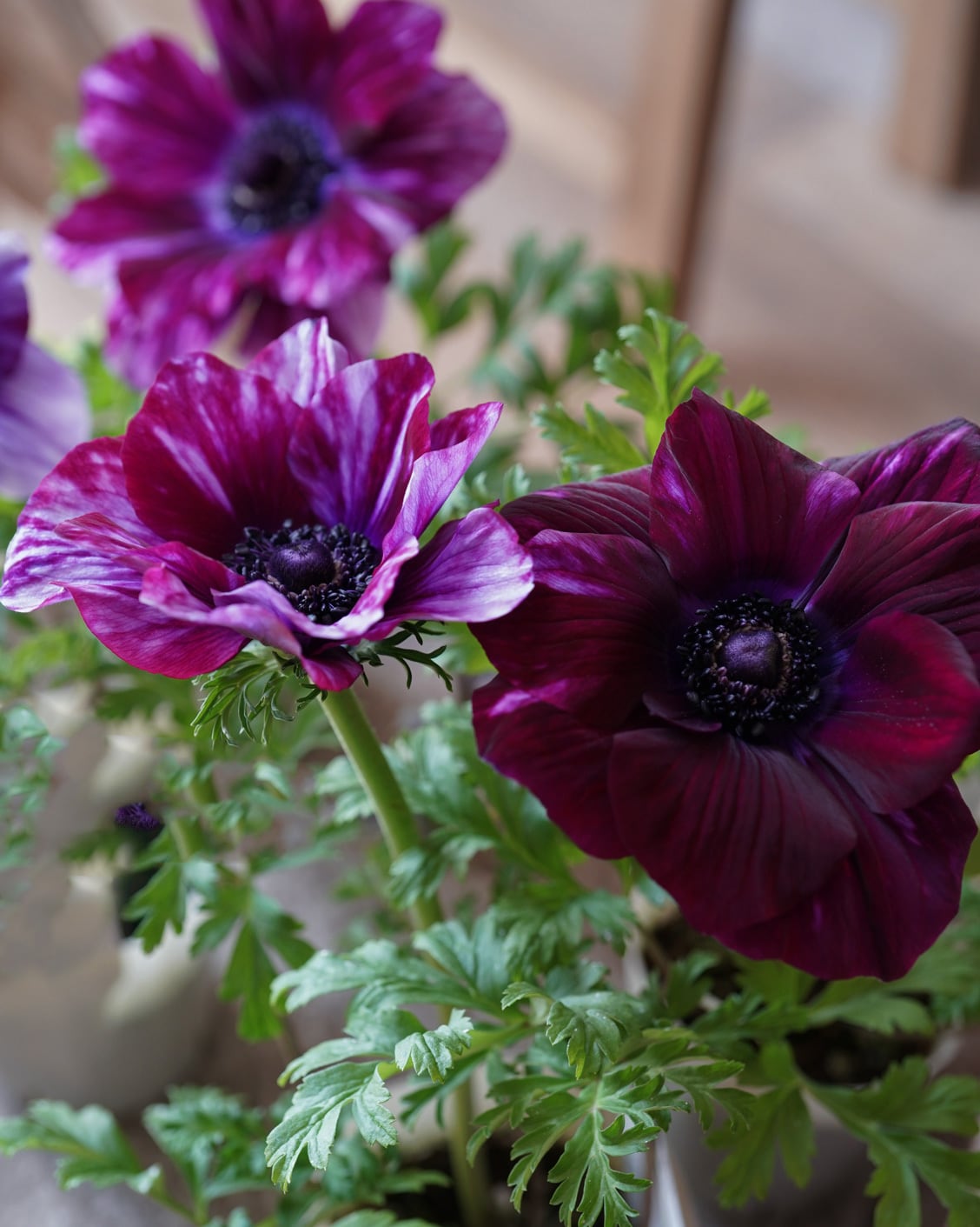 紫〜赤紫の花弁。ストライプ(しぼり)が入る美しい大輪のアネモネ。