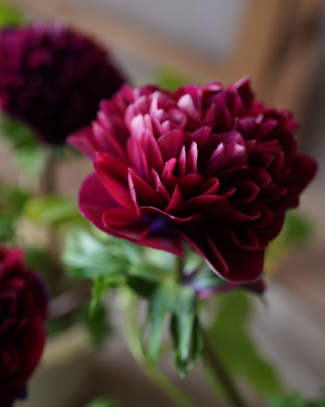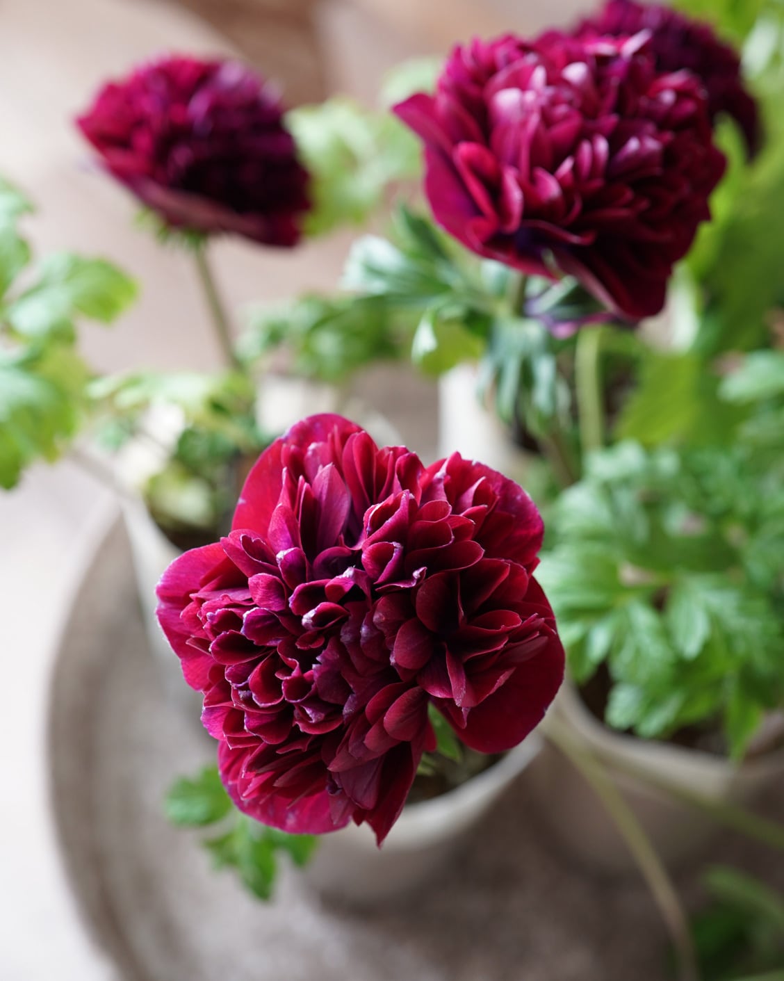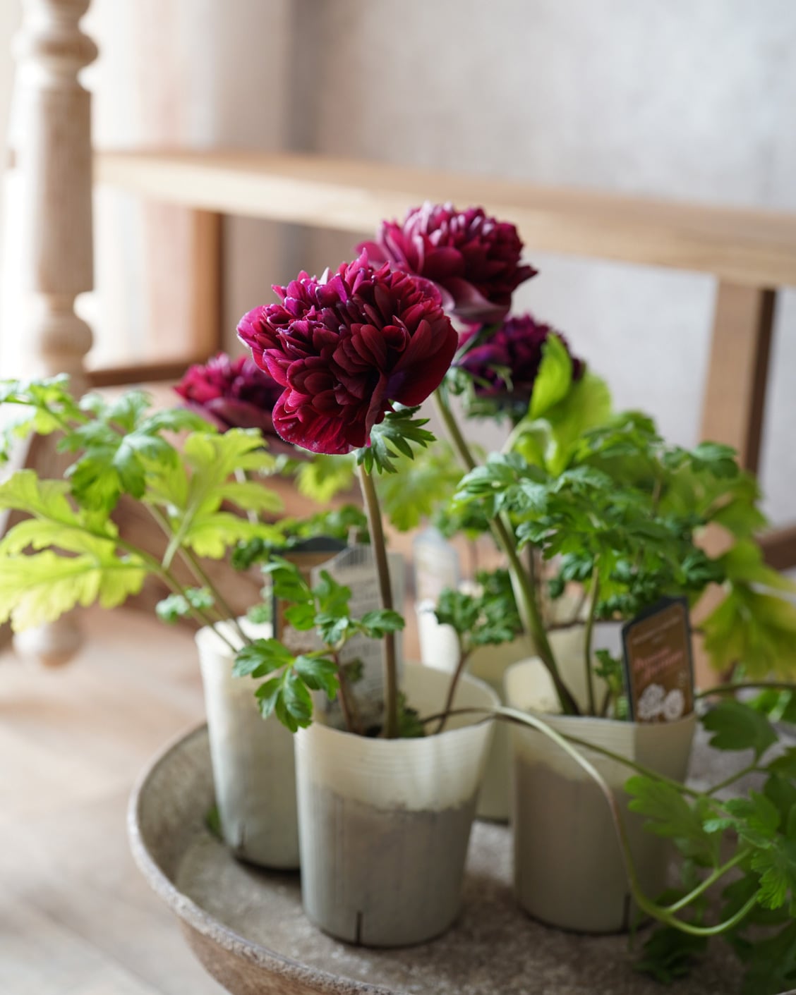 存在感のある大輪のワイン色が美しい、八重咲きのプレミアムアネモネ。充実の2年株。