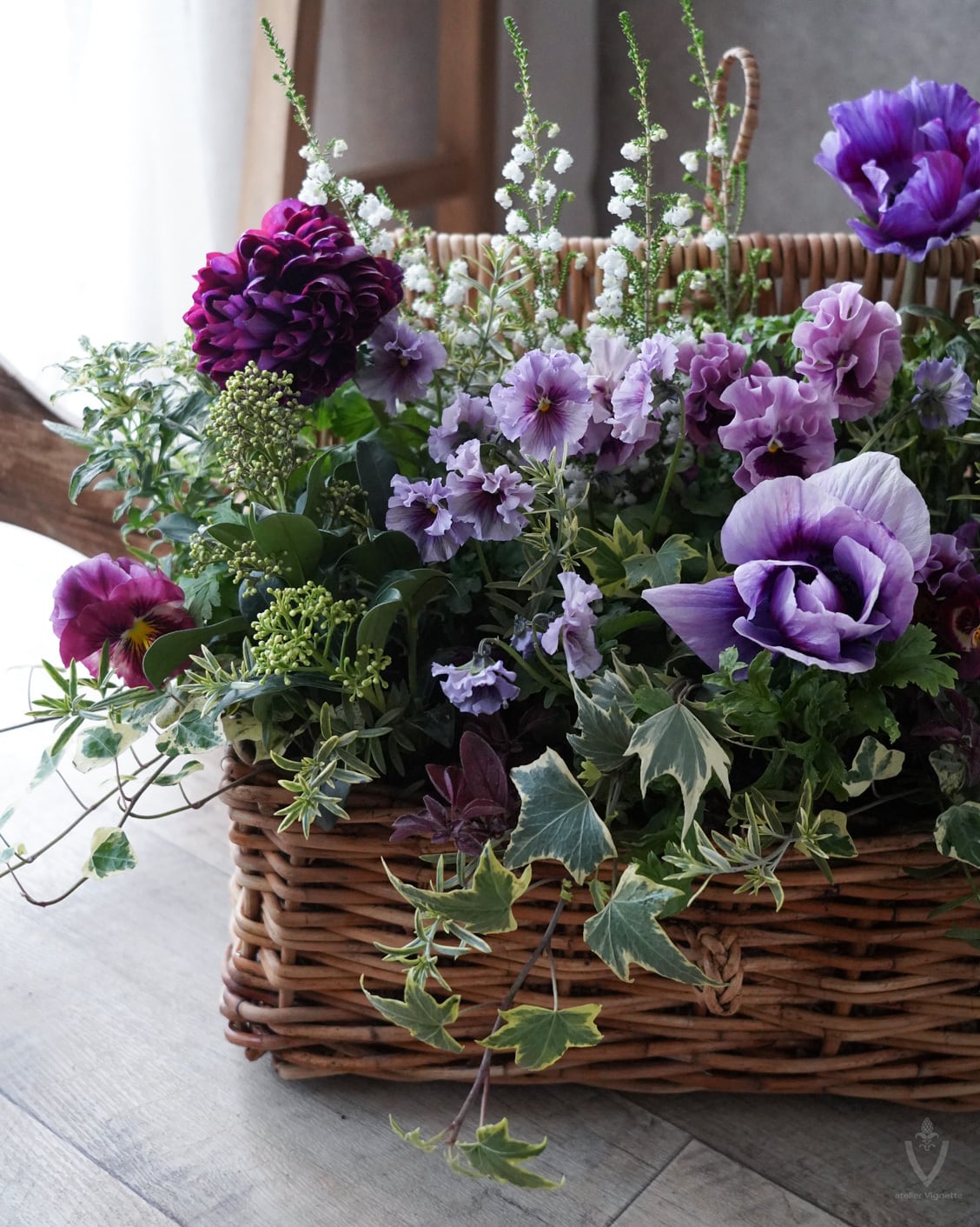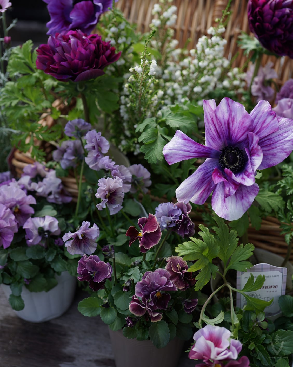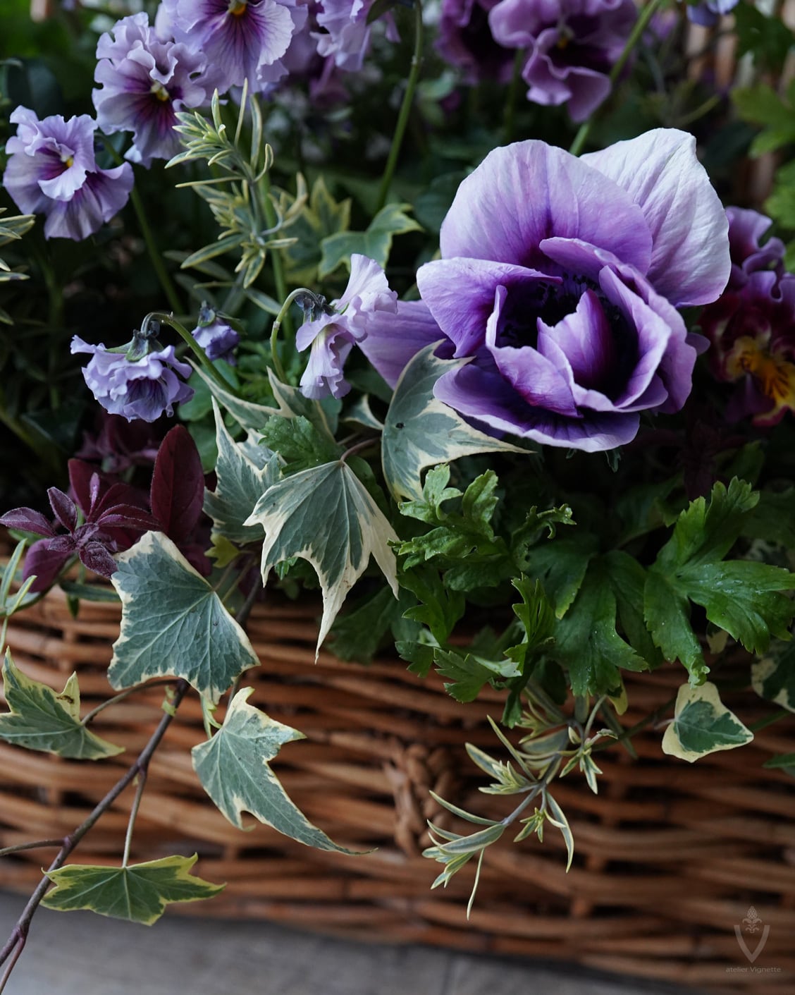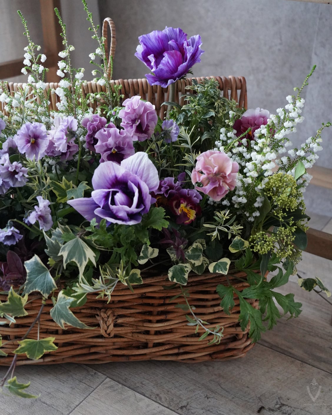 アネモネは日当たりの良い場所で次々開花しますが、お花の途切れ目に寂しくないように、スズランエリカとビオラをあしらっています。