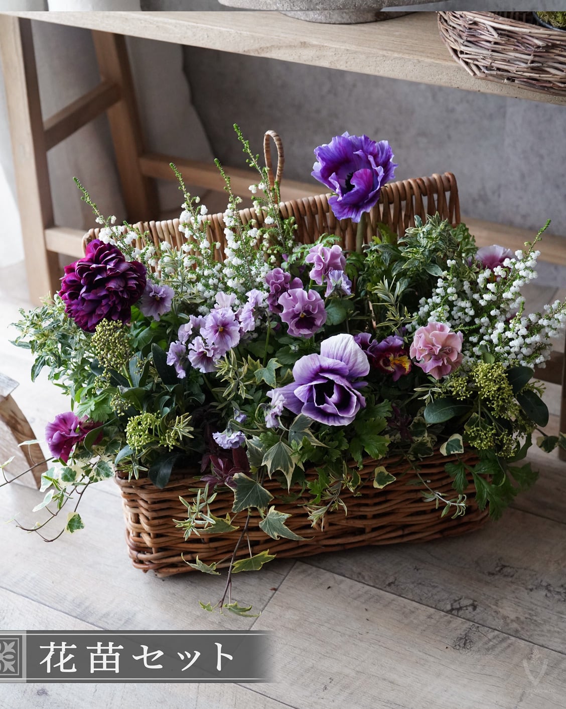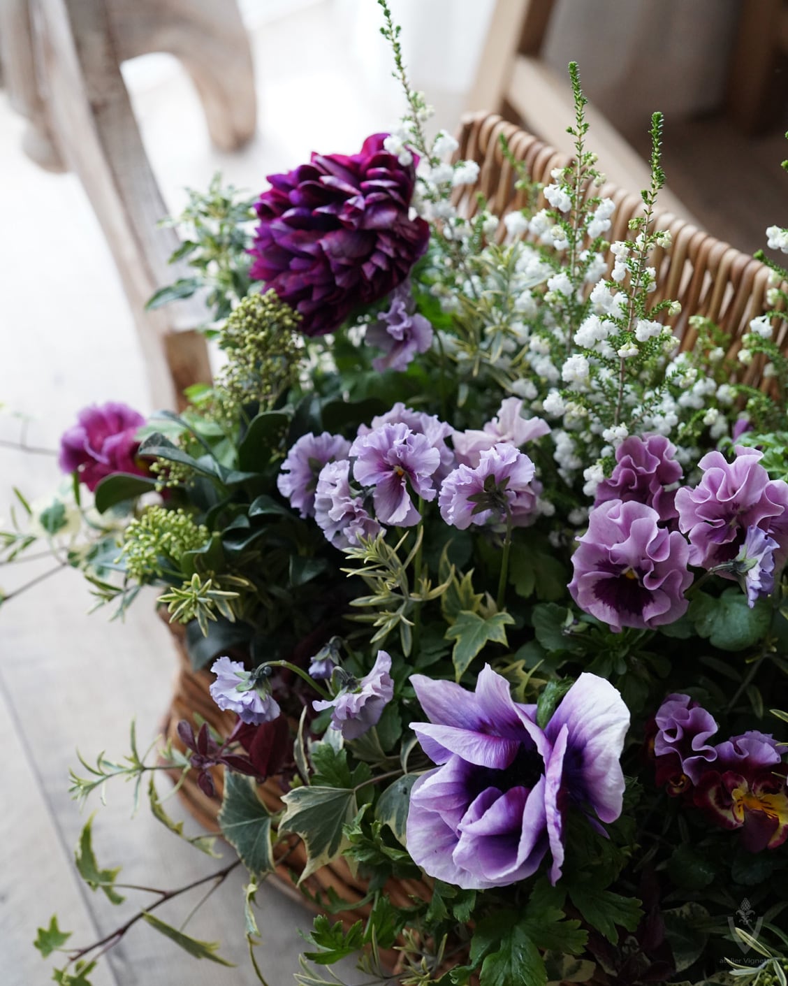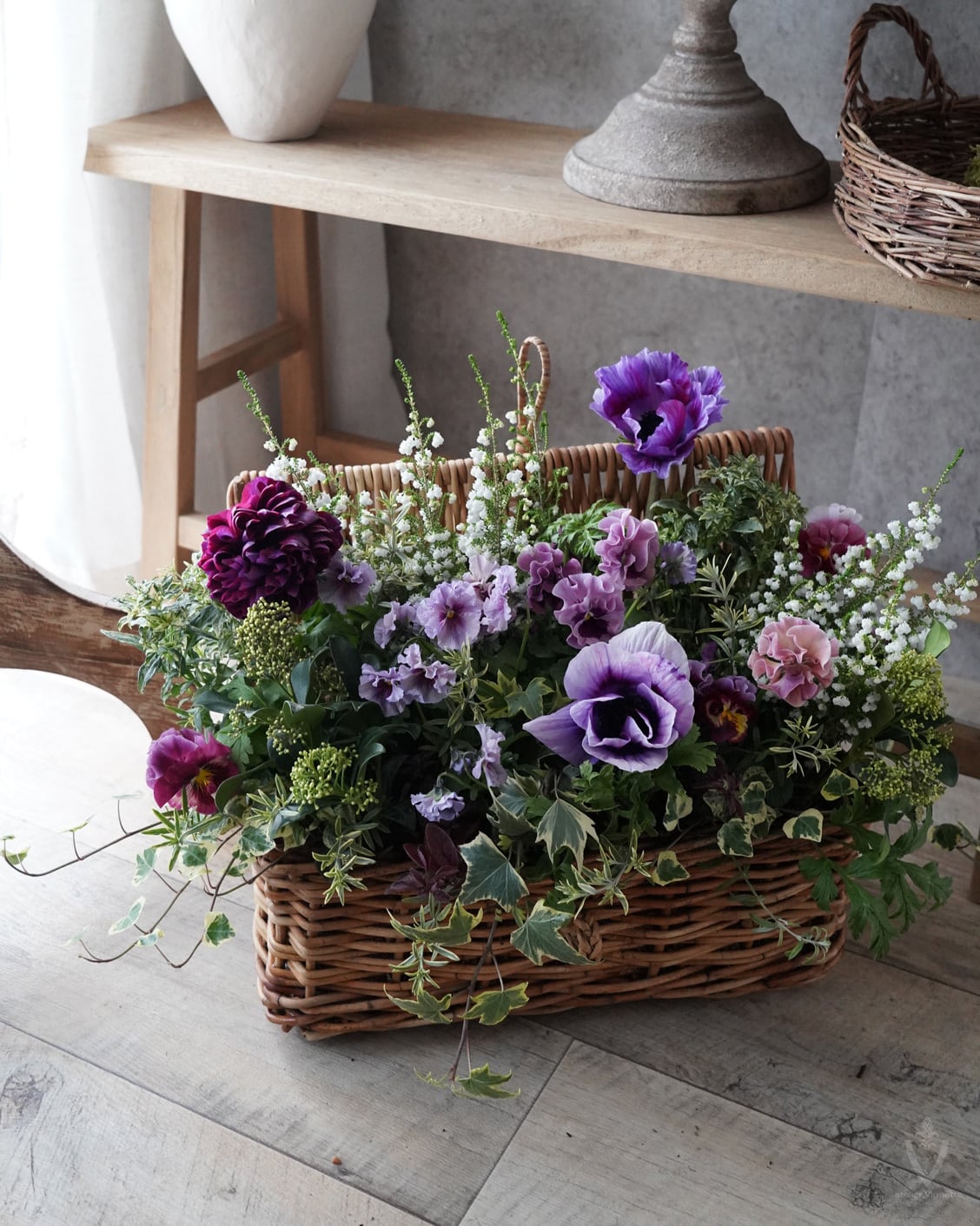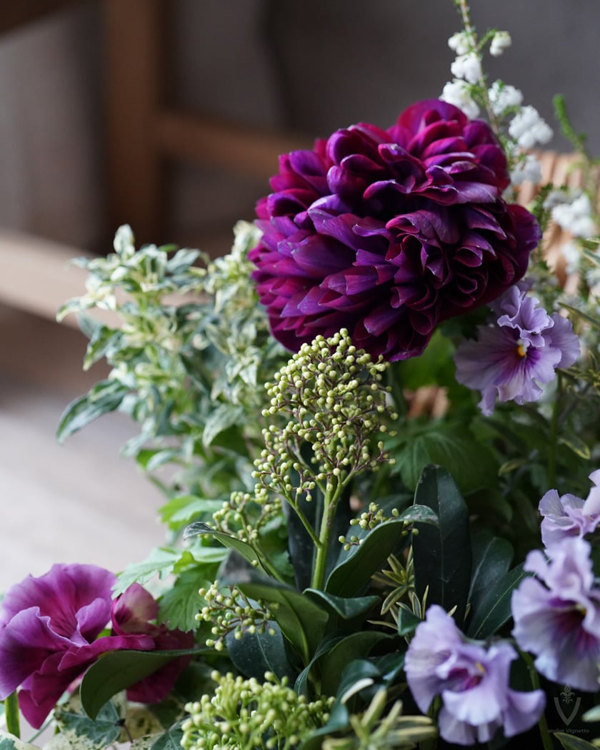 アネモネは日当たりの良い場所で次々開花しますが、お花の途切れ目に寂しくないように、スズランエリカとビオラをあしらっています。