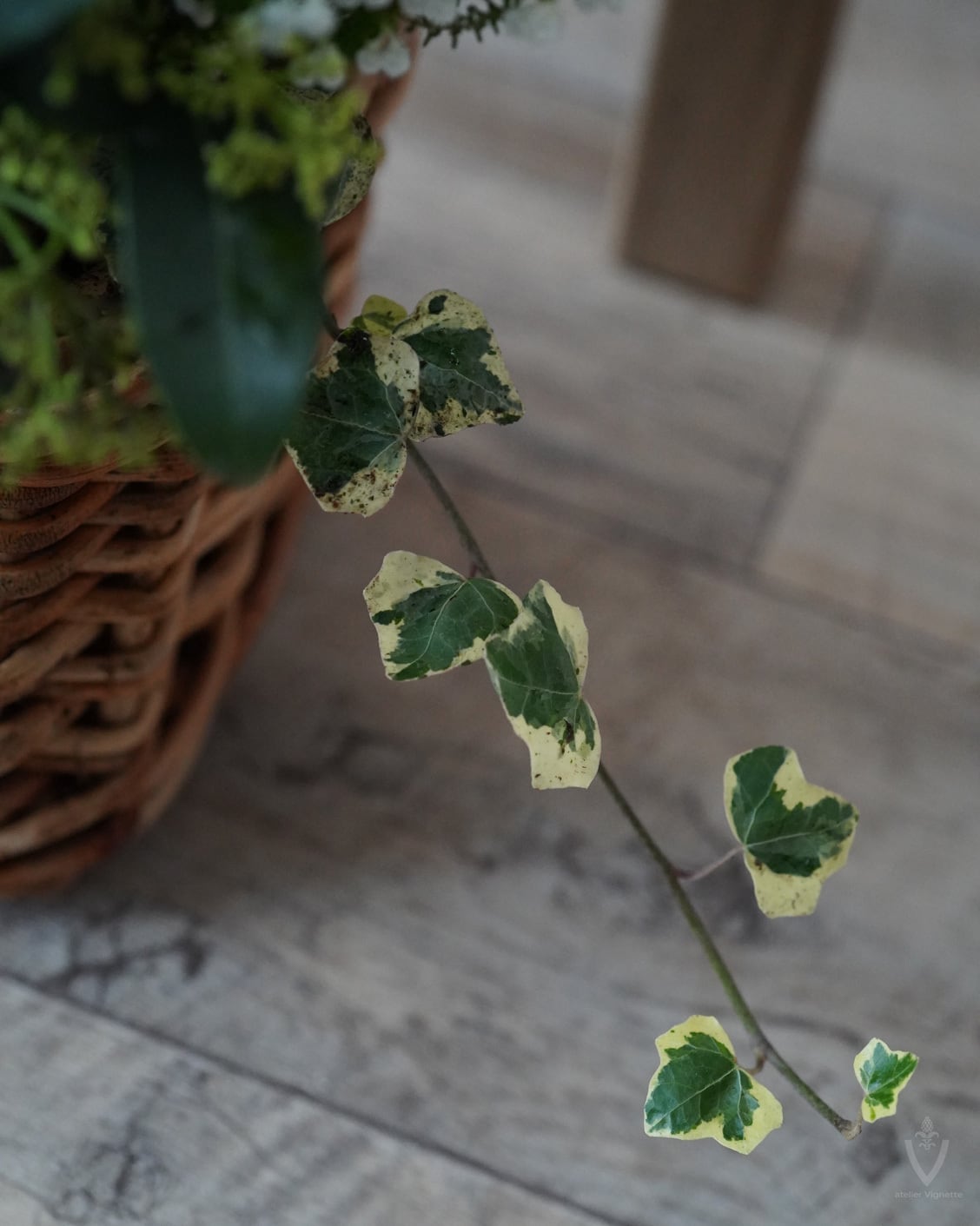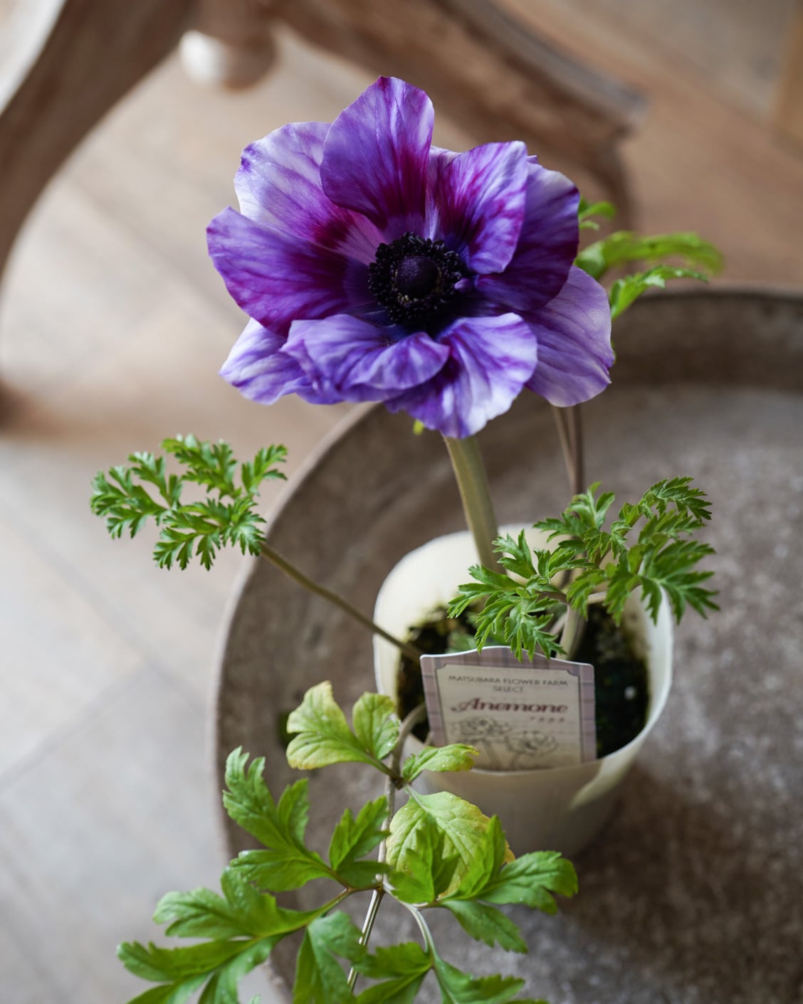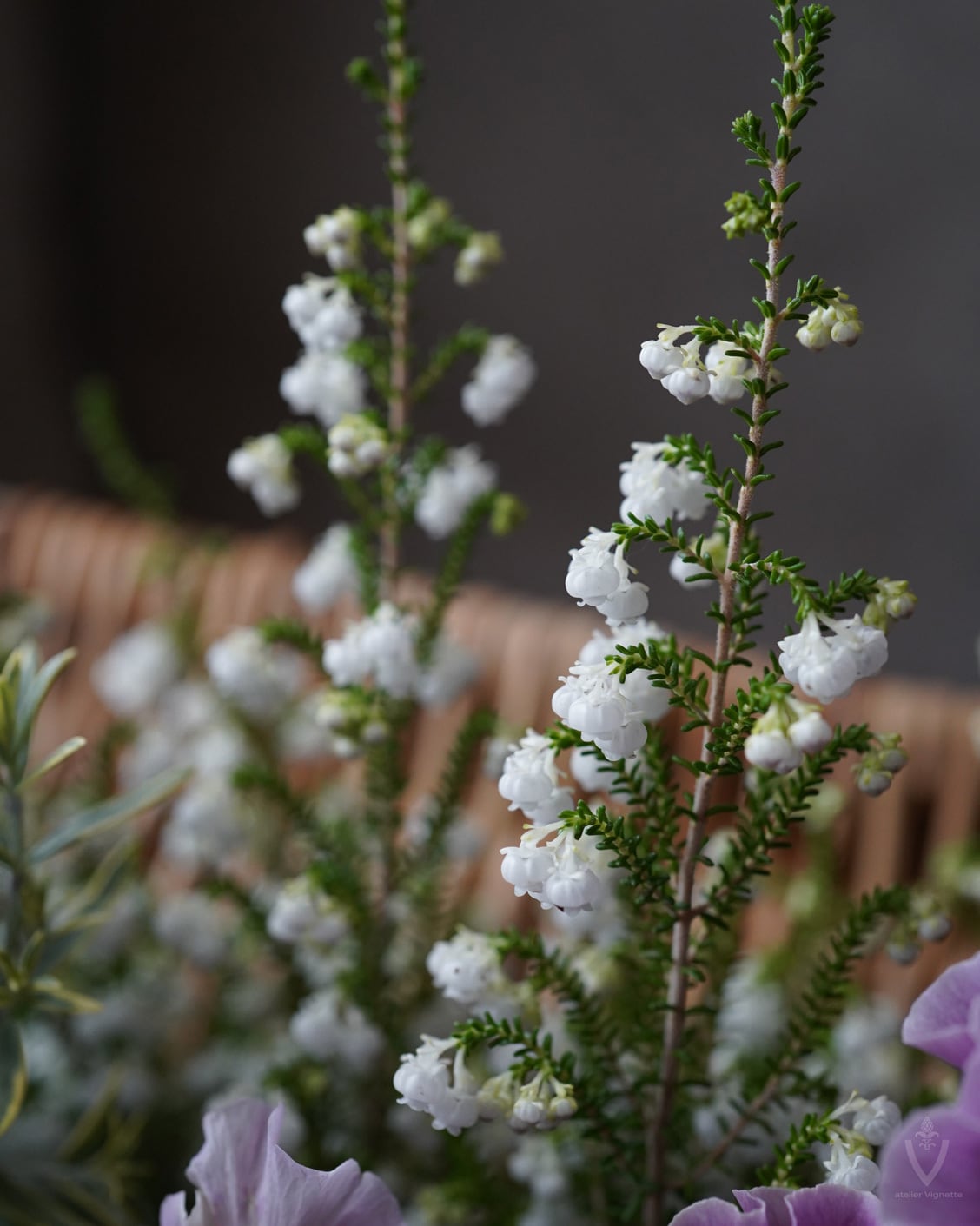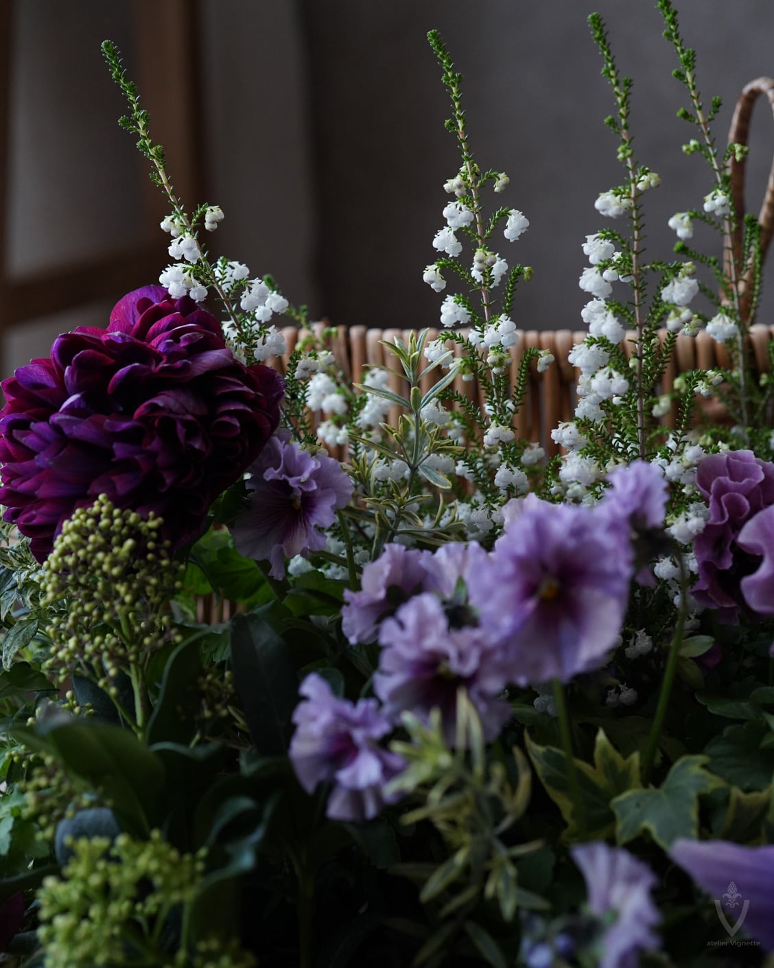 アネモネは日当たりの良い場所で次々開花しますが、お花の途切れ目に寂しくないように、スズランエリカとビオラをあしらっています。