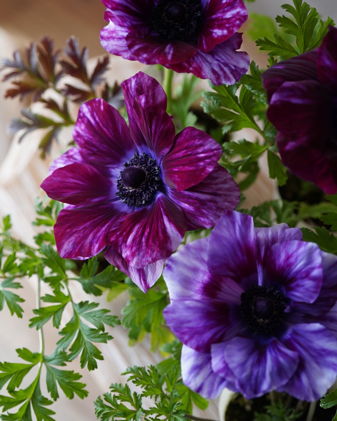 大輪の斑入りの紫系アネモネと八重のワイン色アネモネがメインの苗セット。
