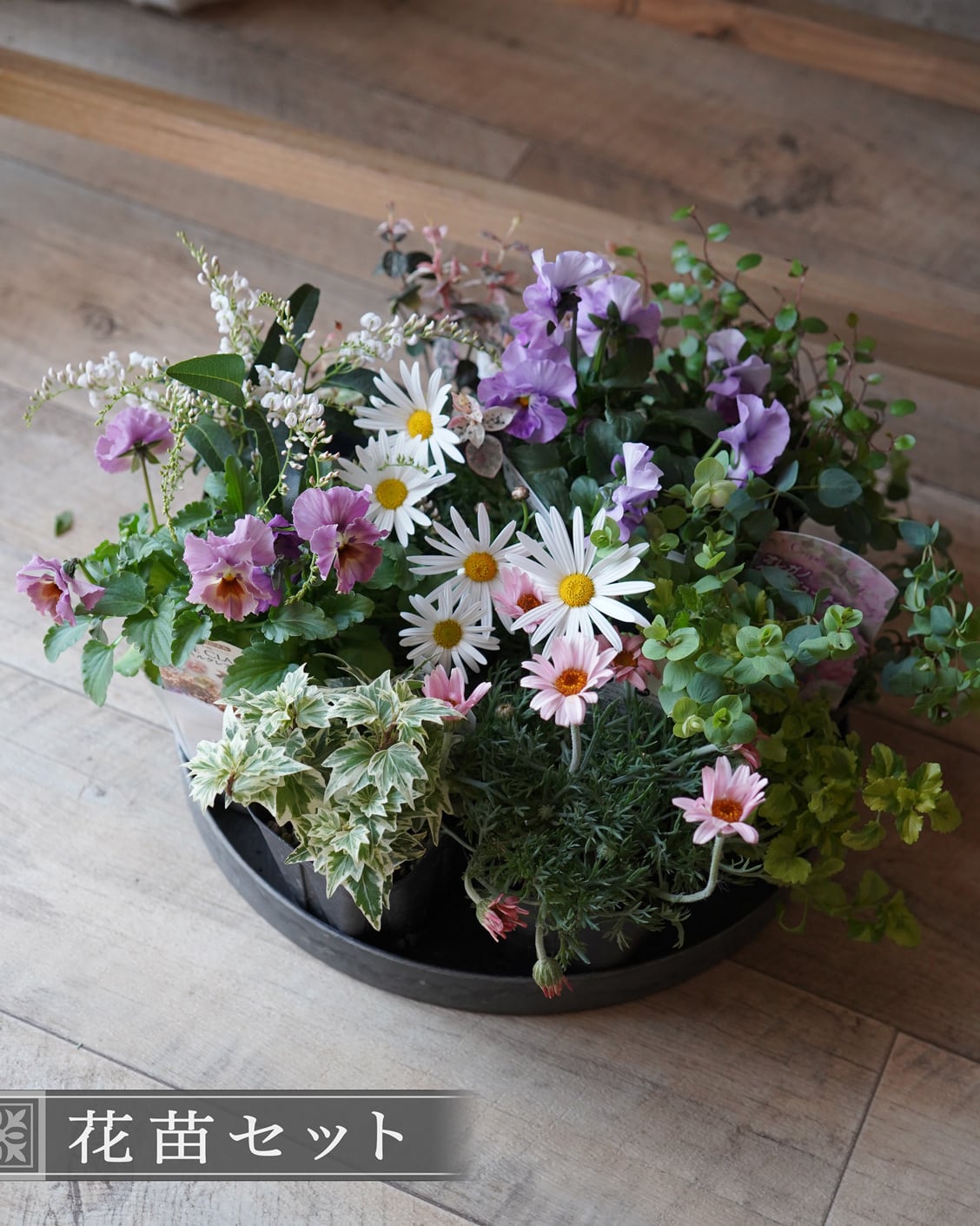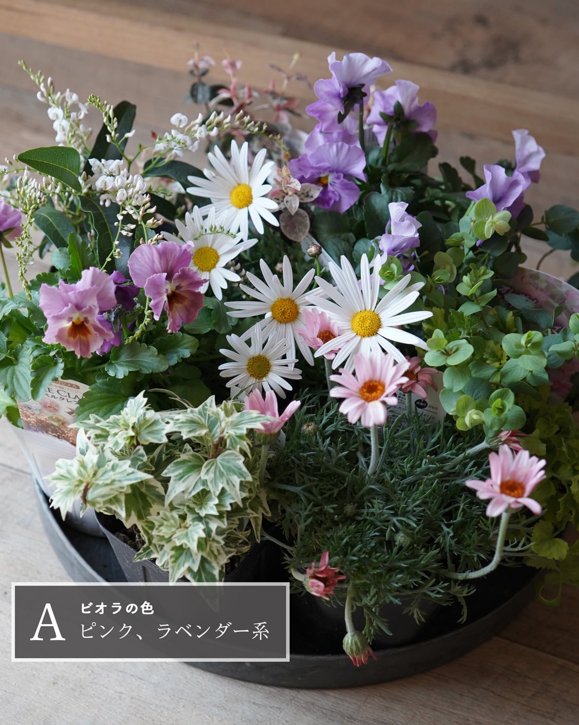 マーガレットとローザンセマムとパステル系ビオラを集めたミニ花苗セット。