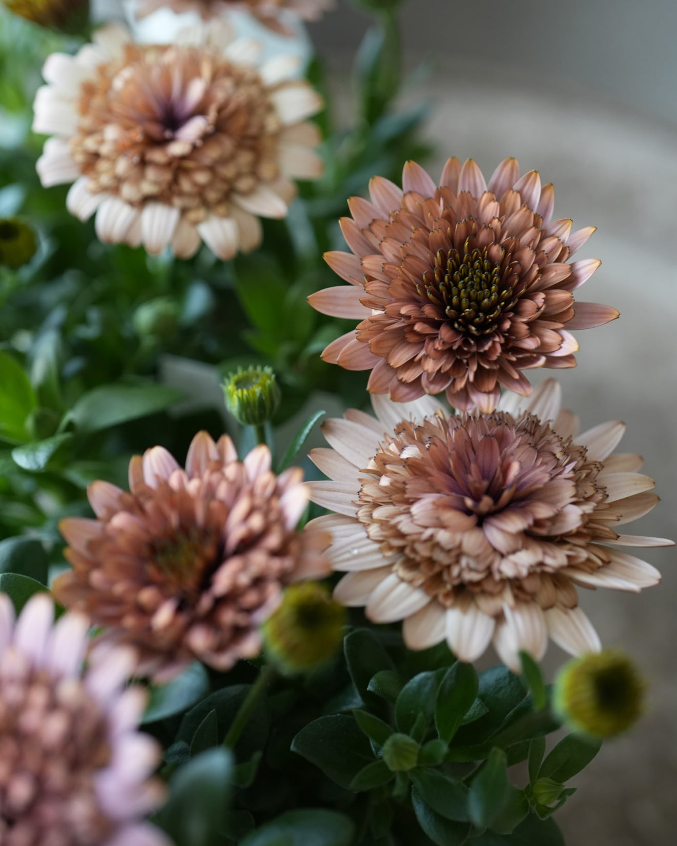 咲き進むと花弁が、オレンジ→白っぽいピンクがかったコーラル色に変化する八重咲きオステオ。