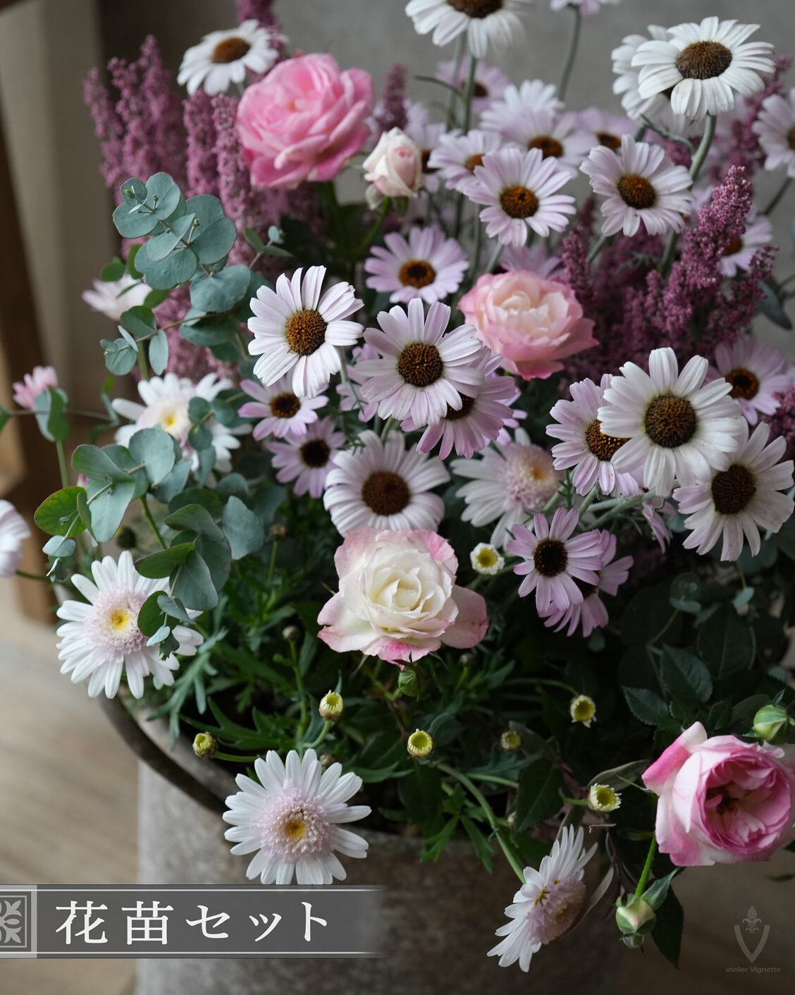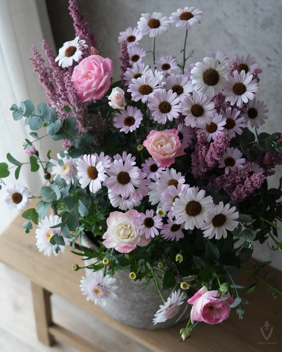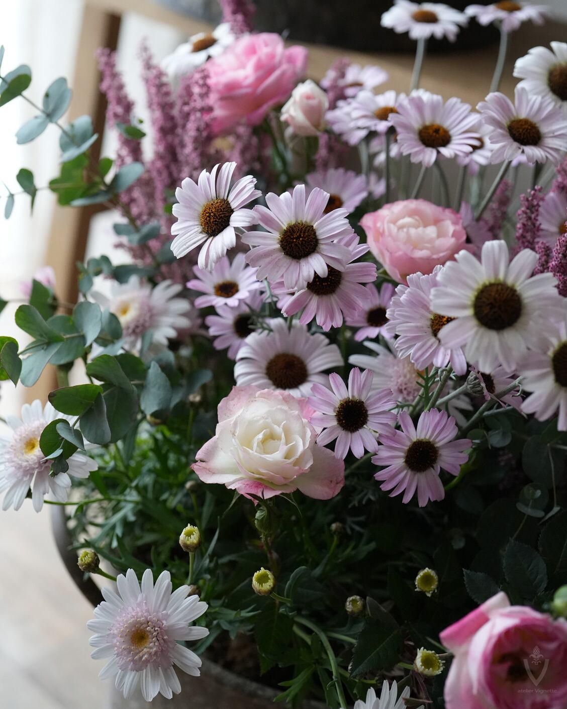 ぺビーピンク系のお花を集め、深みのあるアンティークピンクのエリカと合わせました。