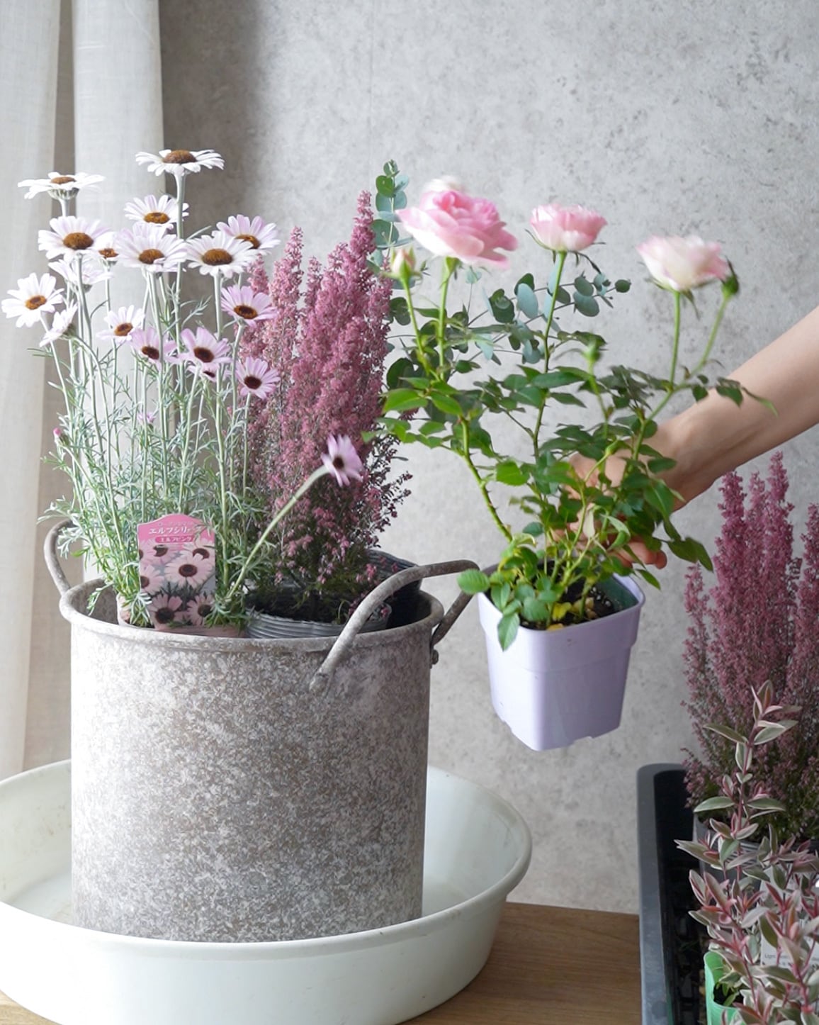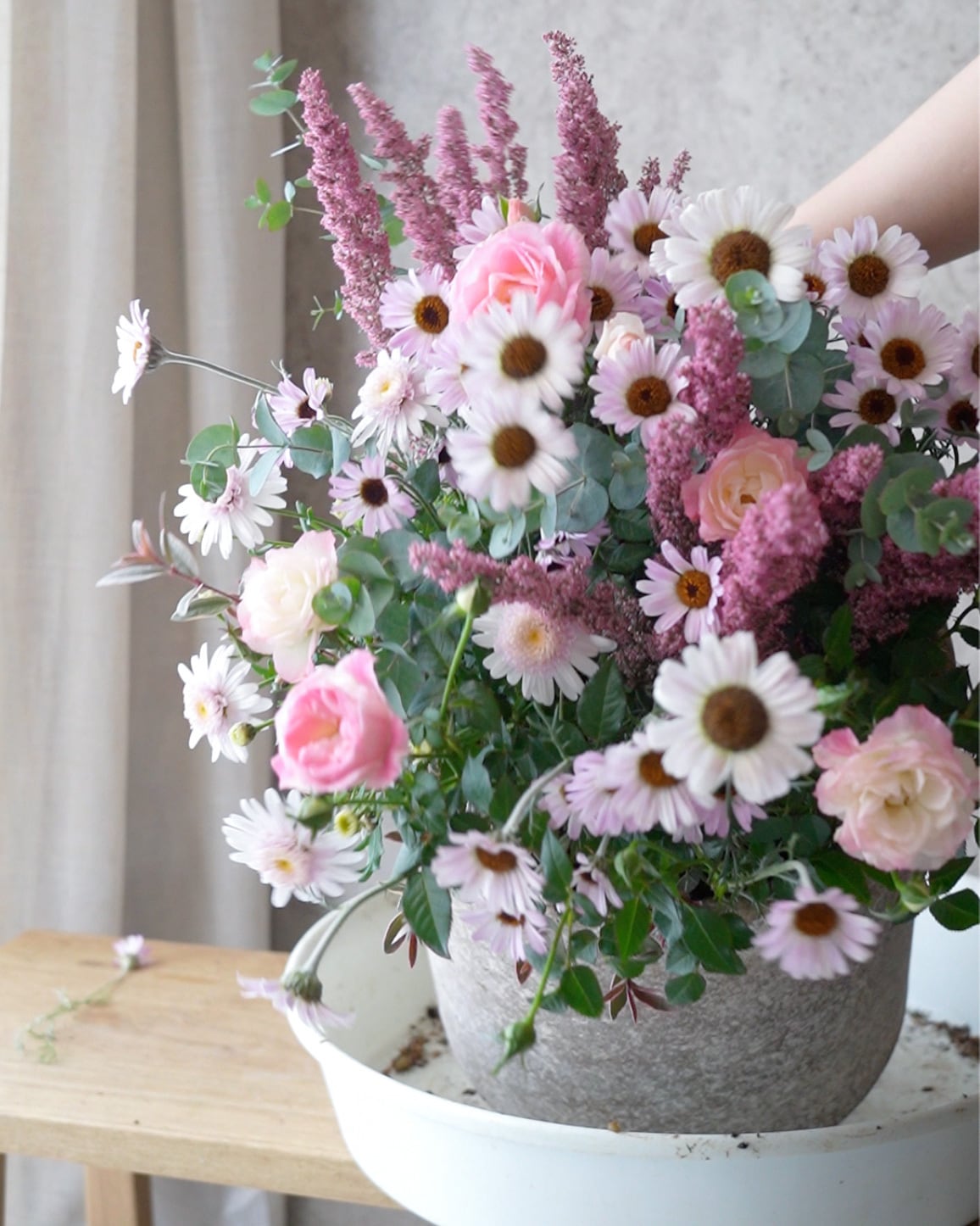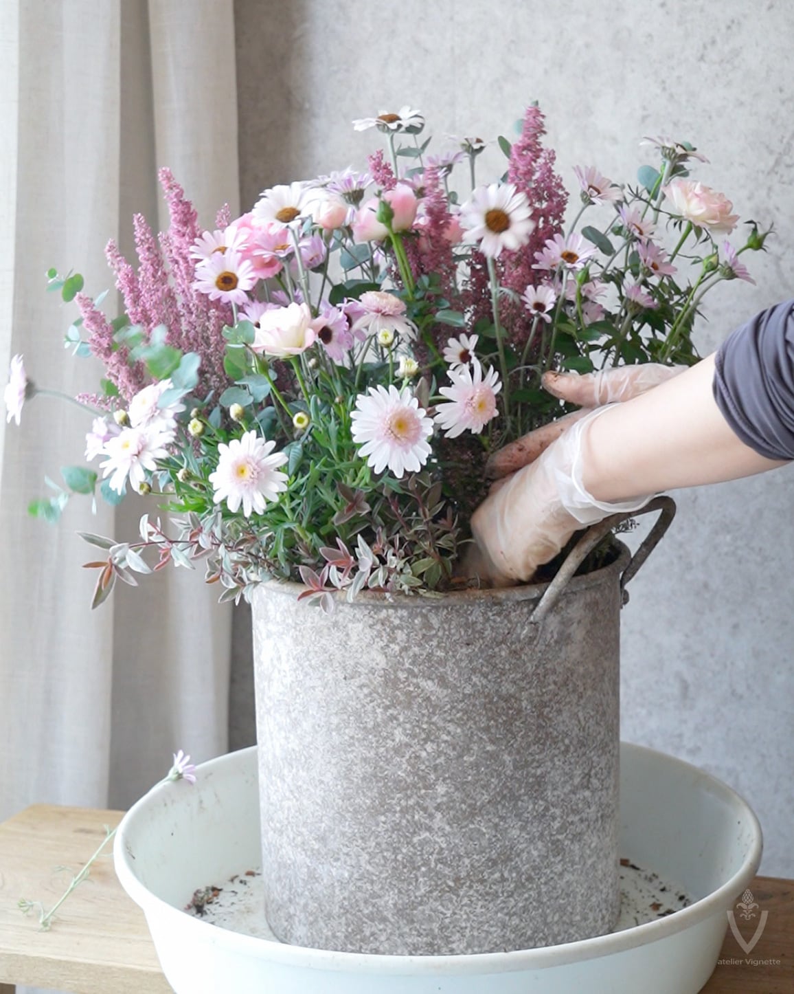 ぺビーピンク系のお花を集め、深みのあるアンティークピンクのエリカと合わせました。