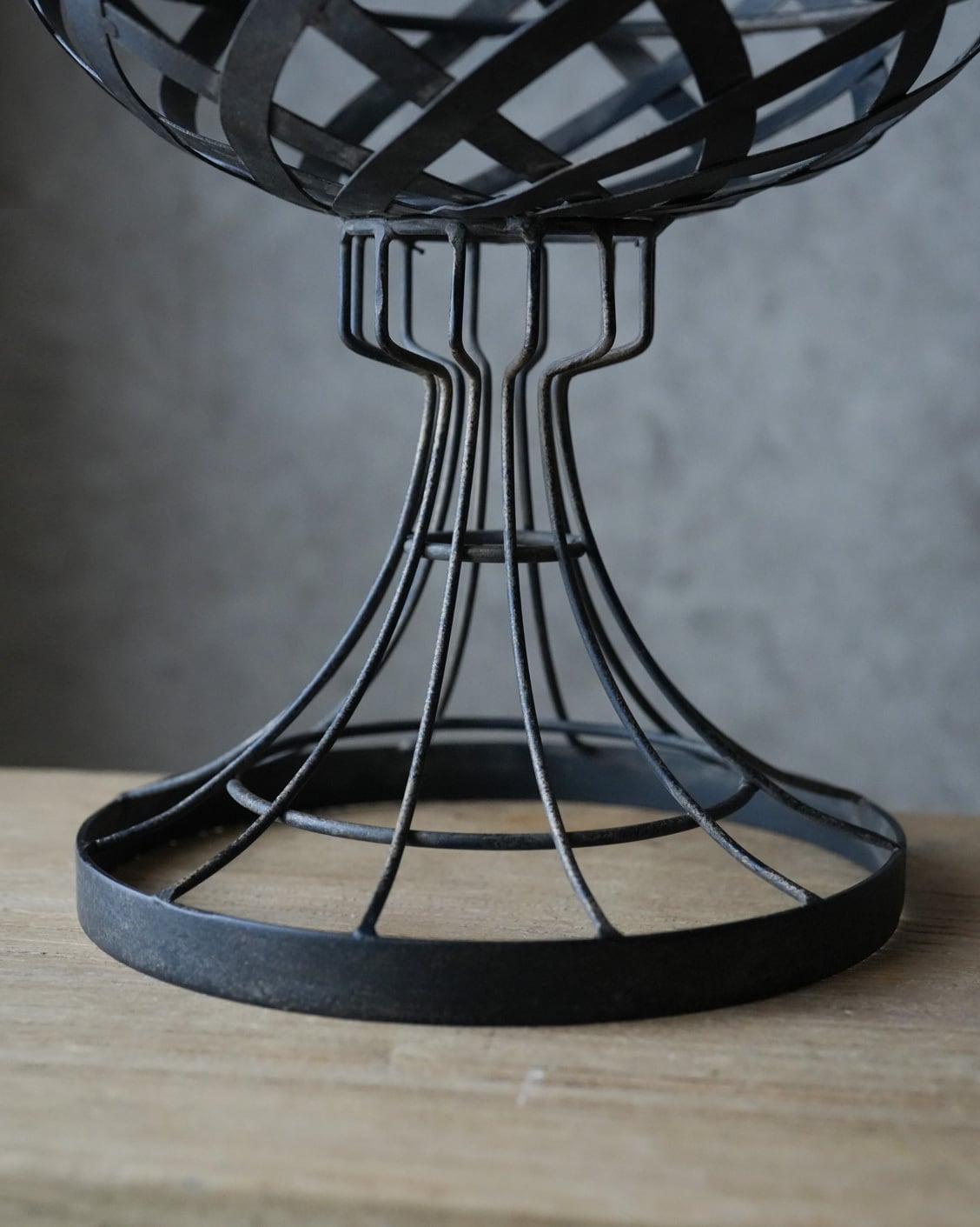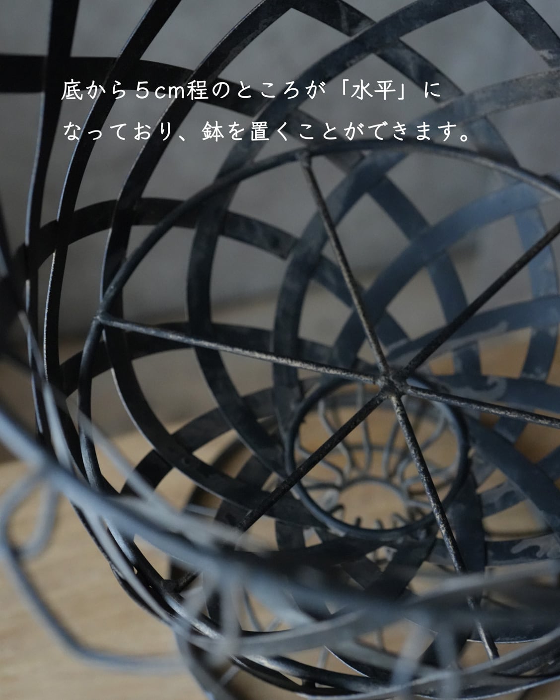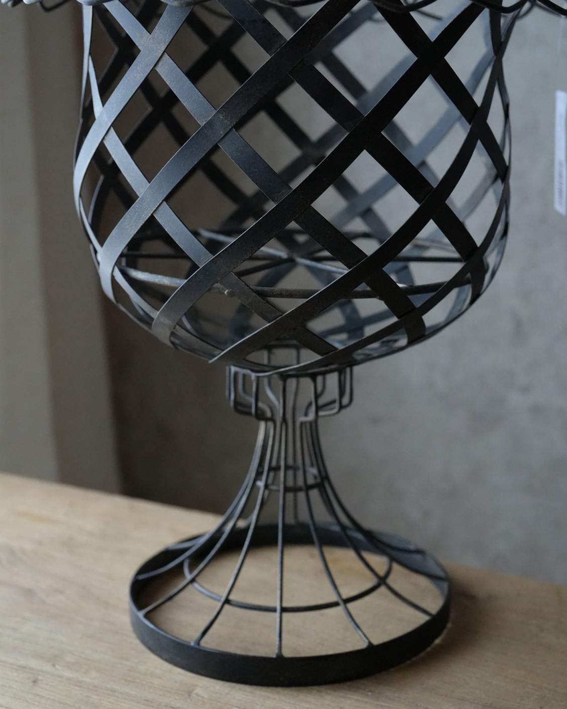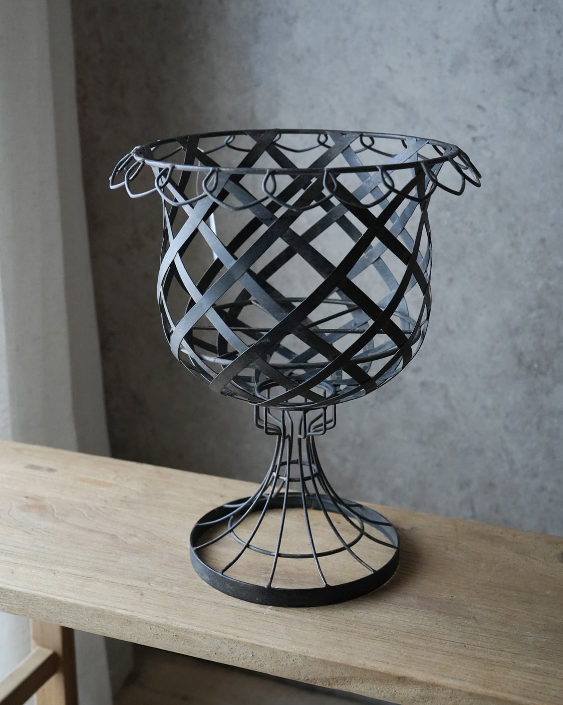 平たいアイアンを編み上げたカップ型鉢カバー。