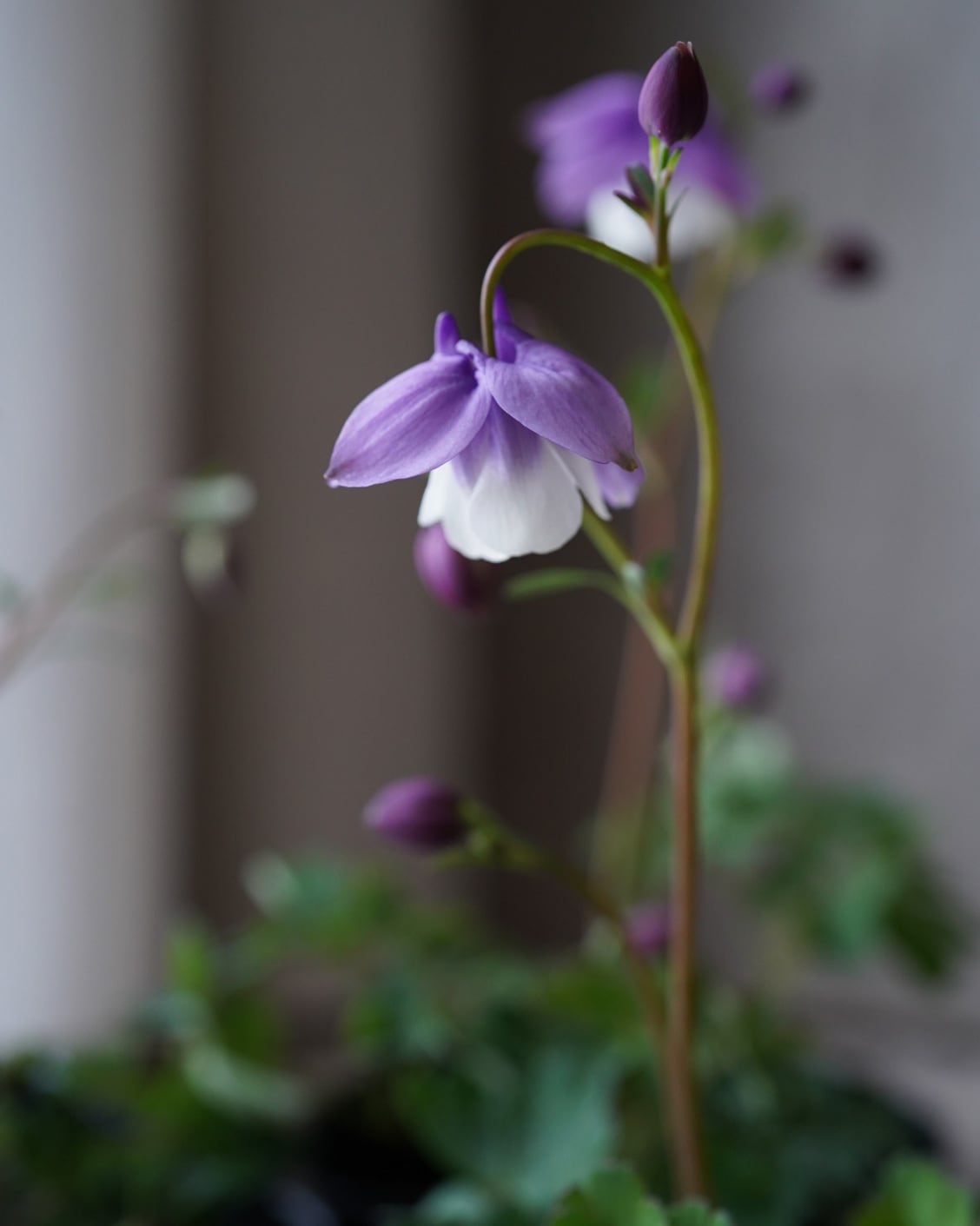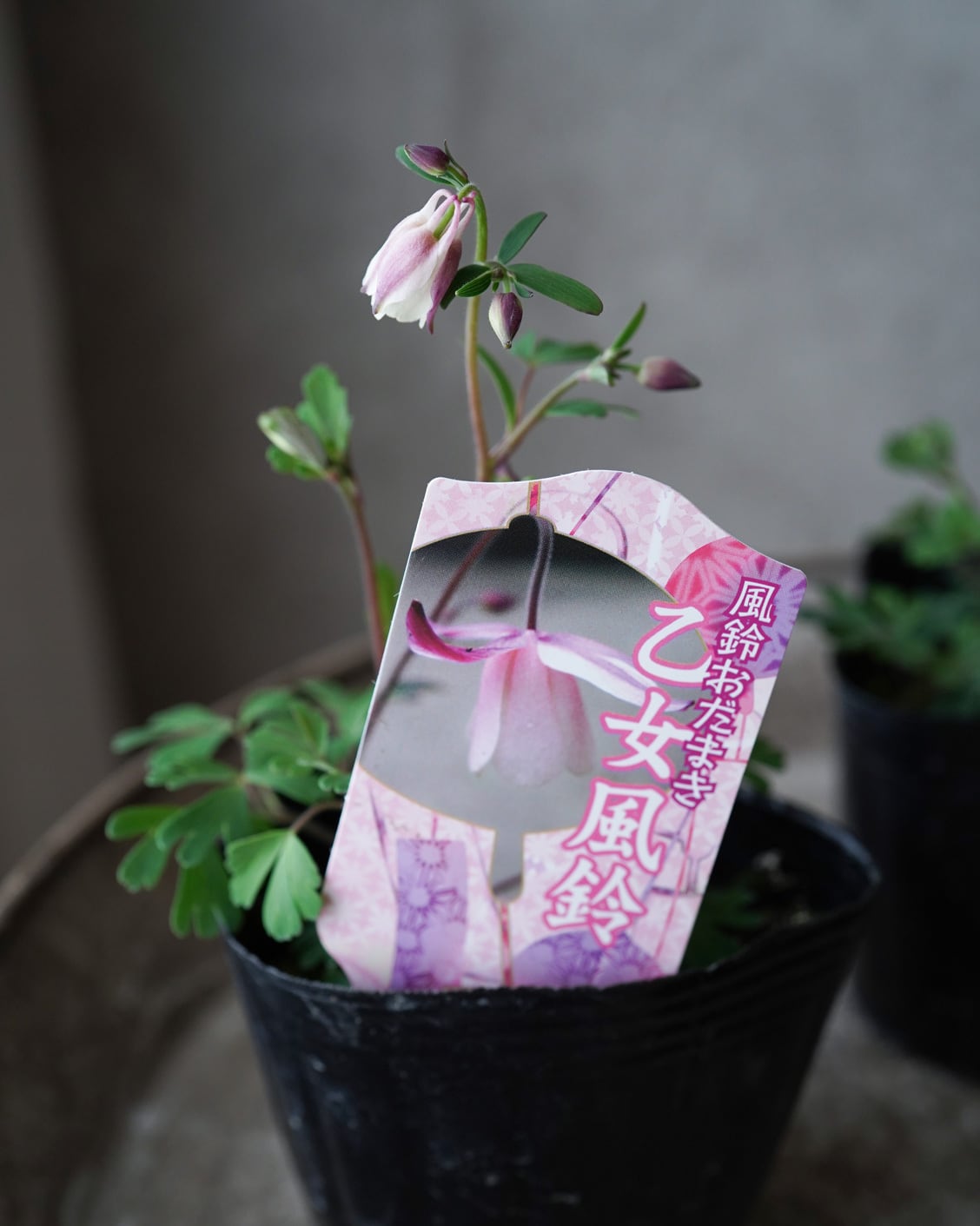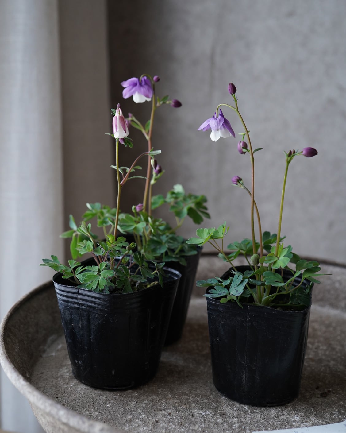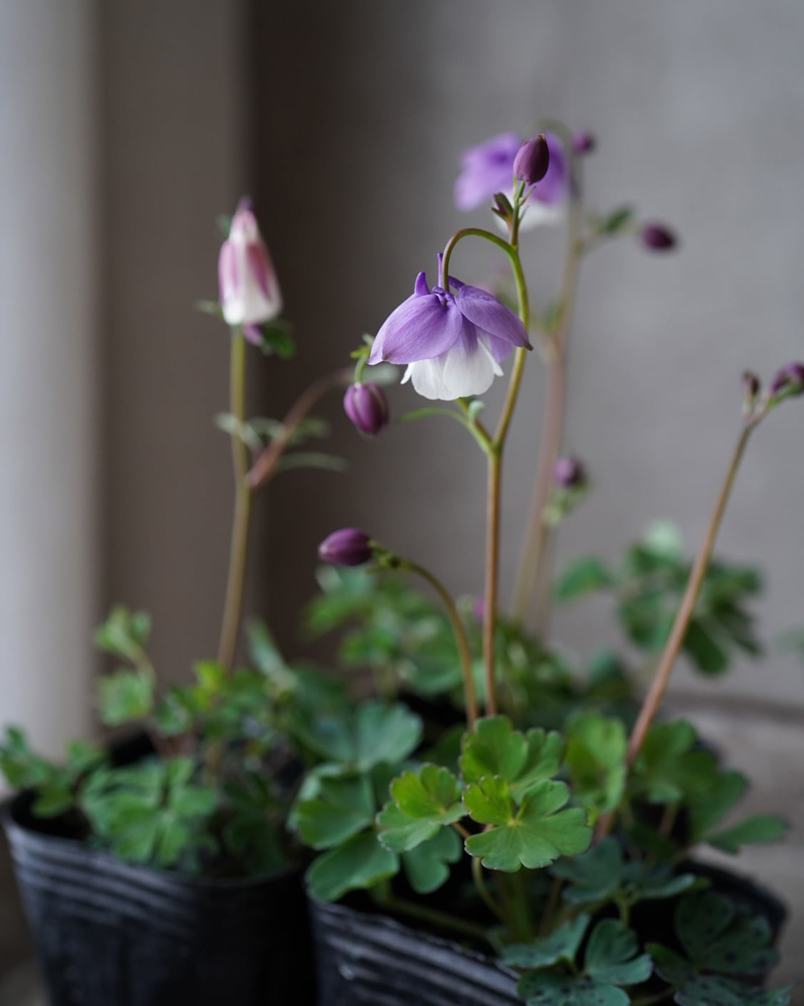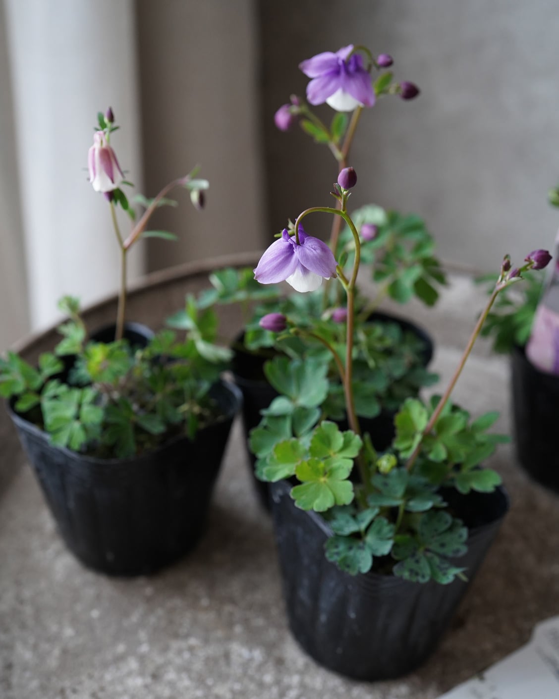 風鈴のような下向きのお花が咲く短い丈のオダマキ。