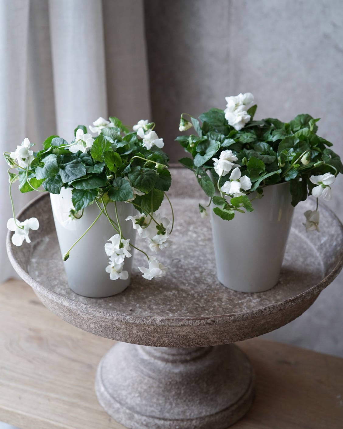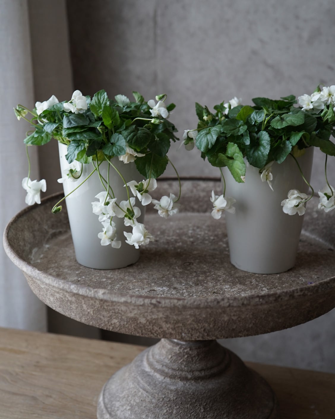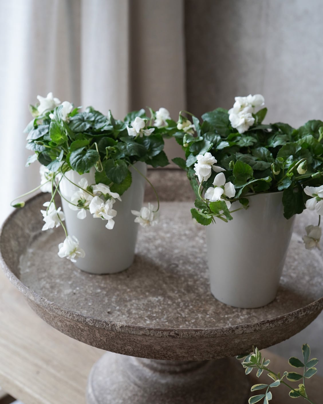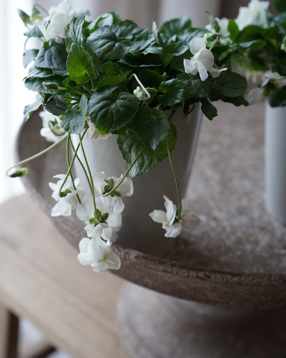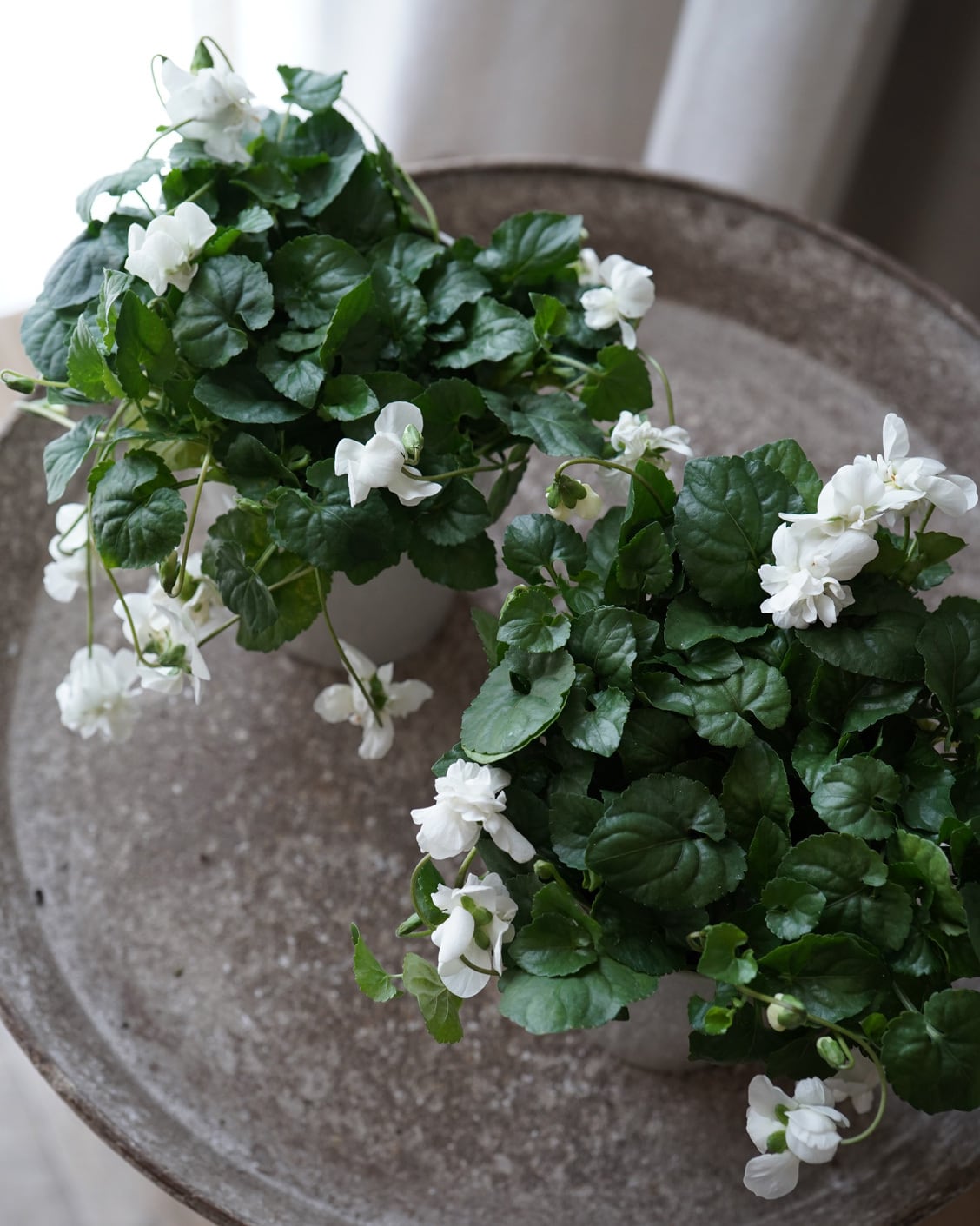 大きめの八重咲きの白い花が垂れ下がるように咲くスミレ。