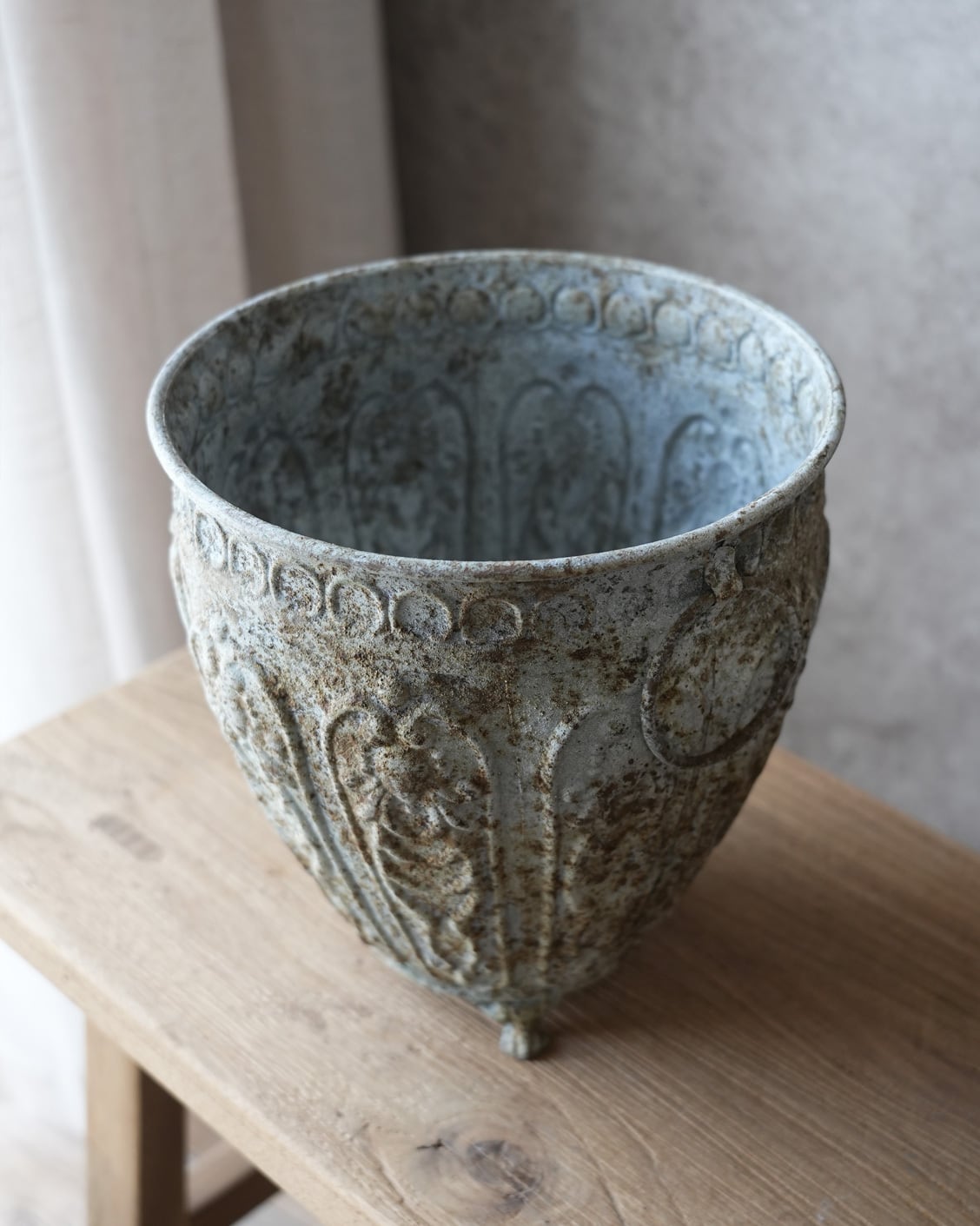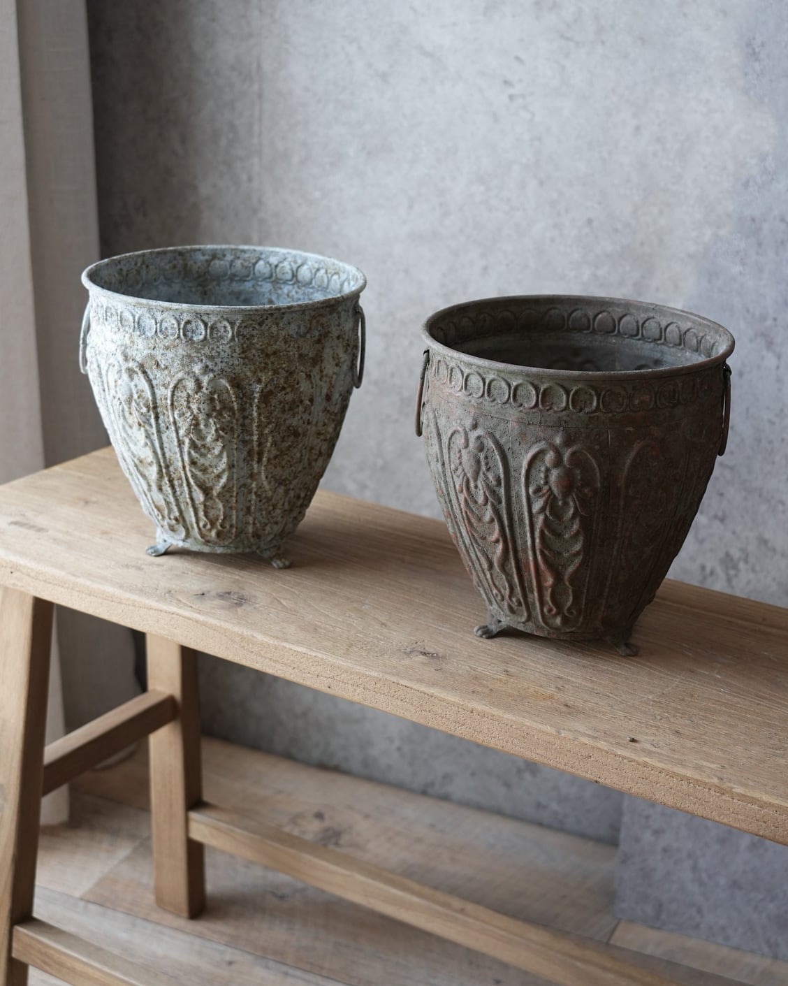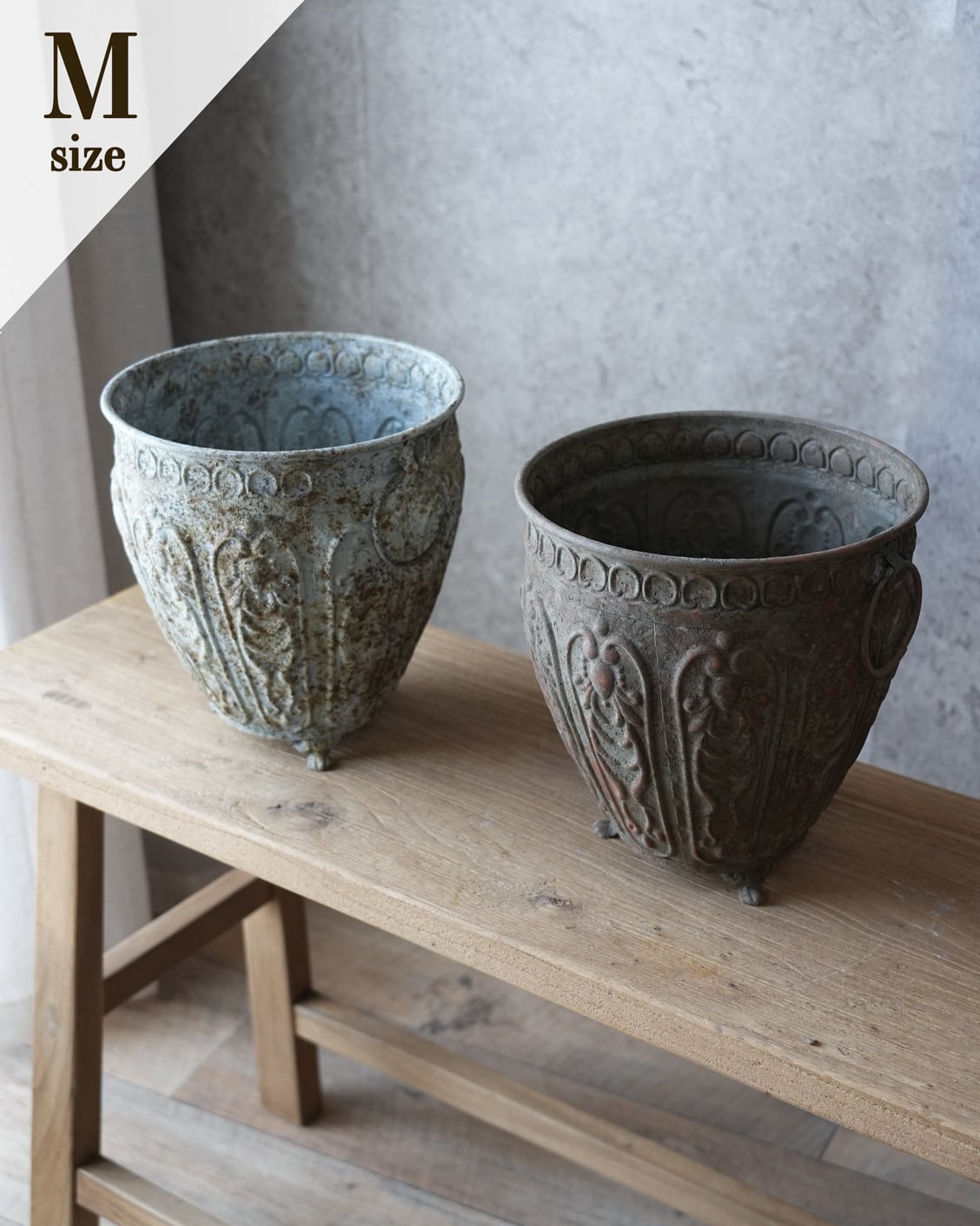 ブリキにアンティークな意匠とシャビー加工が施された植木鉢。