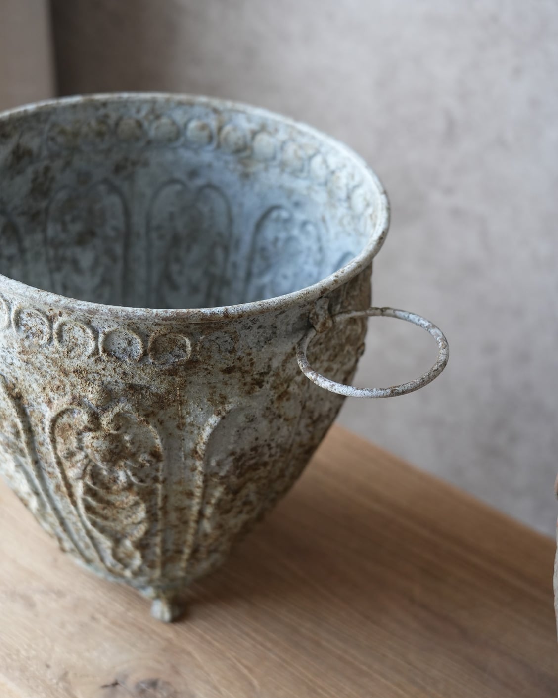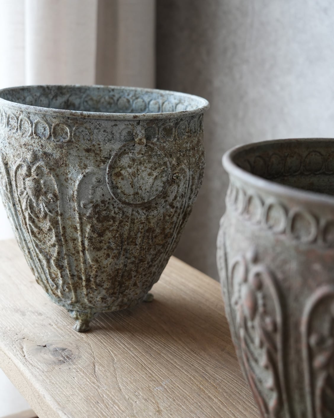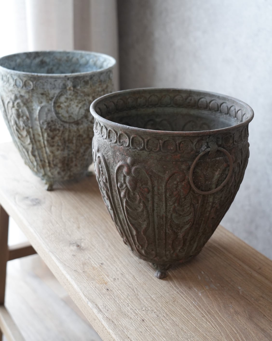 ブリキにアンティークな意匠とシャビー加工が施された植木鉢。