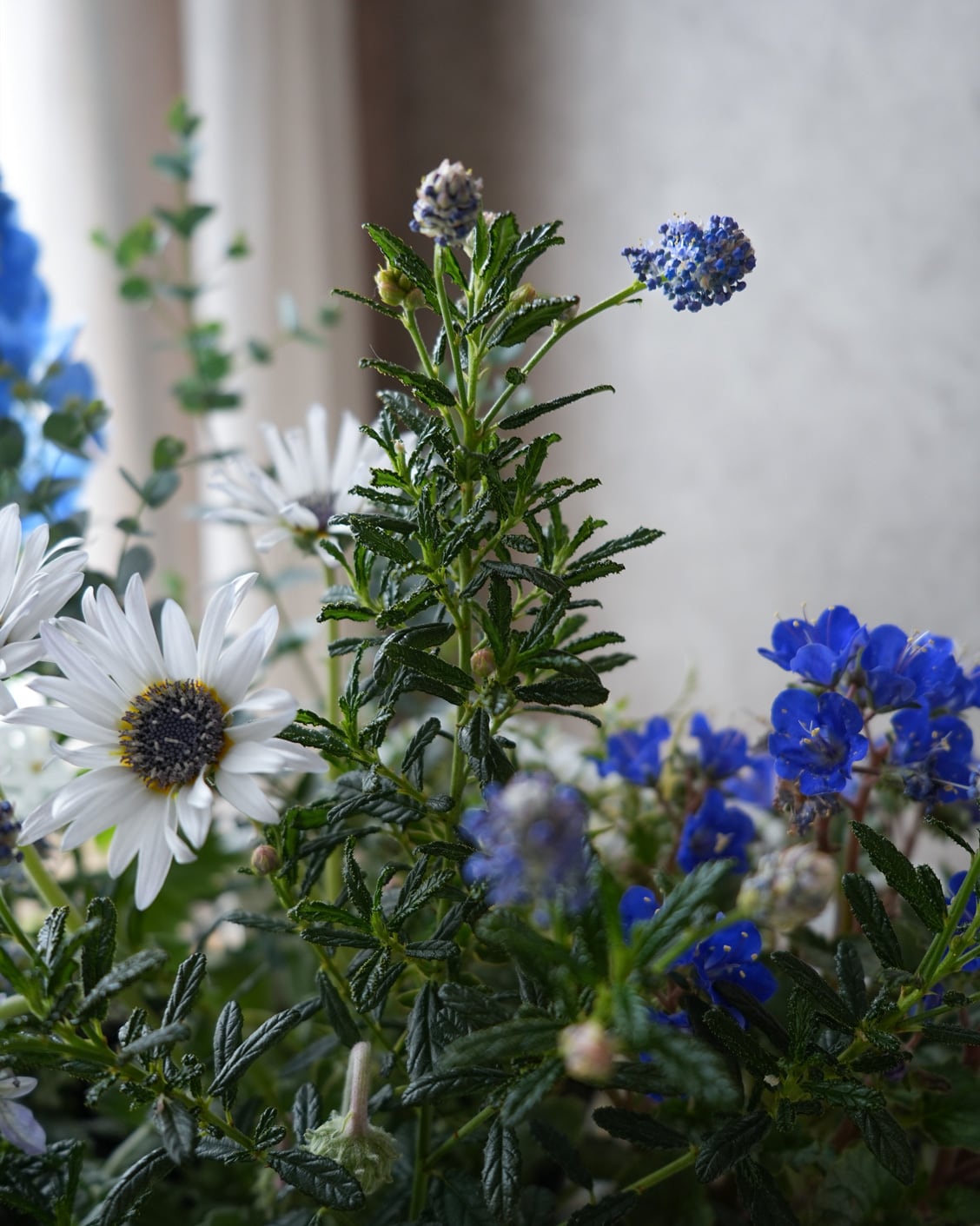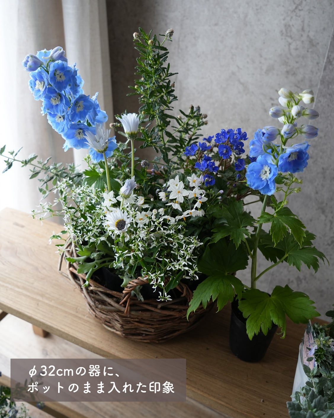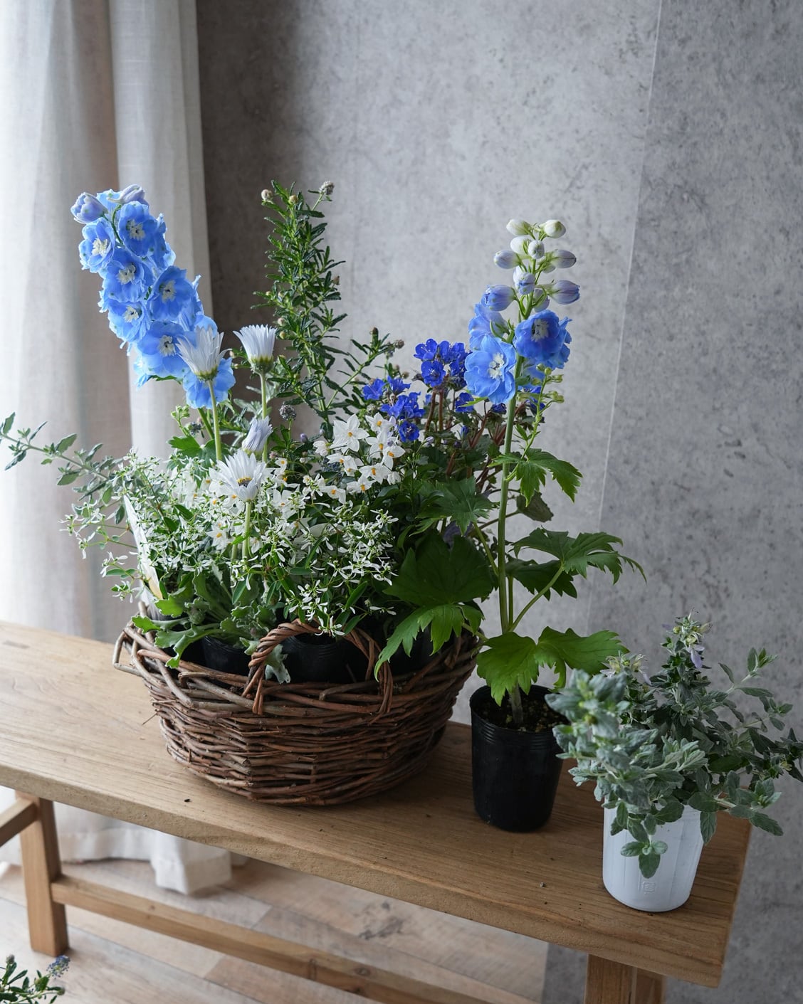 水色のデルフィニウムの2番花を待つ間も、白い小花が咲き続けるような構成です。