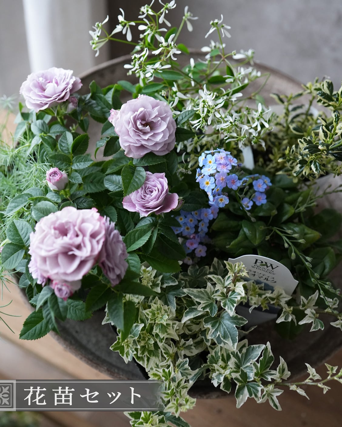 ラベンダー色のミニバラと水色の勿忘草の配色に惹かれたミニ花苗セット。