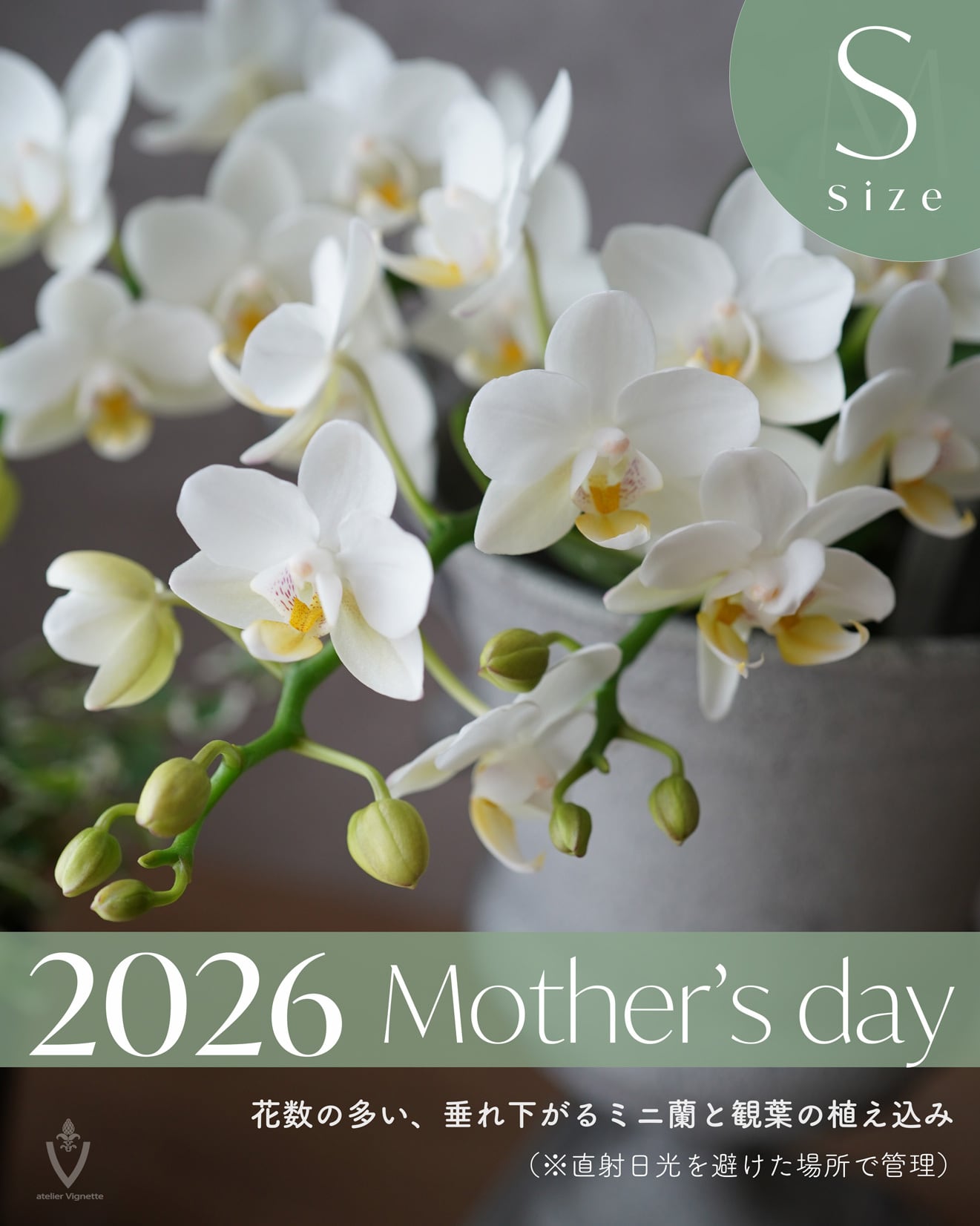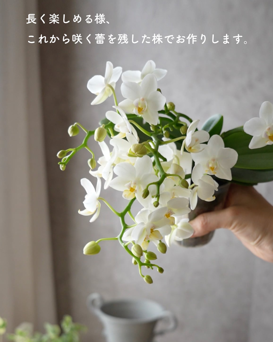 小ぶりの白い蘭「ナザレ」と観葉植物の植え込み。