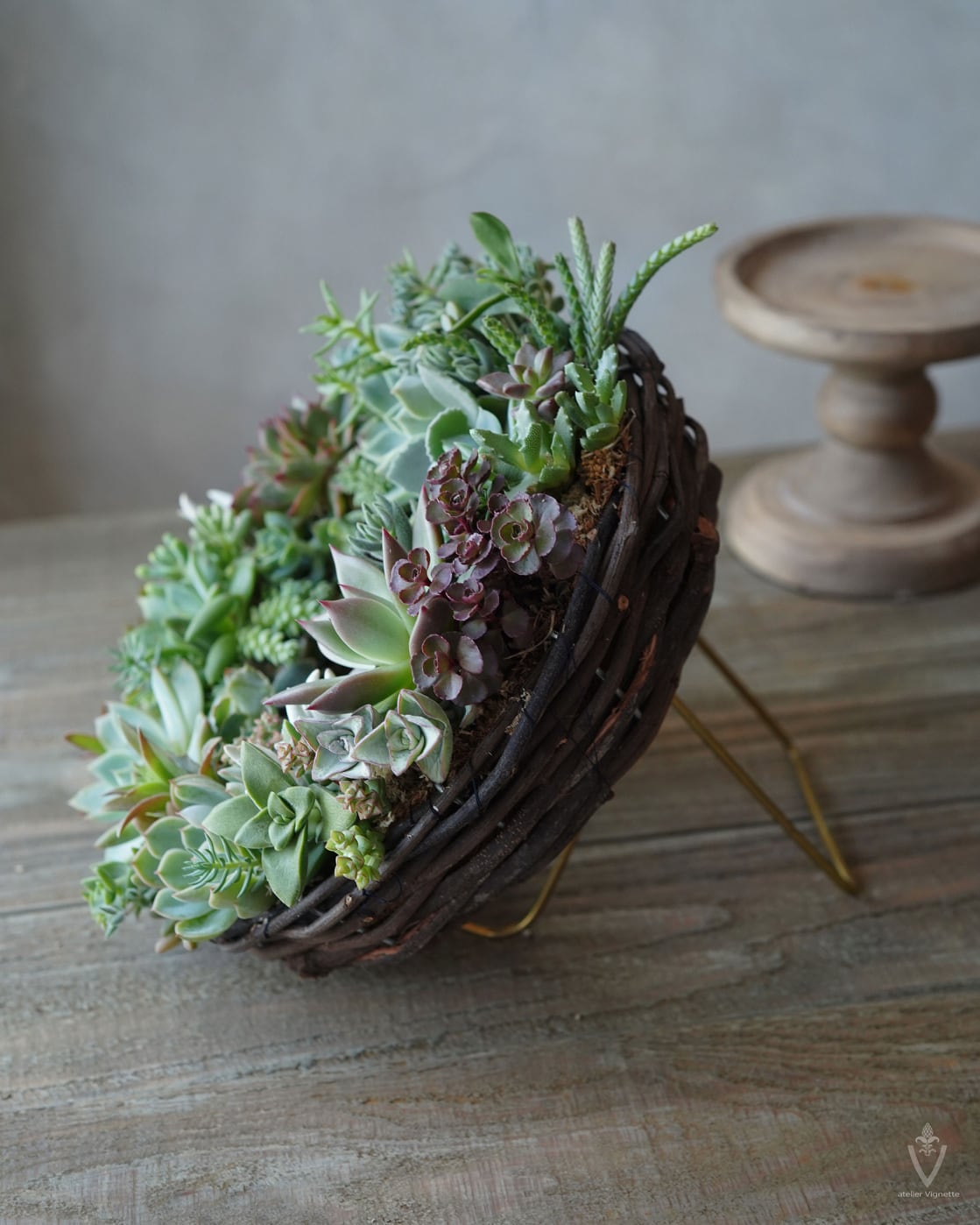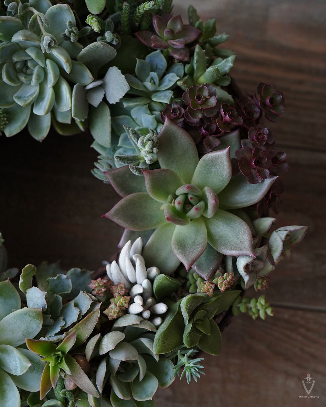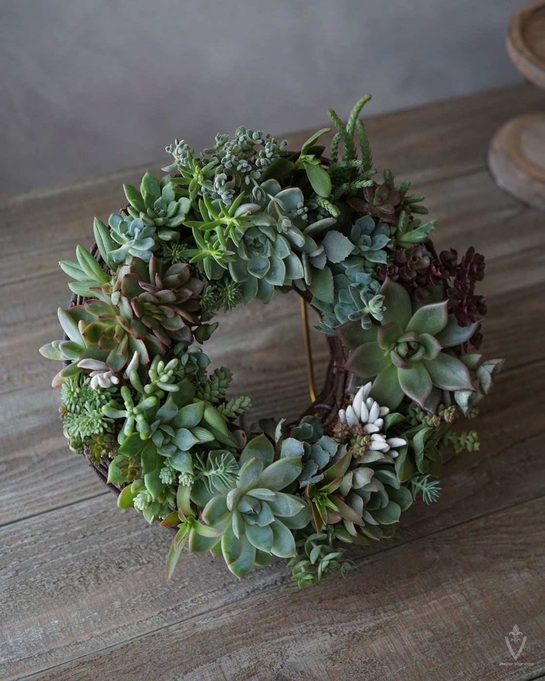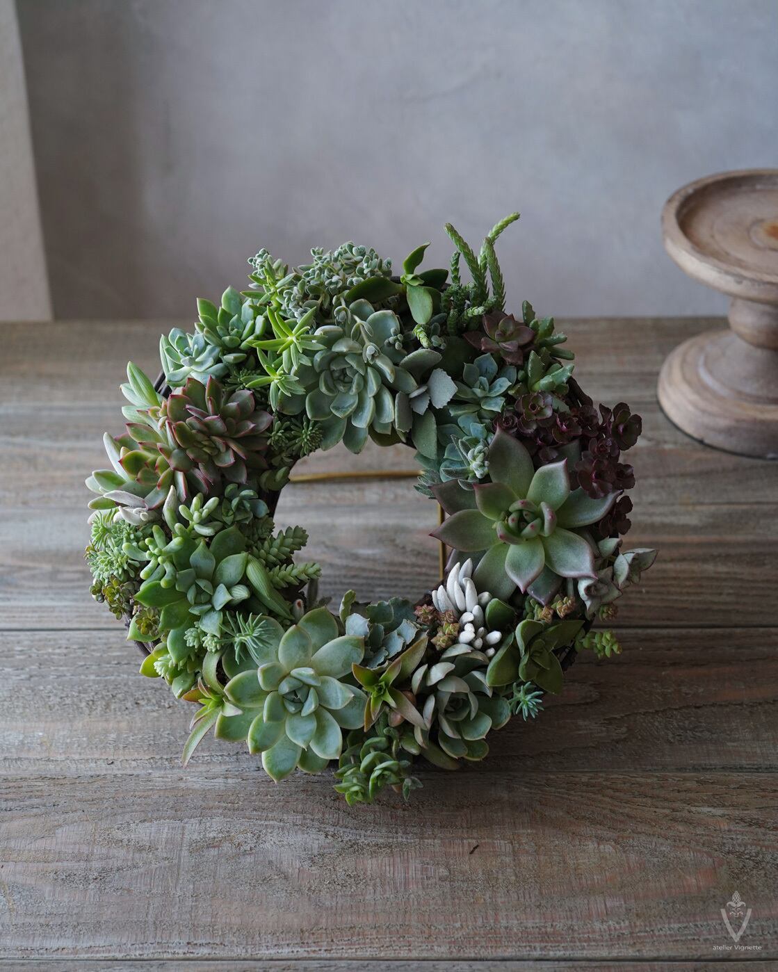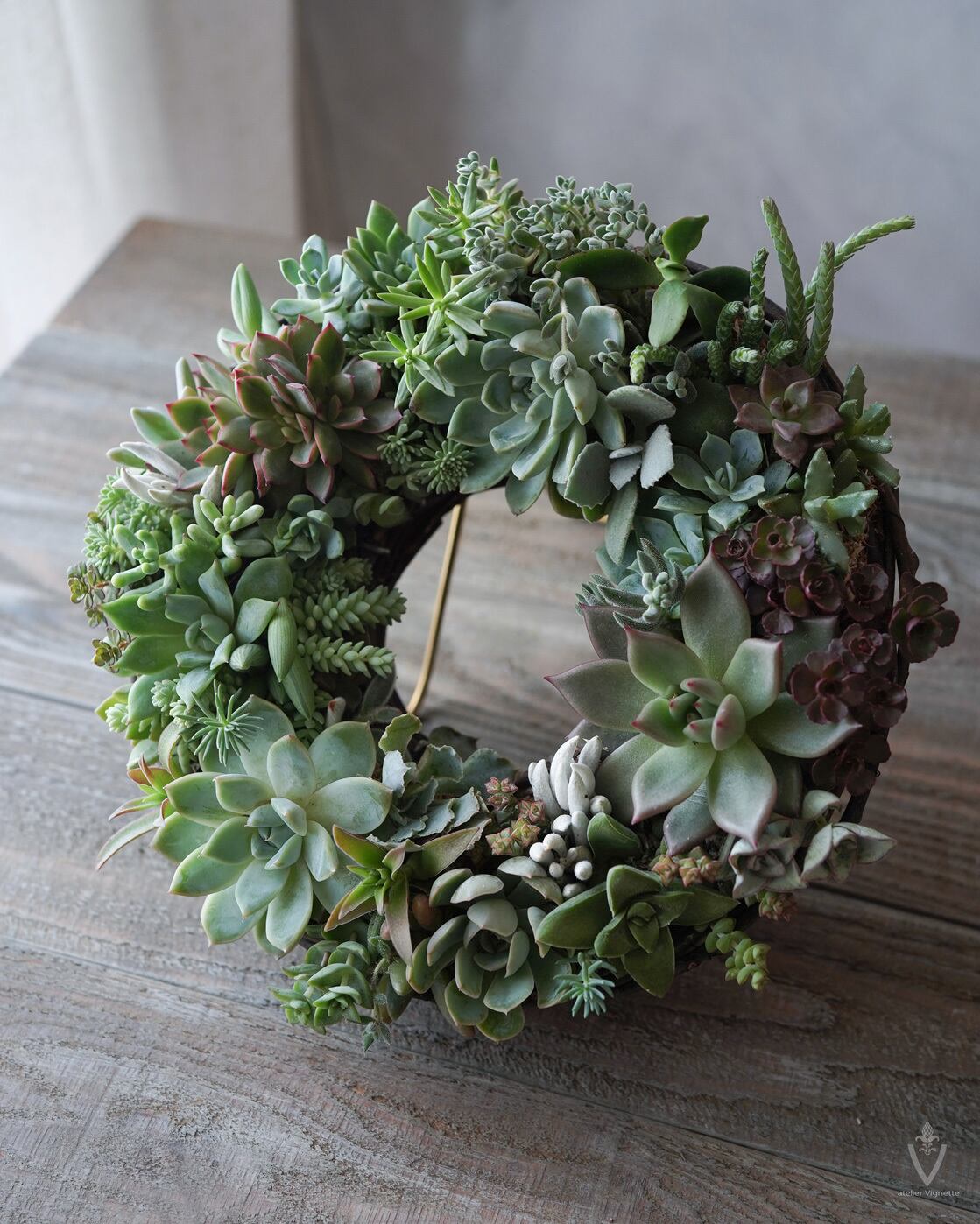 いろいろな種類の多肉植物をぎっしりリースに植え込みました。