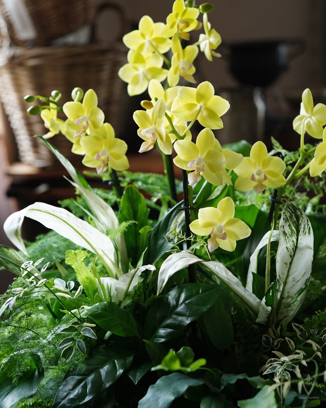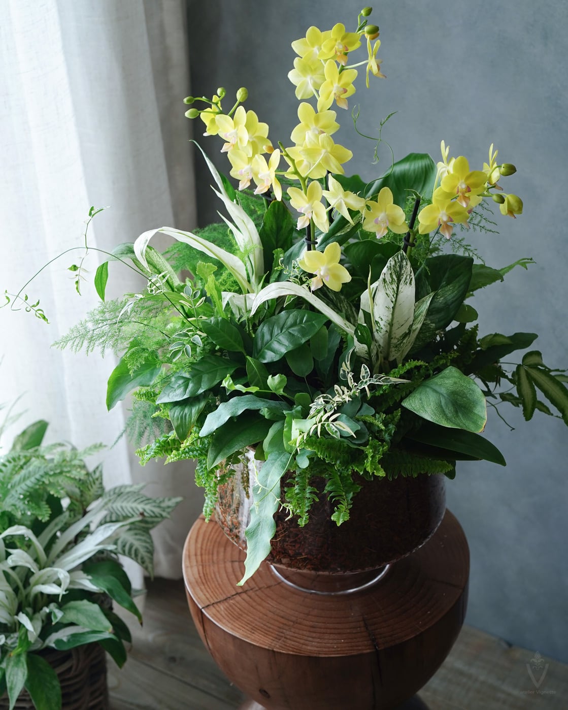 【ランと観葉植物の寄せ植え・ガラスの容器】