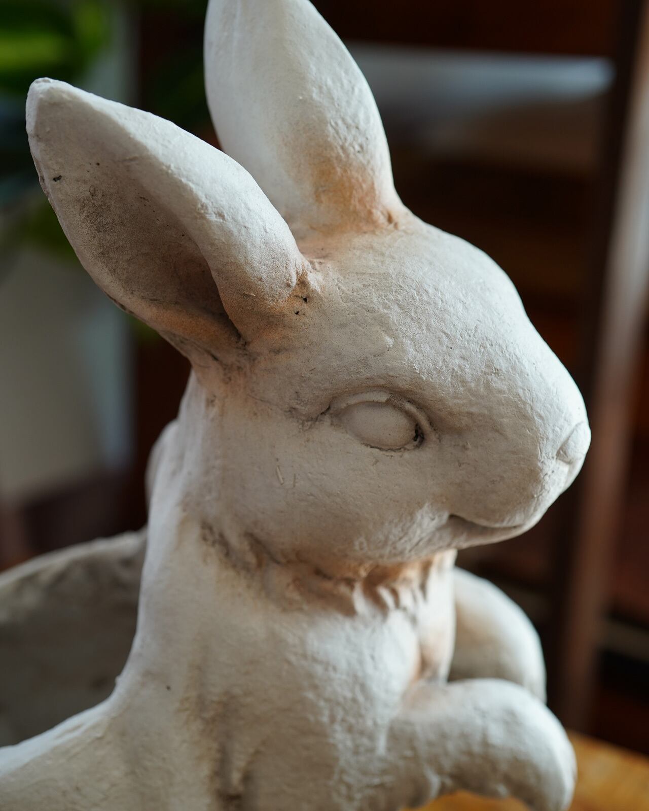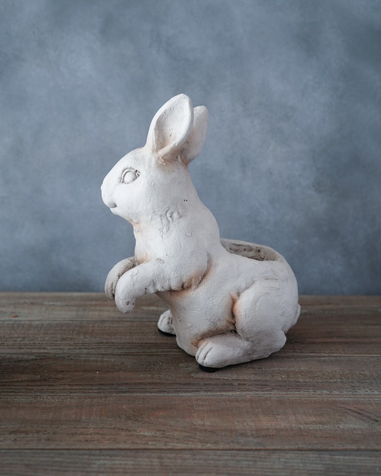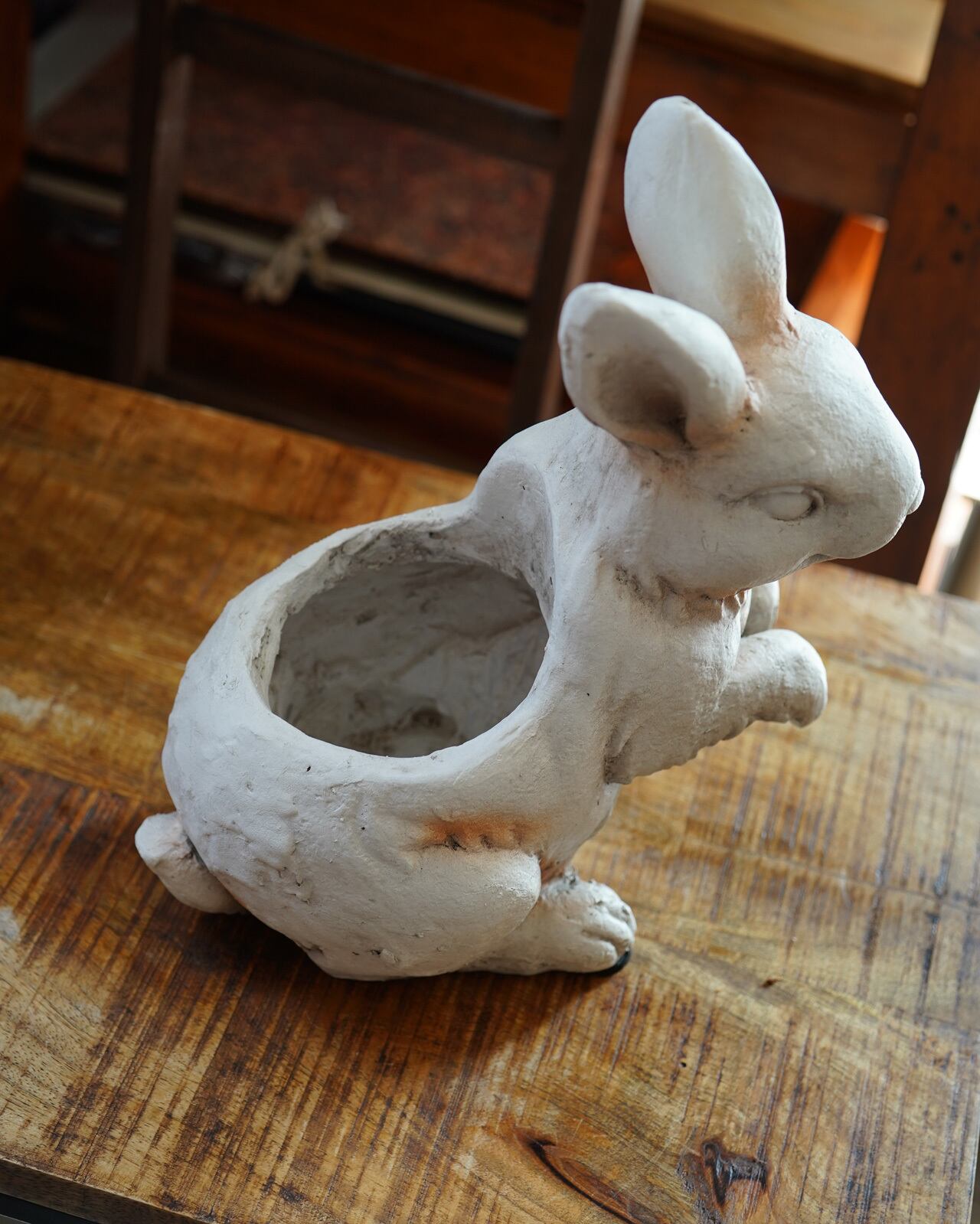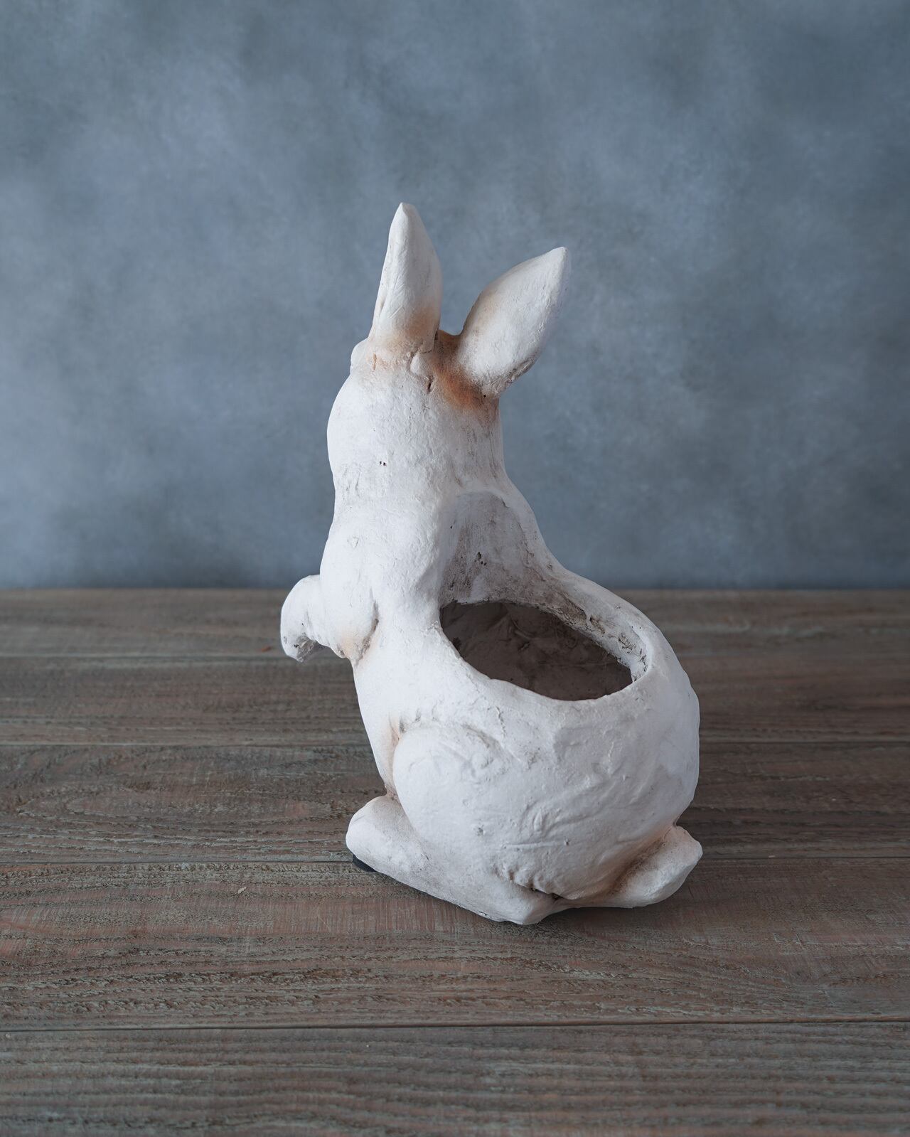 花苗が植え込める「鉢」になっている、ウサギの置物(底穴あり)。 底穴が空いているので、お水あげも通常の鉢と同じです。 □サイズ:w25×d16×h28cm 植え込み部分:φ9cm×深さ10cm (※3号サイズがすっぽり入ります) □カラー:薄いグレージュ □底穴あり □素材:FRP樹脂と石膏を混ぜたもの (持ち上げた体感:重くはないです)