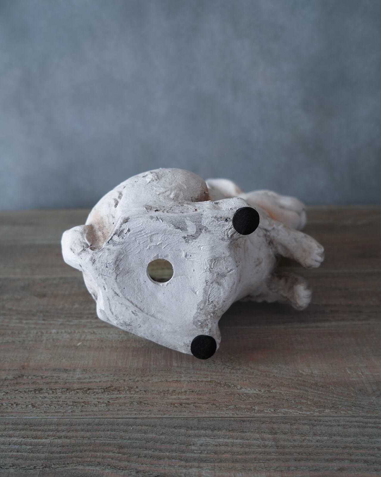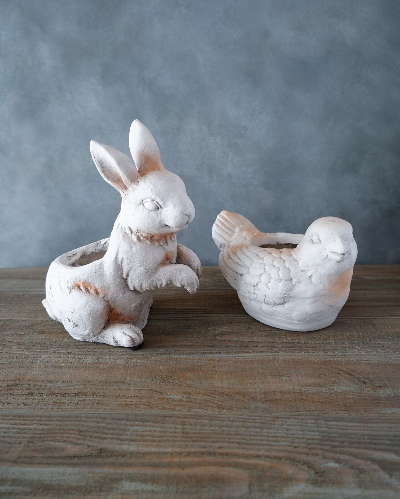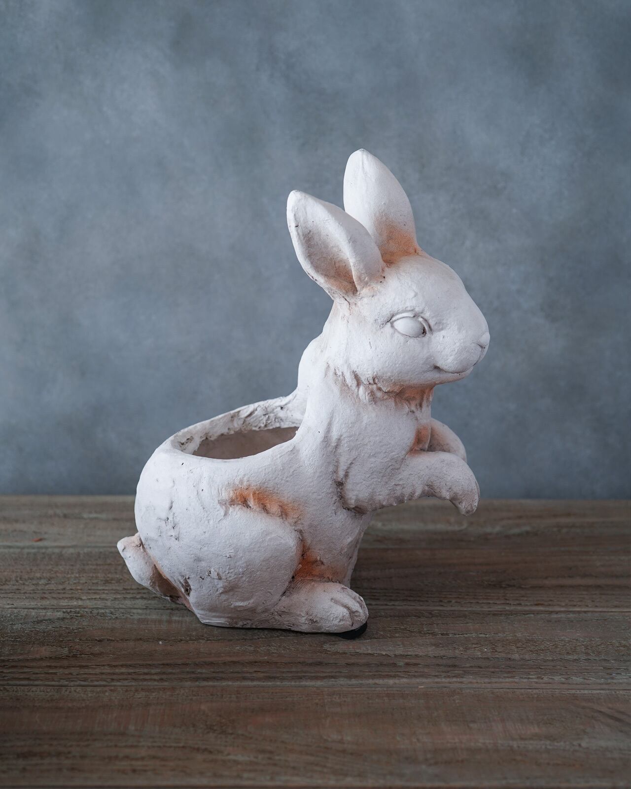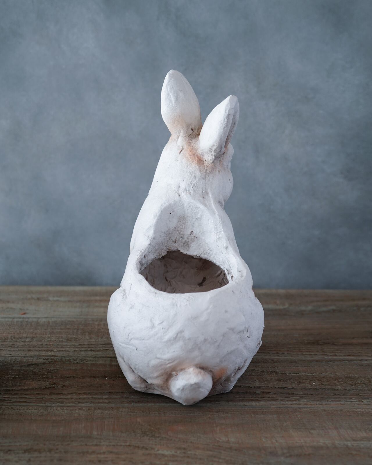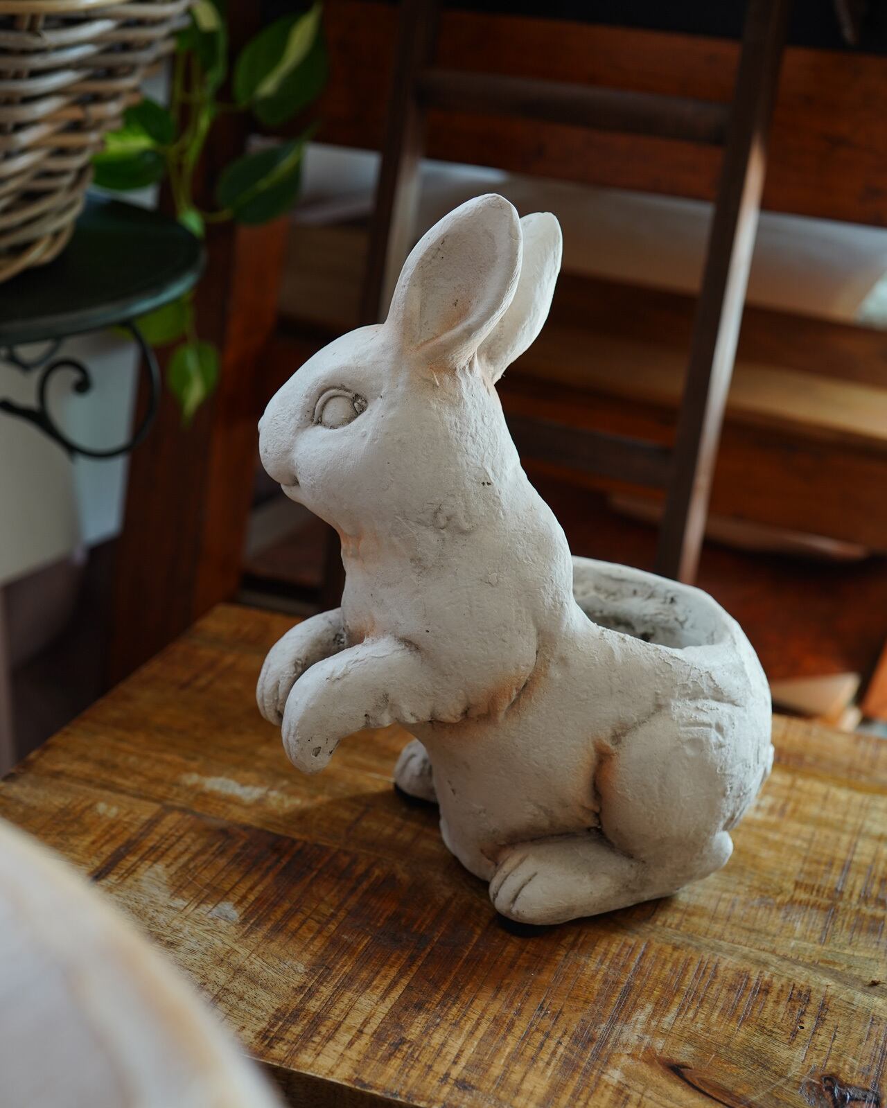 花苗が植え込める「鉢」になっている、ウサギの置物(底穴あり)。 底穴が空いているので、お水あげも通常の鉢と同じです。 □サイズ:w25×d16×h28cm 植え込み部分:φ9cm×深さ10cm (※3号サイズがすっぽり入ります) □カラー:薄いグレージュ □底穴あり □素材:FRP樹脂と石膏を混ぜたもの (持ち上げた体感:重くはないです)