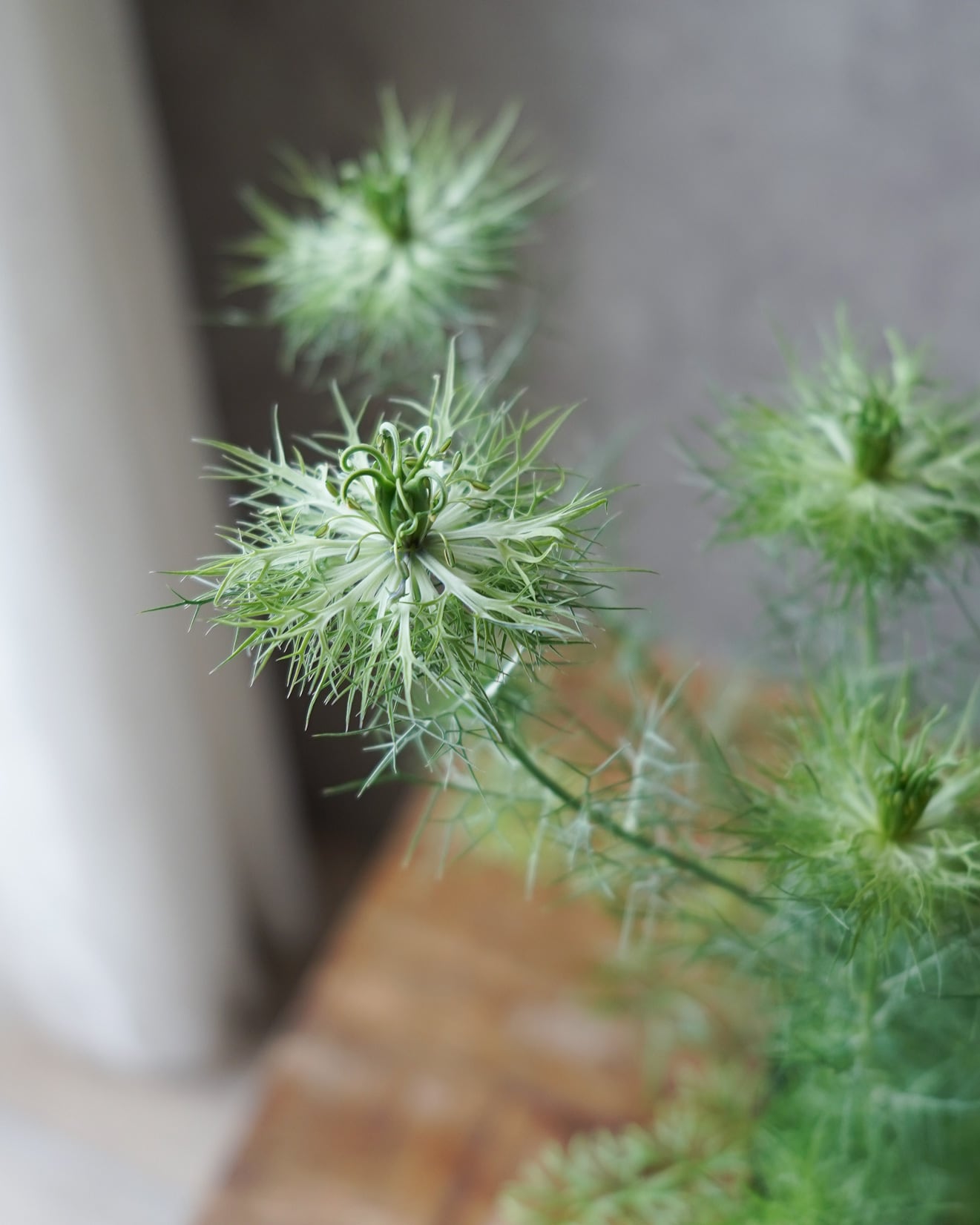 トゲトゲのガクが薄緑色の花弁に見えるオシャレなお花です。