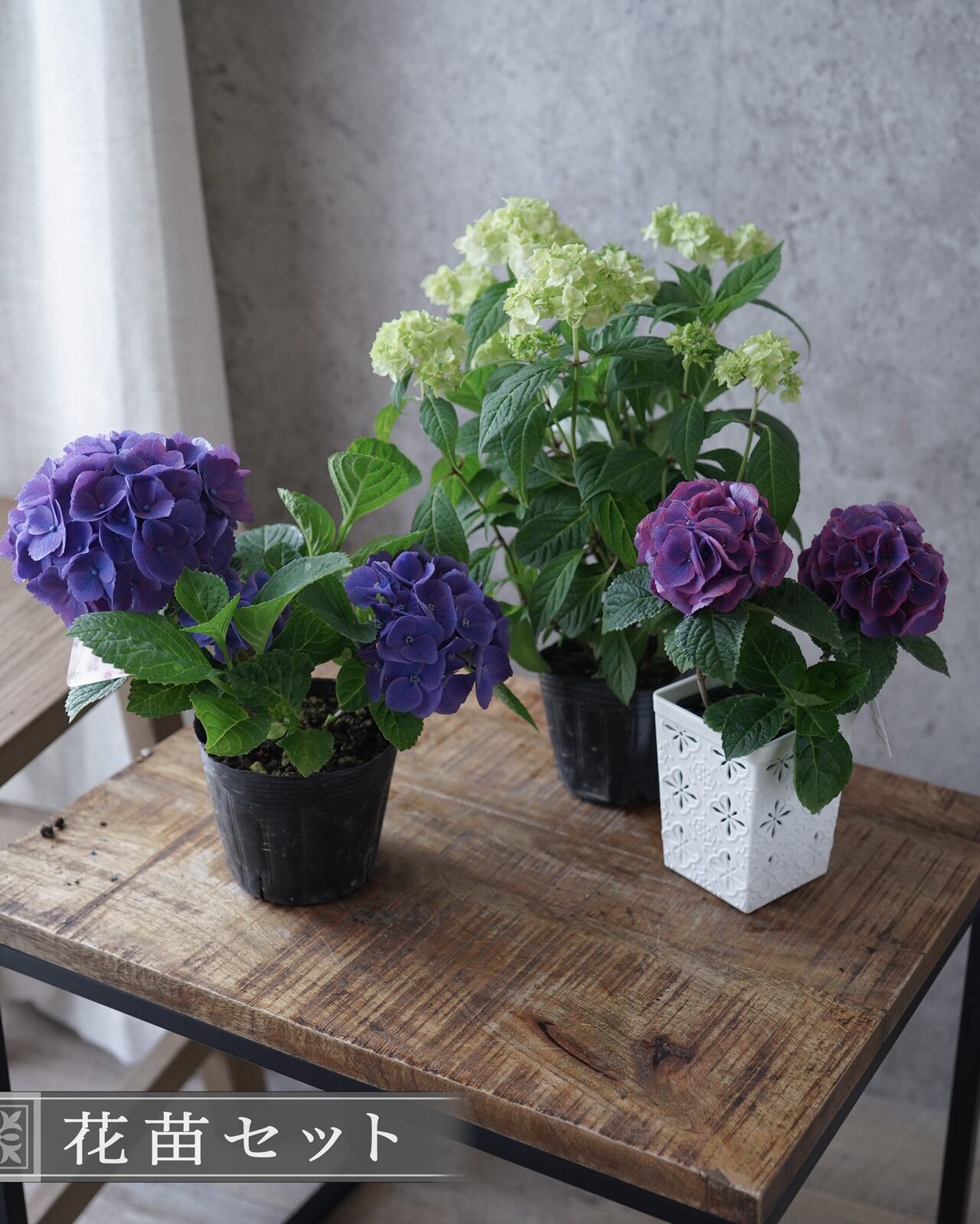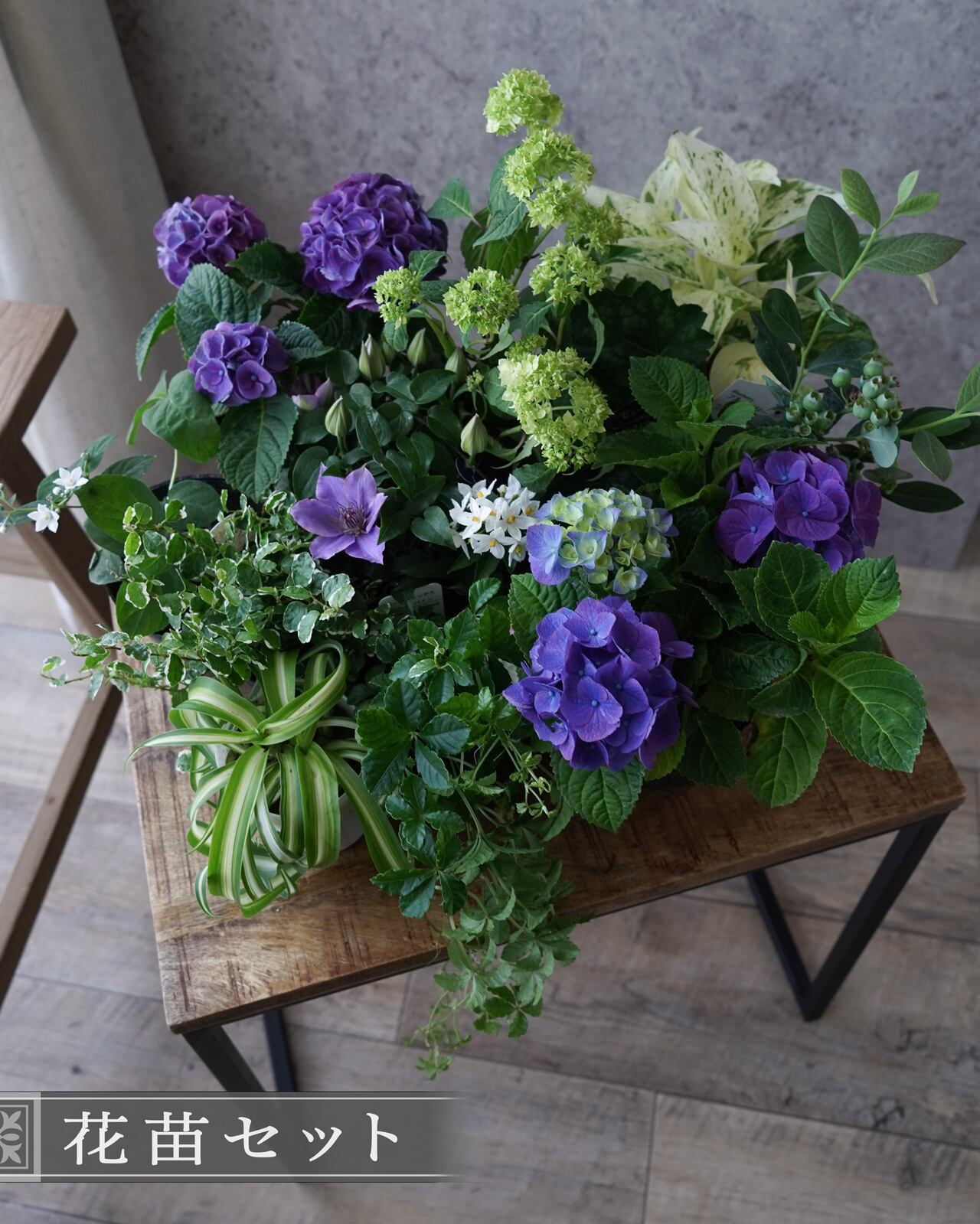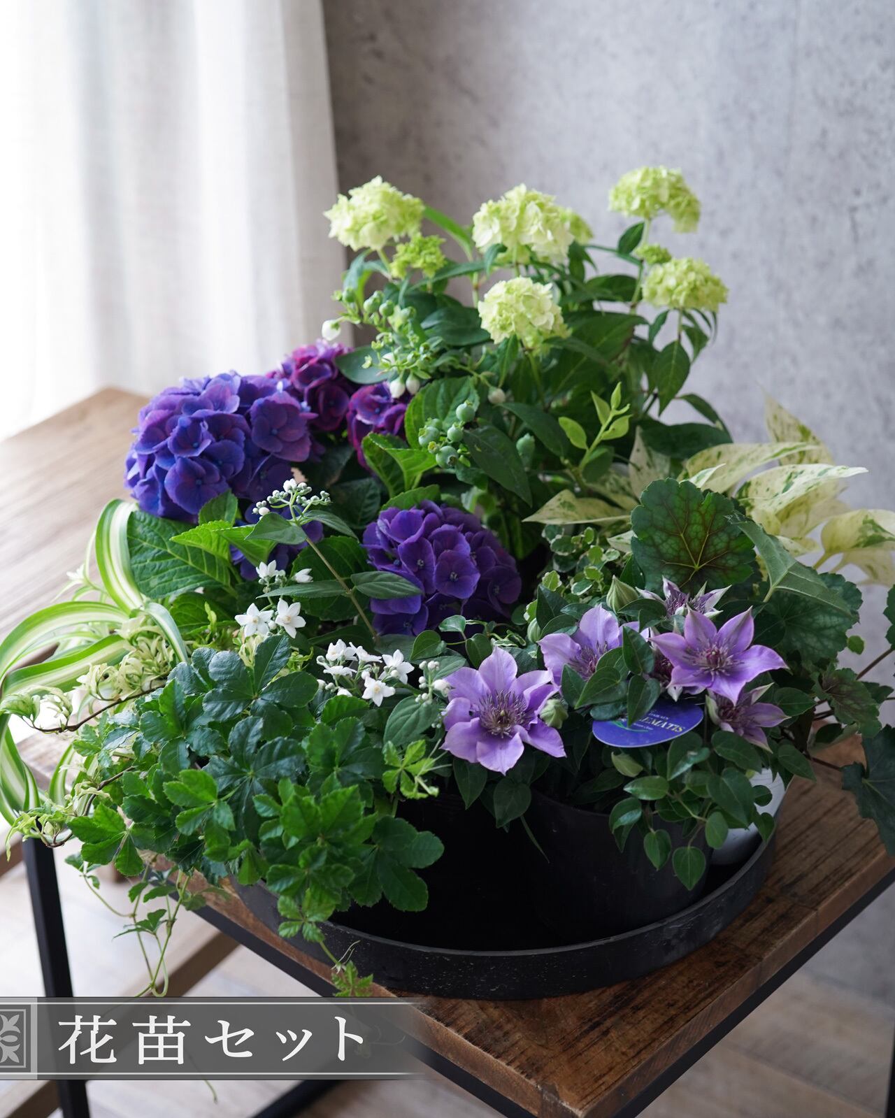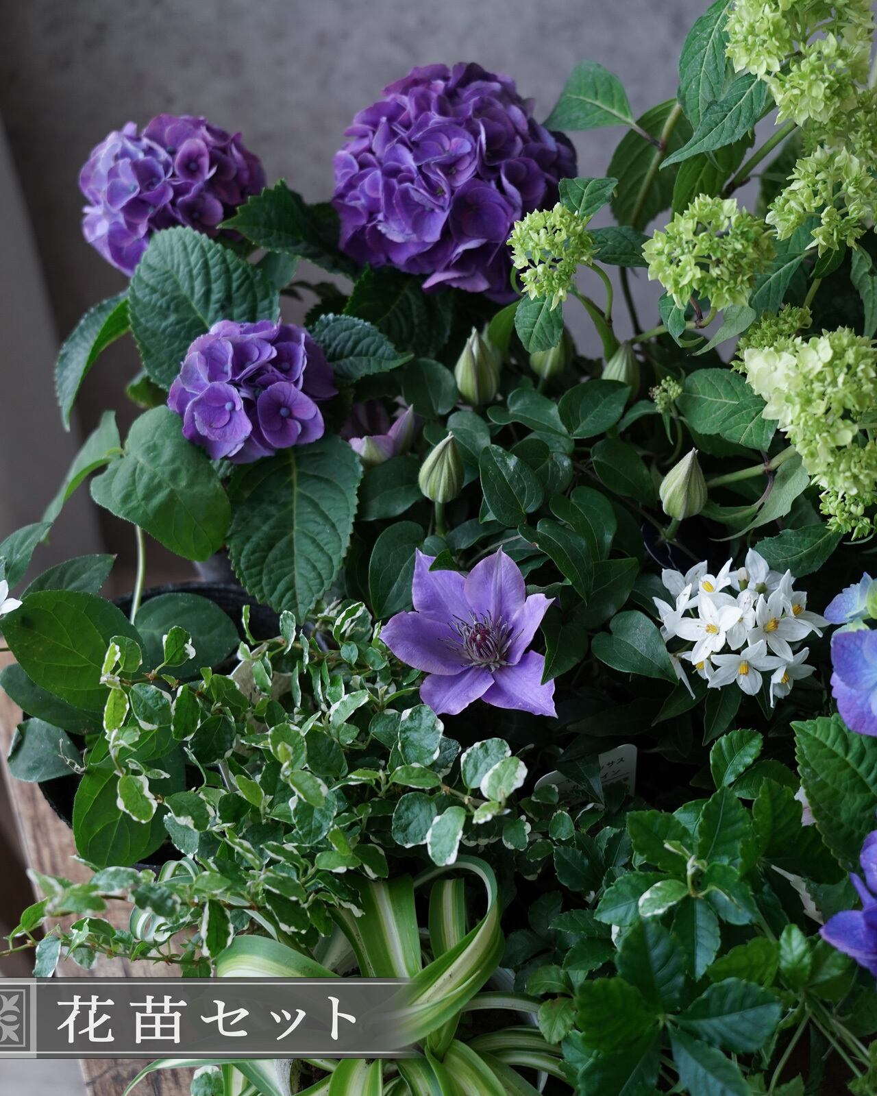 ▲アジサイの色味は、タイニーガールとキッチンアジサイ、どちらか一方が青、もう一方が紫をお入れします。