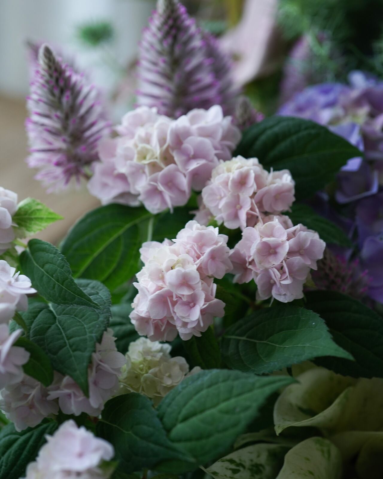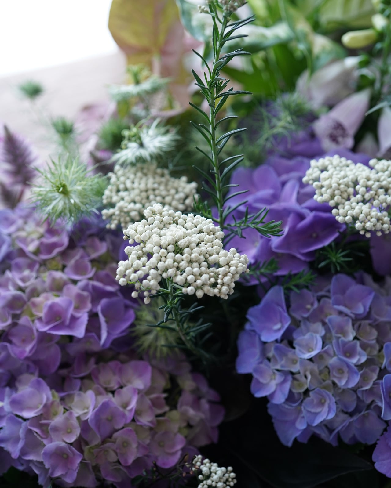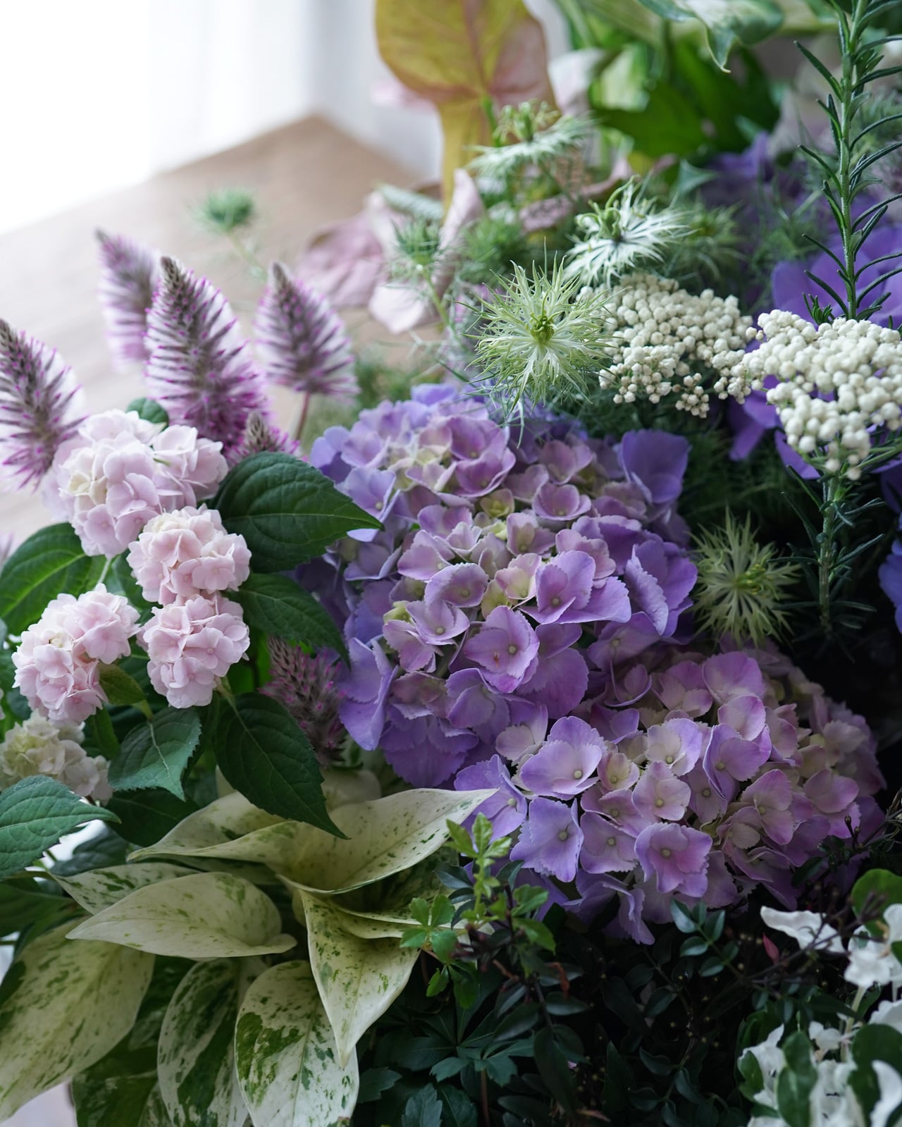 ラベンダー色のアジサイをメインに、薄ピンク〜ラベンダー色で揃えました。