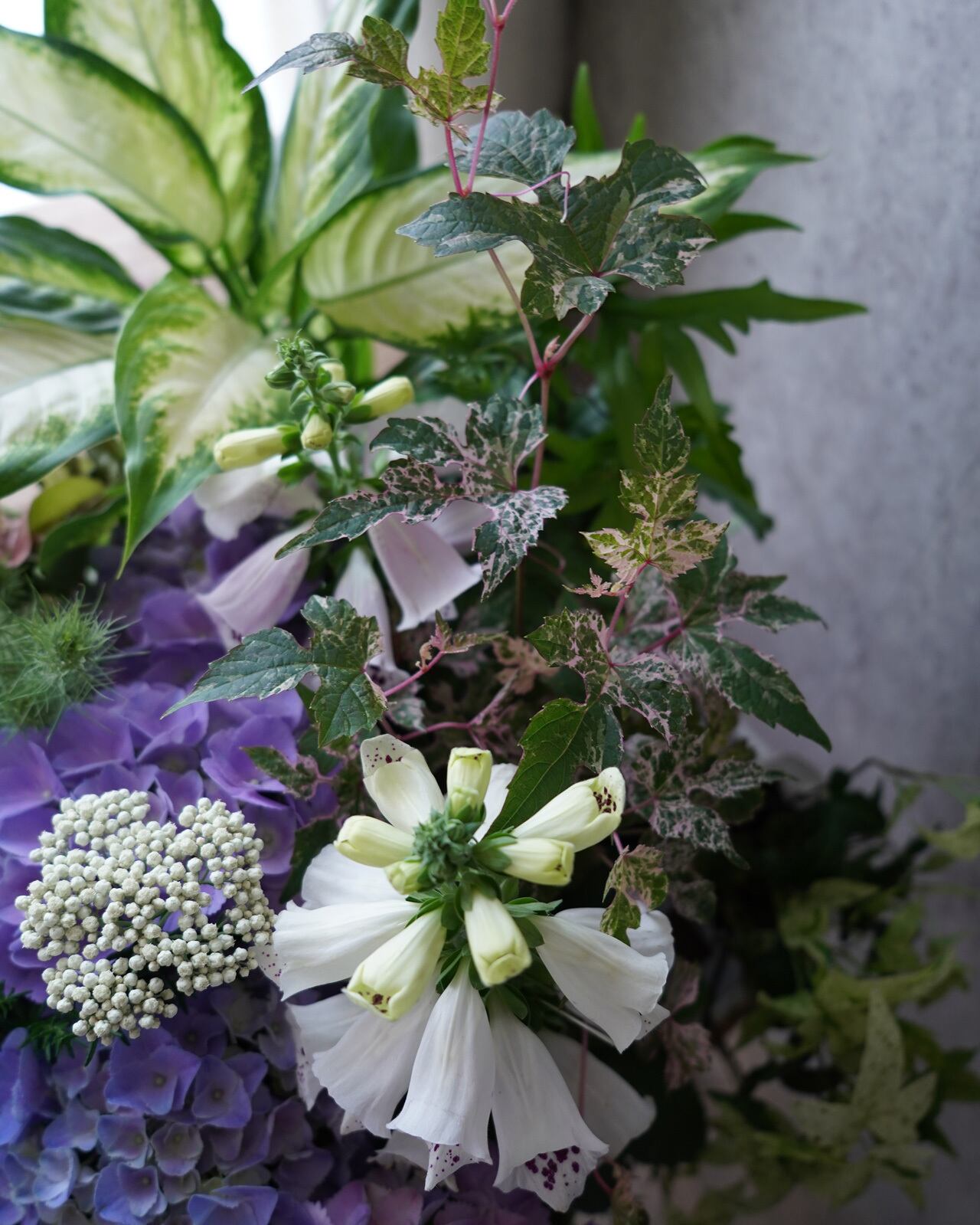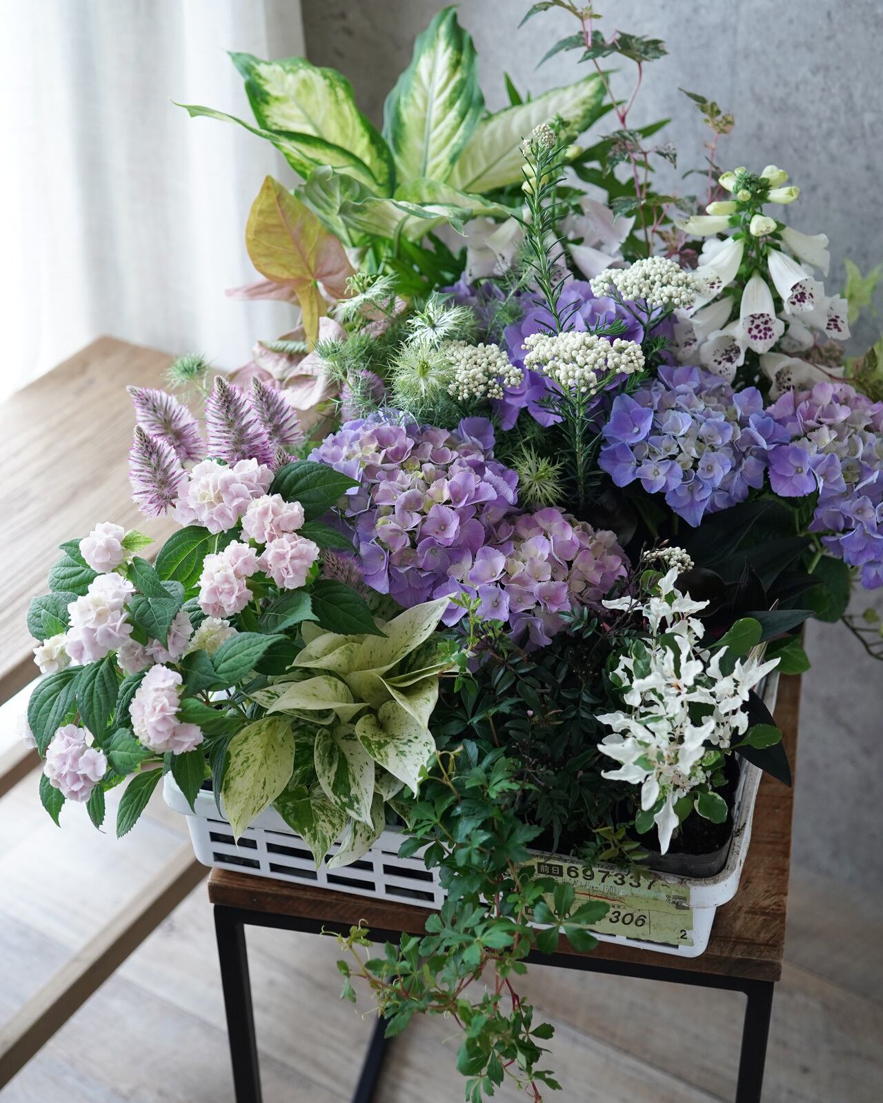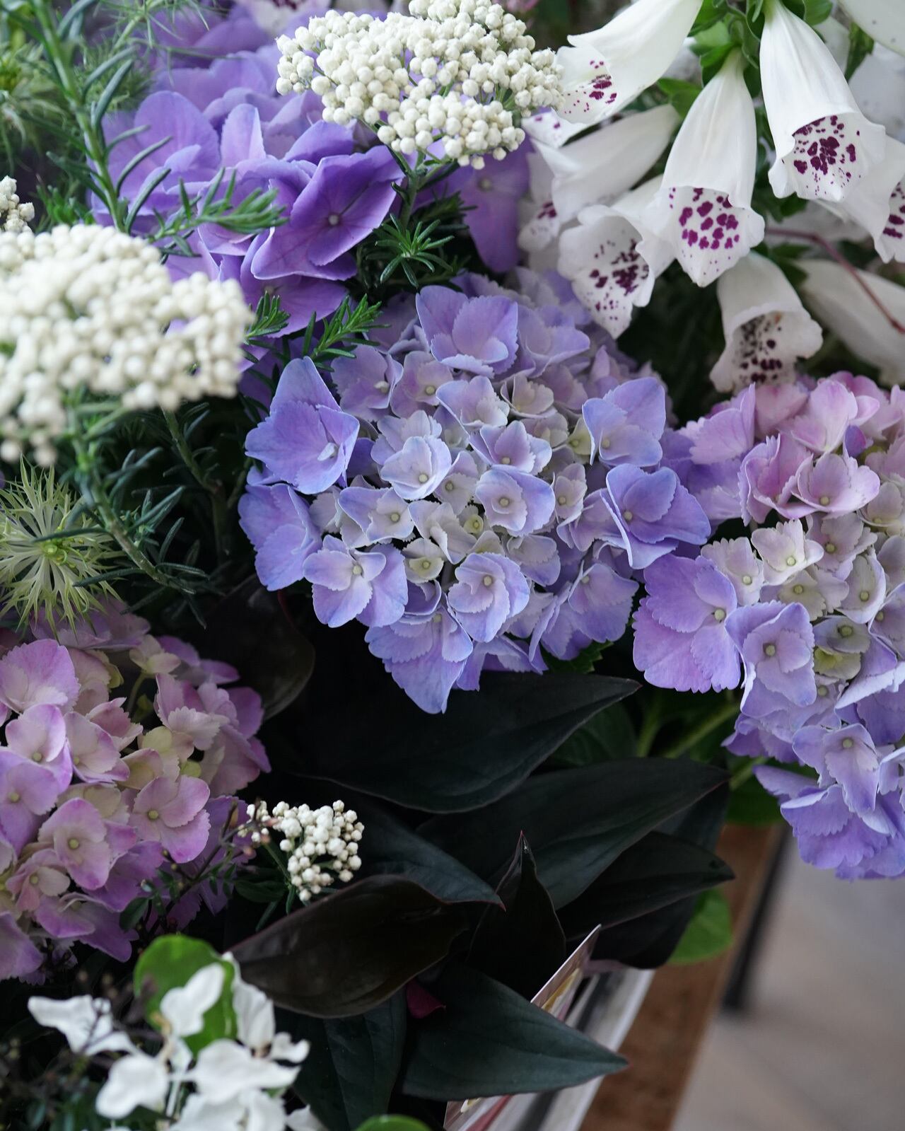 ラベンダー色のアジサイをメインに、薄ピンク〜ラベンダー色で揃えました。