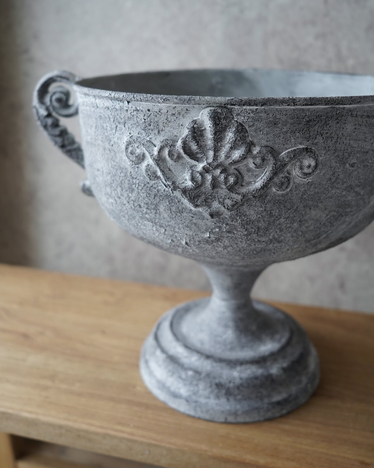 間口が広く、植えやすいデザインの取手付きカップ形の植木鉢。