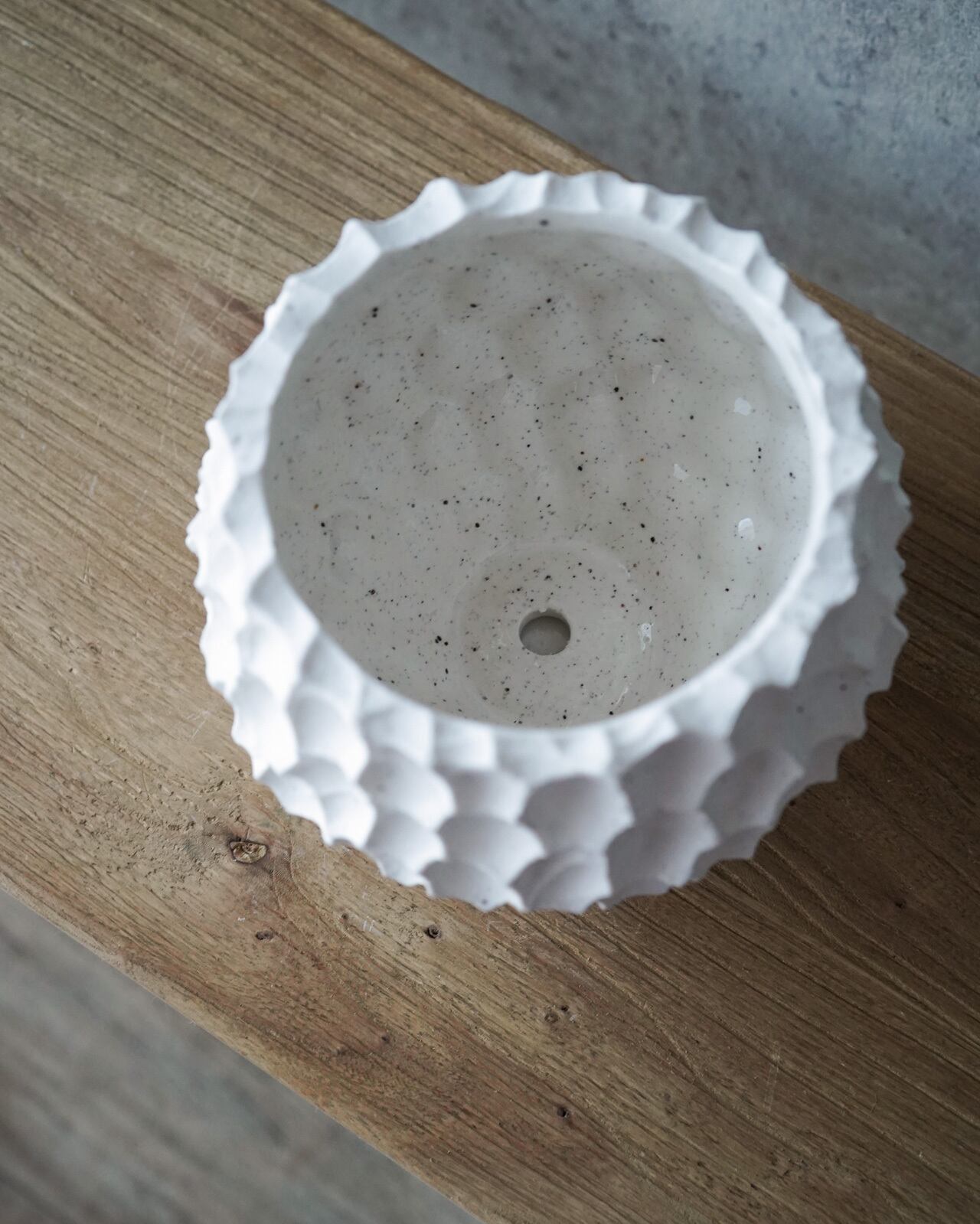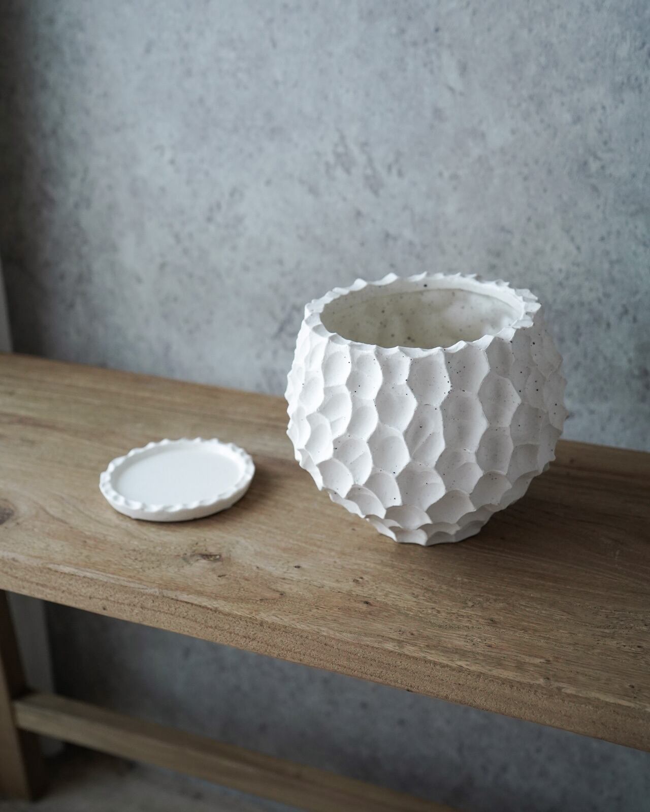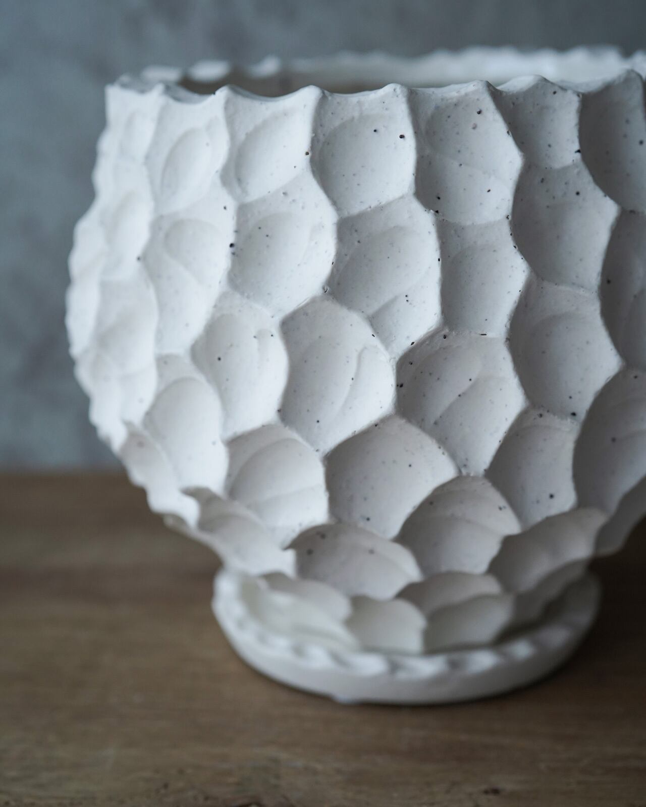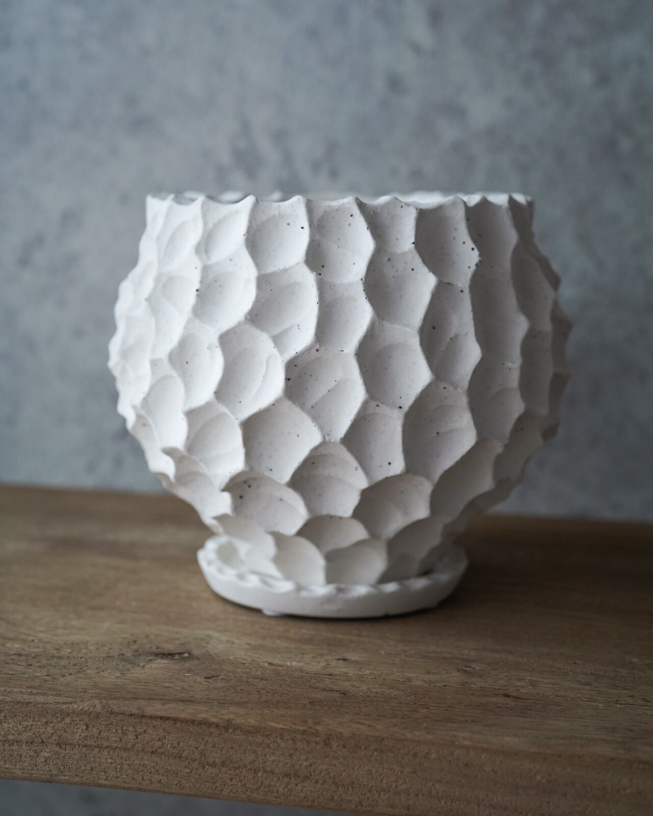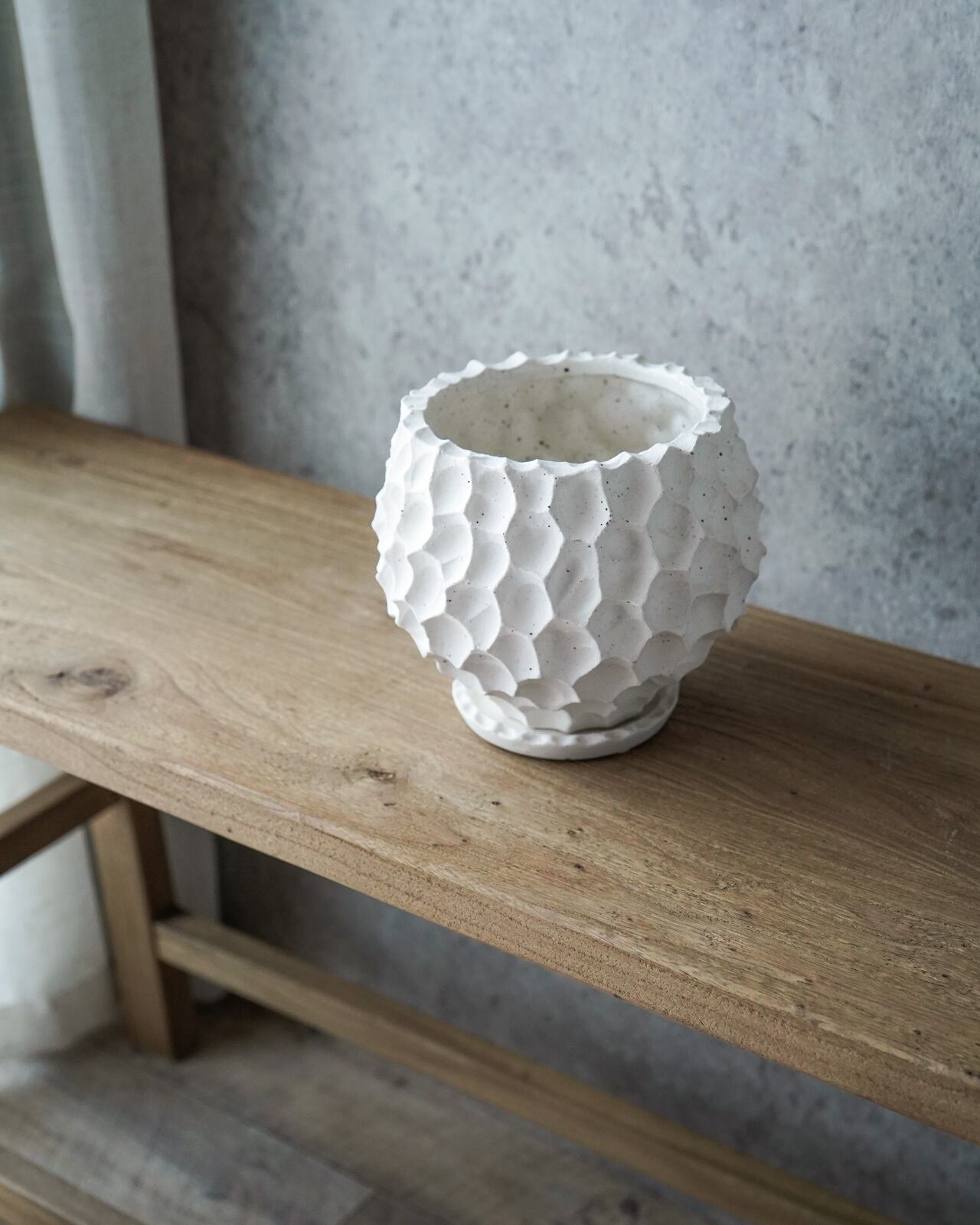 個性的なカービングが魅力的な鉢。 鉢カバー。