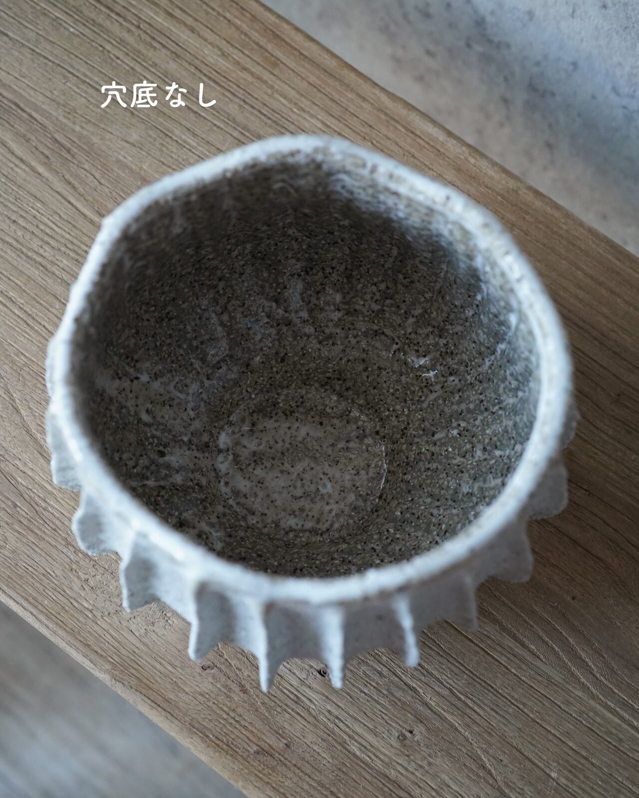 ザラザラとした粒子の粗い陶土に口元を縁取る艶やかな 白い釉薬がアクセントに なっています。