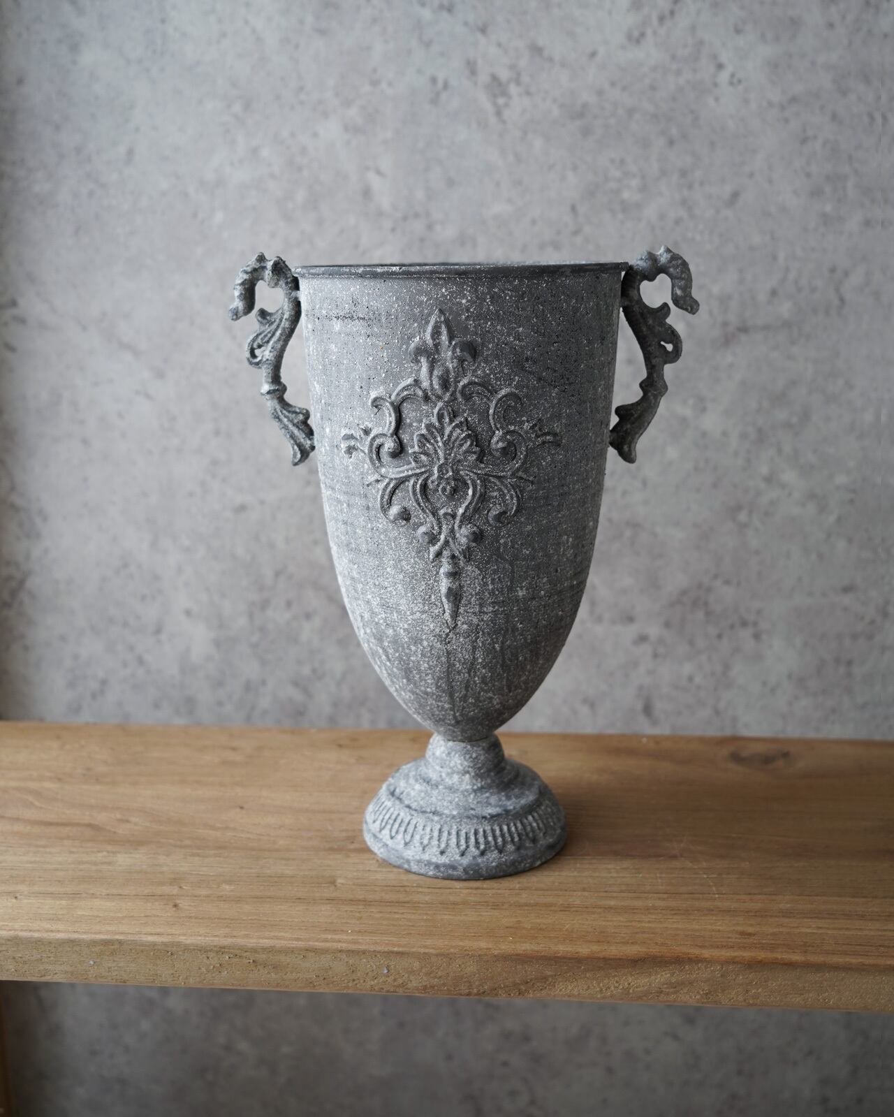 ーーーーーーーーー □サイズ:φ24cm × H31cm (間口:16.5cm) □カラー:グレー □素材:ブリキ 表面シャビー加工 □底穴:あり ーーーーーーーーーーー