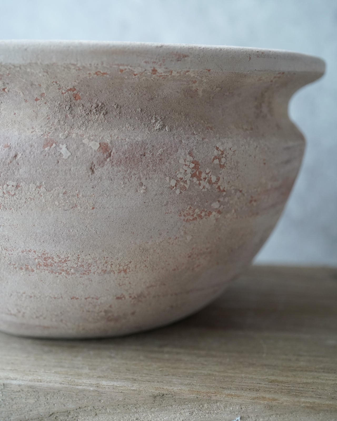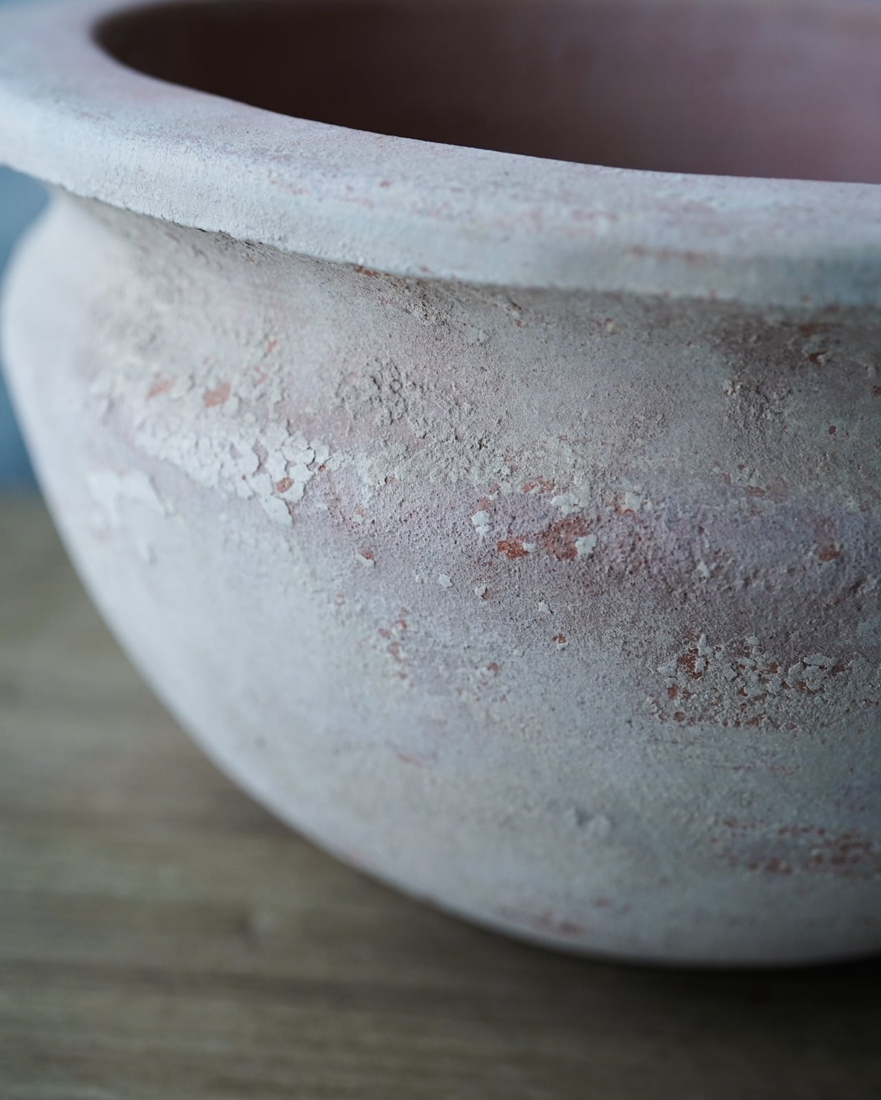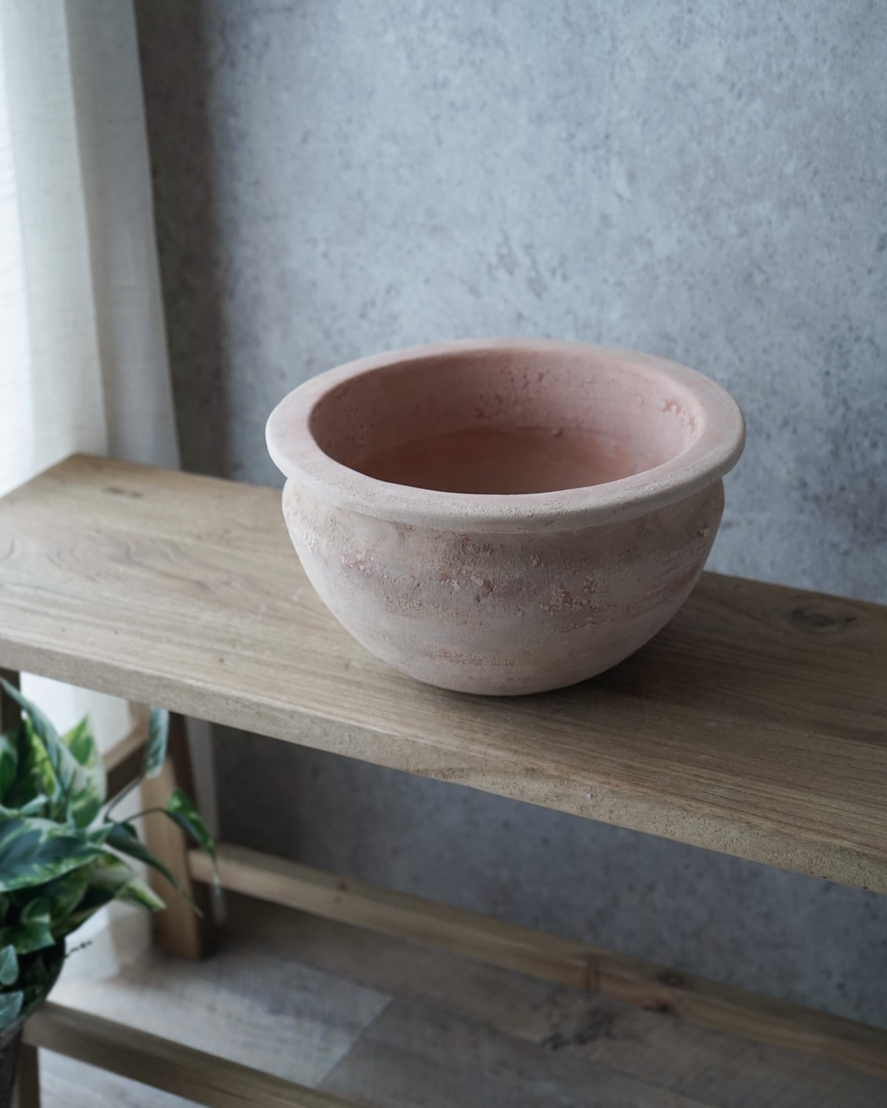 表面の天然の色むらが美しい、肉厚のテラコッタ鉢。