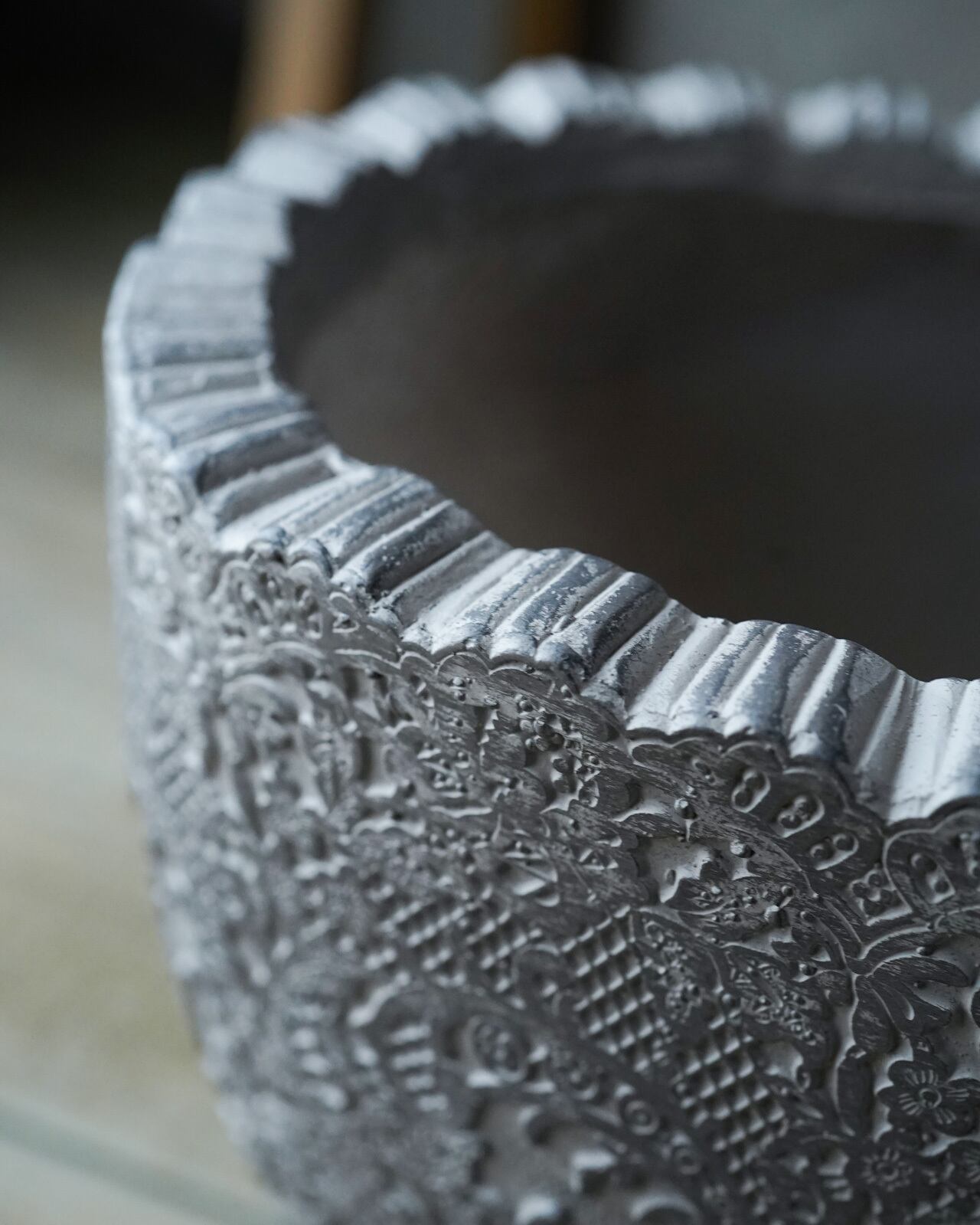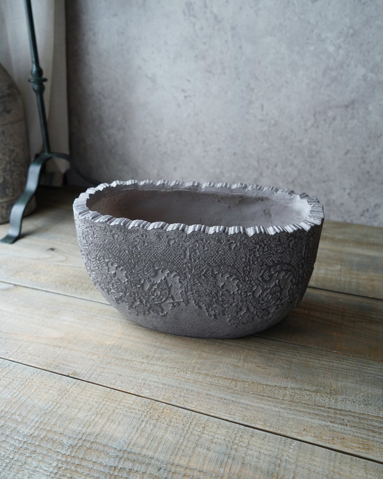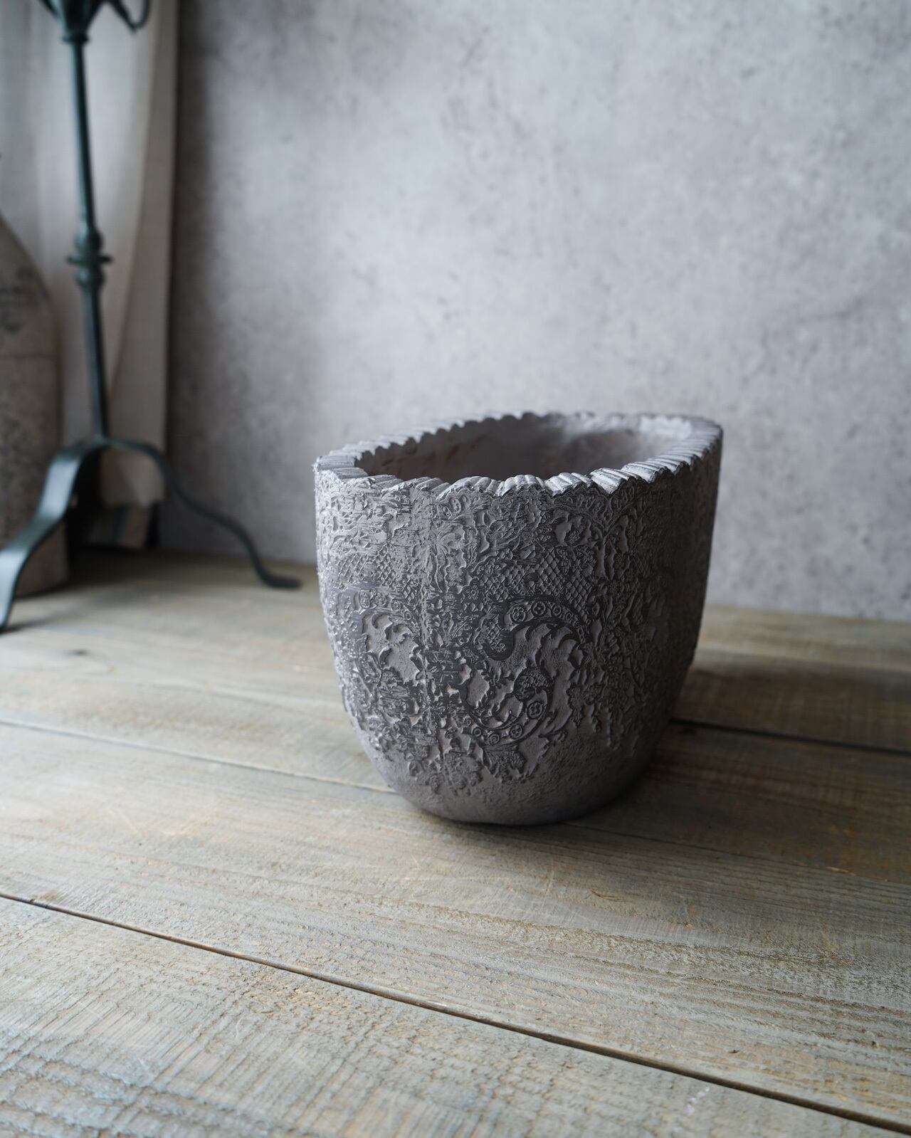 鉢間口のレース状の切れ込みがオシャレなシリンダー型の植木鉢です。