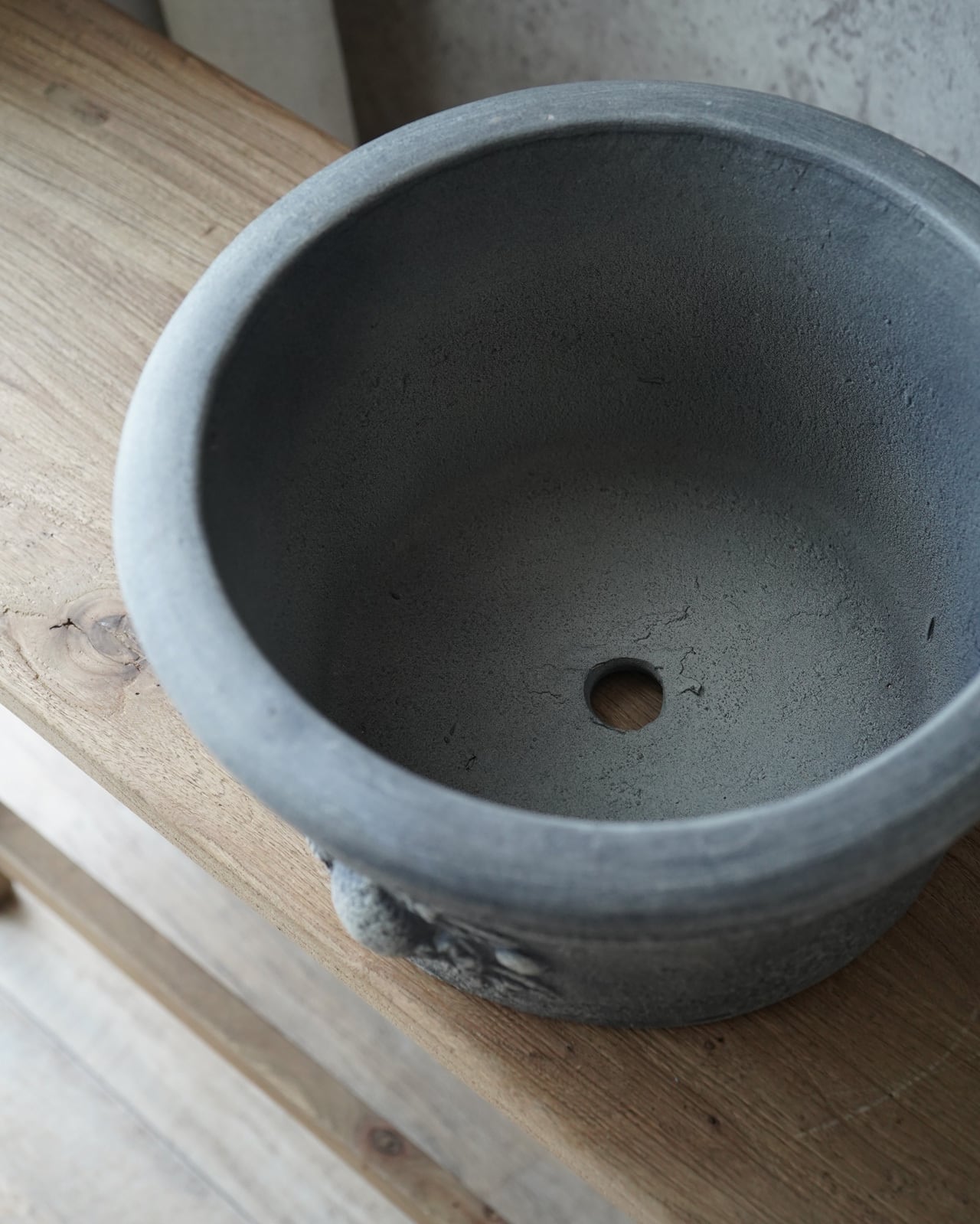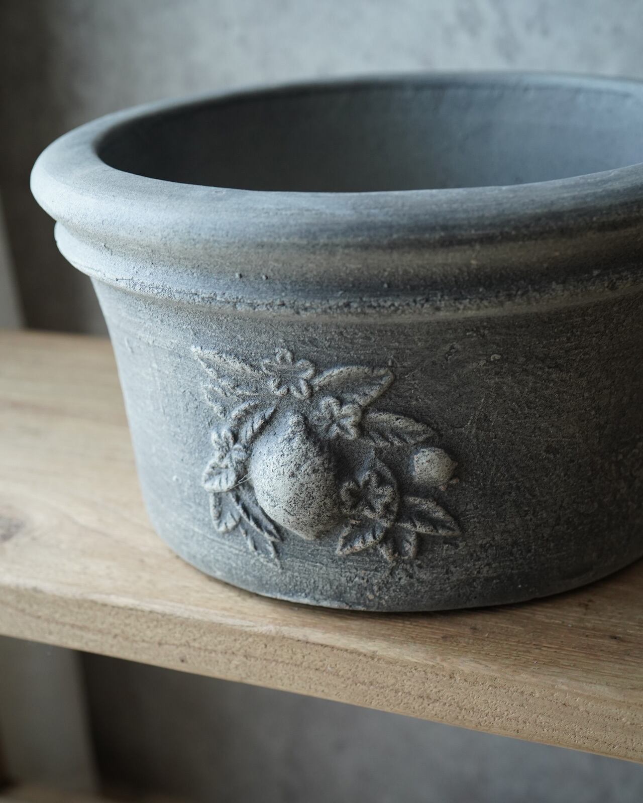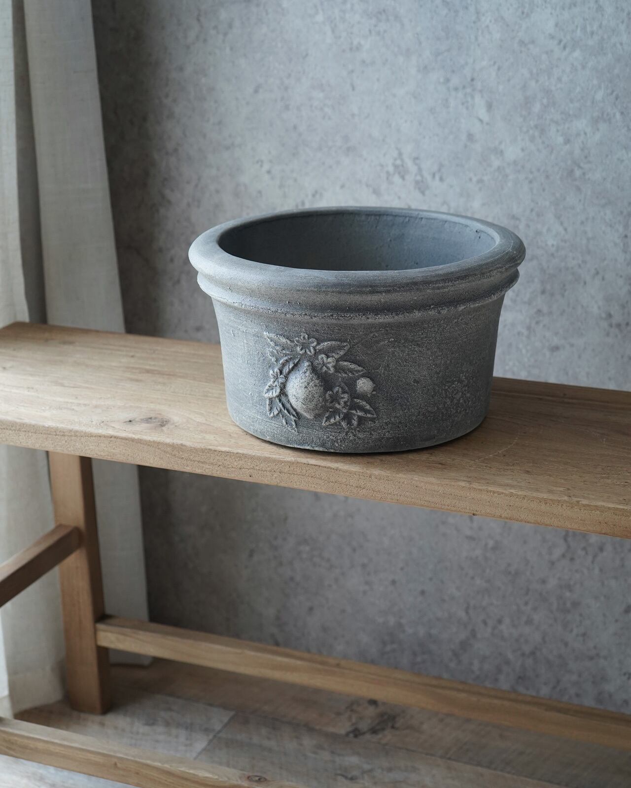 表面の色むらが美しい、肉厚のテラコッタ鉢。 間口が広いので植え込みやすい形状になっています。 ーーーーーーーーーーー □サイズ:Φ28.7×H15.4cm(内寸Φ23.3×H14.2cm) □色:グレー □底穴 有り ーーーーーーーーーーー (注意) テラコッタの特徴上、新品の状態は鉢から土の粉が出ます。 抱える時は衣服の汚れにご注意下さい。