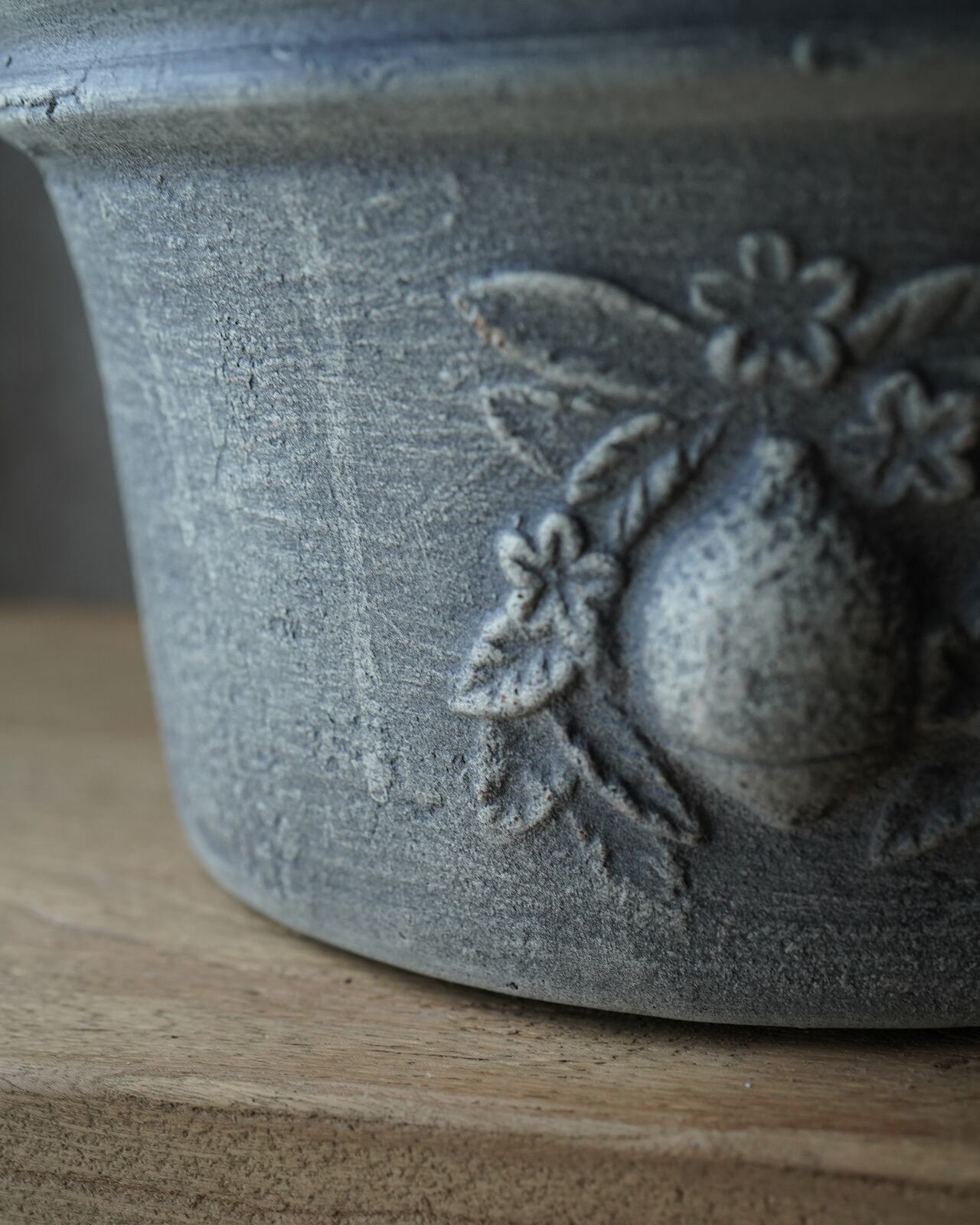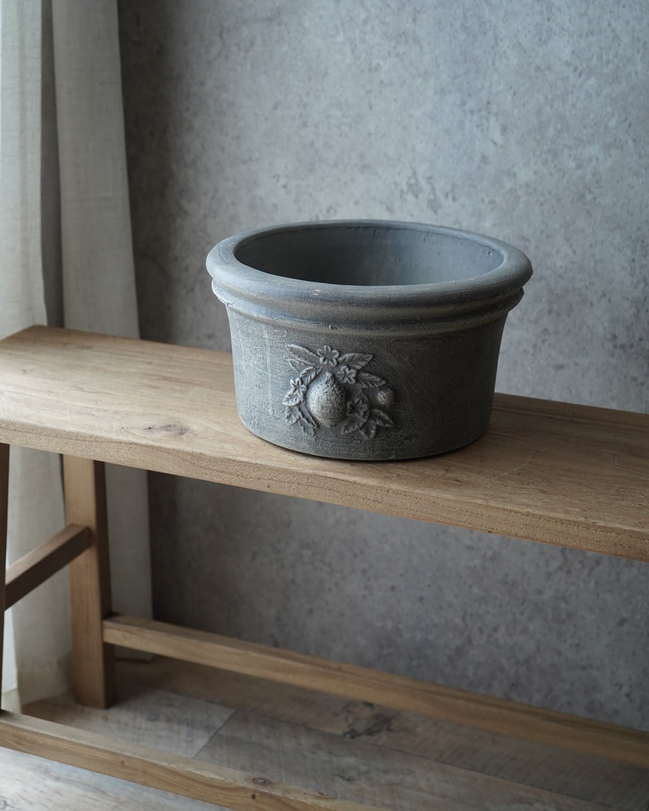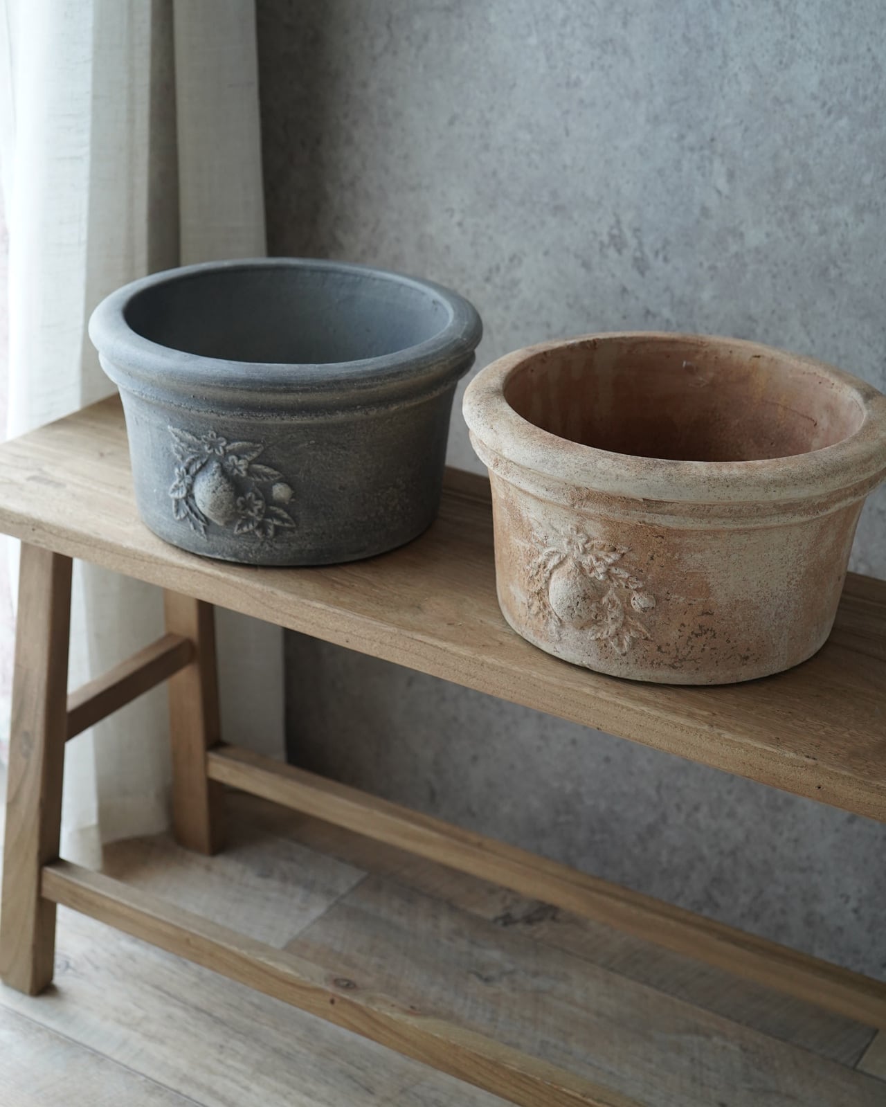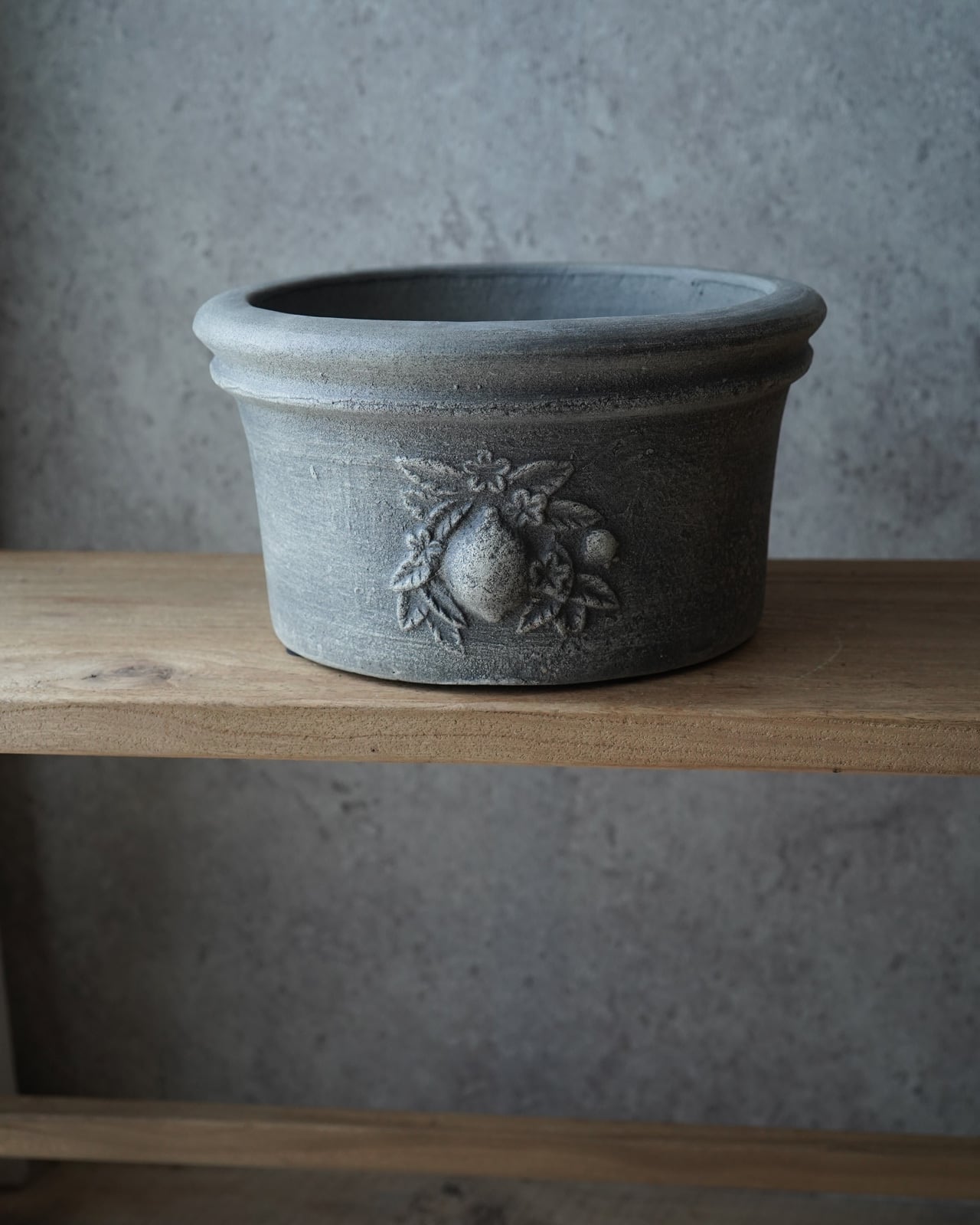表面の色むらが美しい、肉厚のテラコッタ鉢。 間口が広いので植え込みやすい形状になっています。 ーーーーーーーーーーー □サイズ:Φ28.7×H15.4cm(内寸Φ23.3×H14.2cm) □色:グレー □底穴 有り ーーーーーーーーーーー (注意) テラコッタの特徴上、新品の状態は鉢から土の粉が出ます。 抱える時は衣服の汚れにご注意下さい。